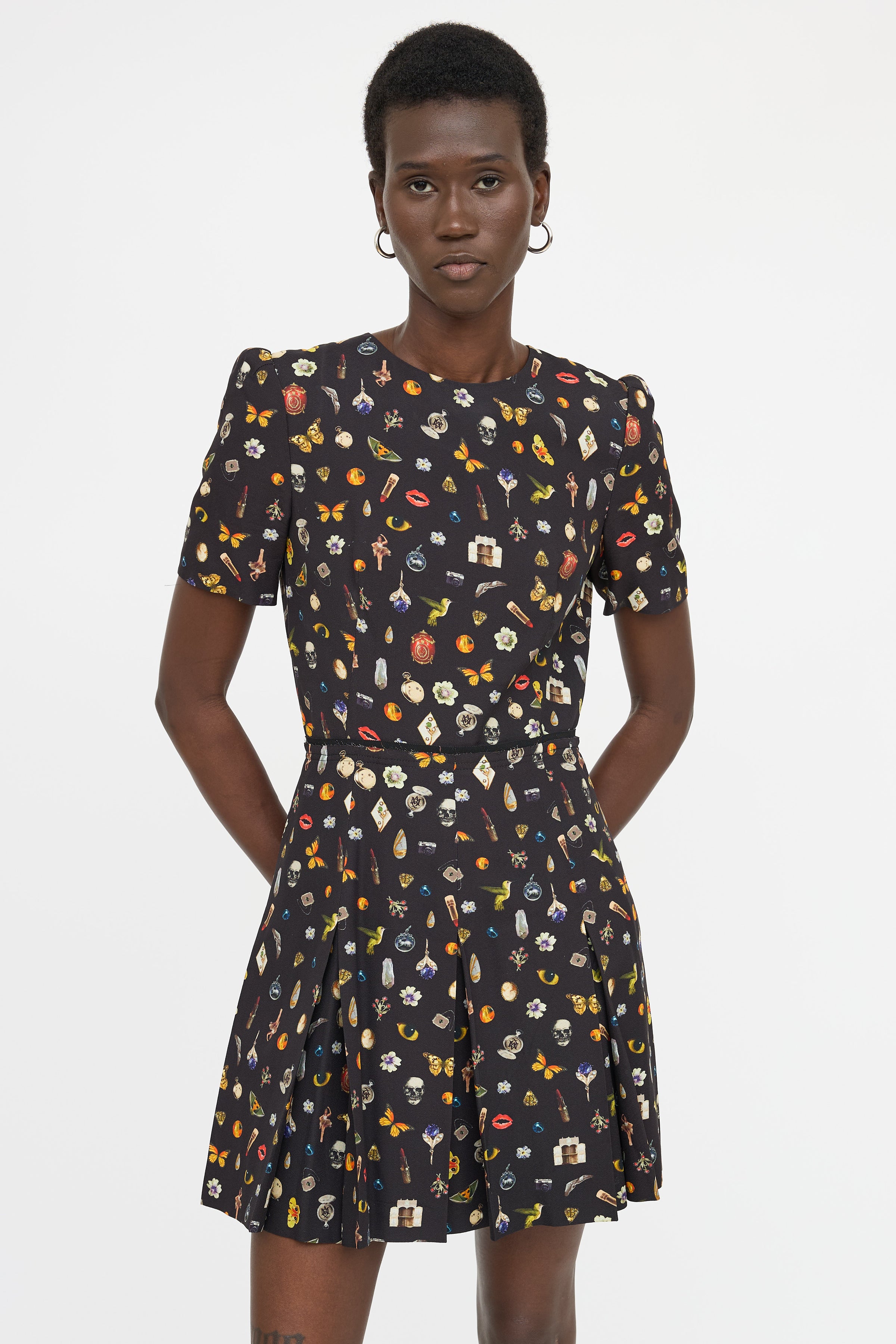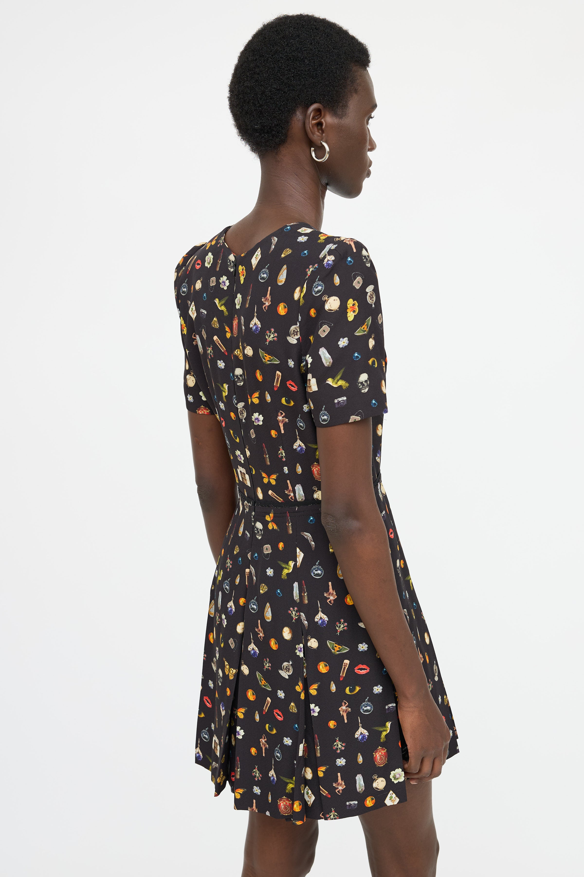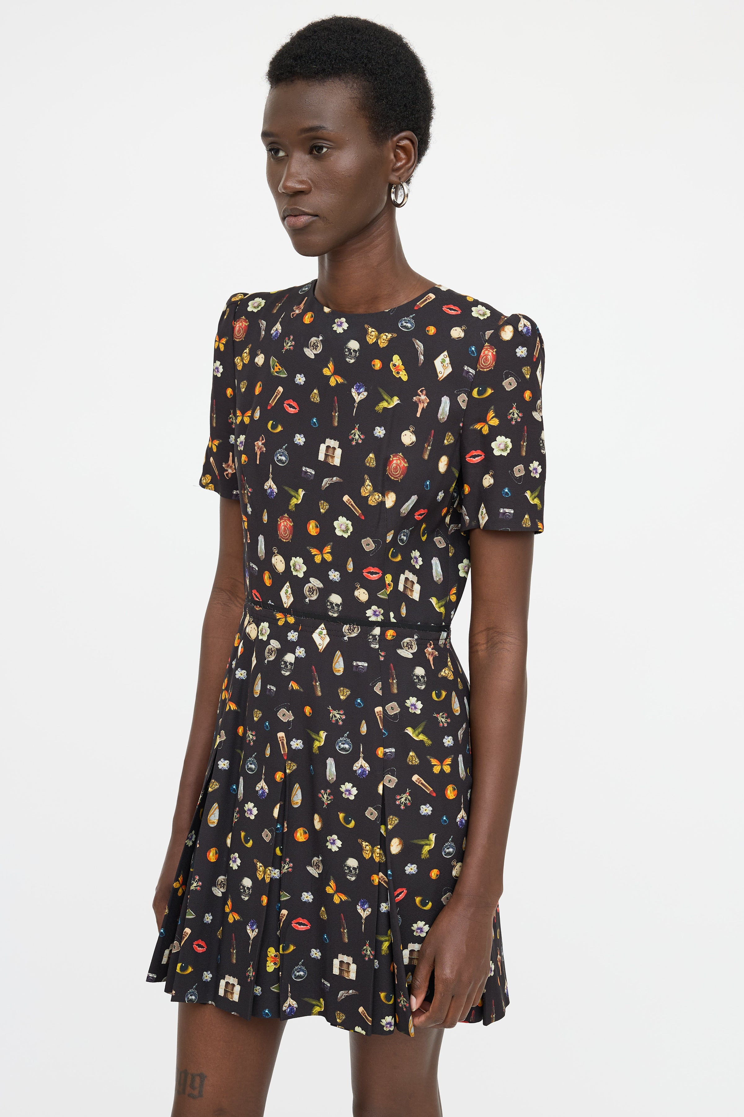 Pre-owned Alexander McQueen black short sleeve dress featuring patterned throughout, shoulder pads, round neckline, pleated skirt, and concealed zip at back. Lined.