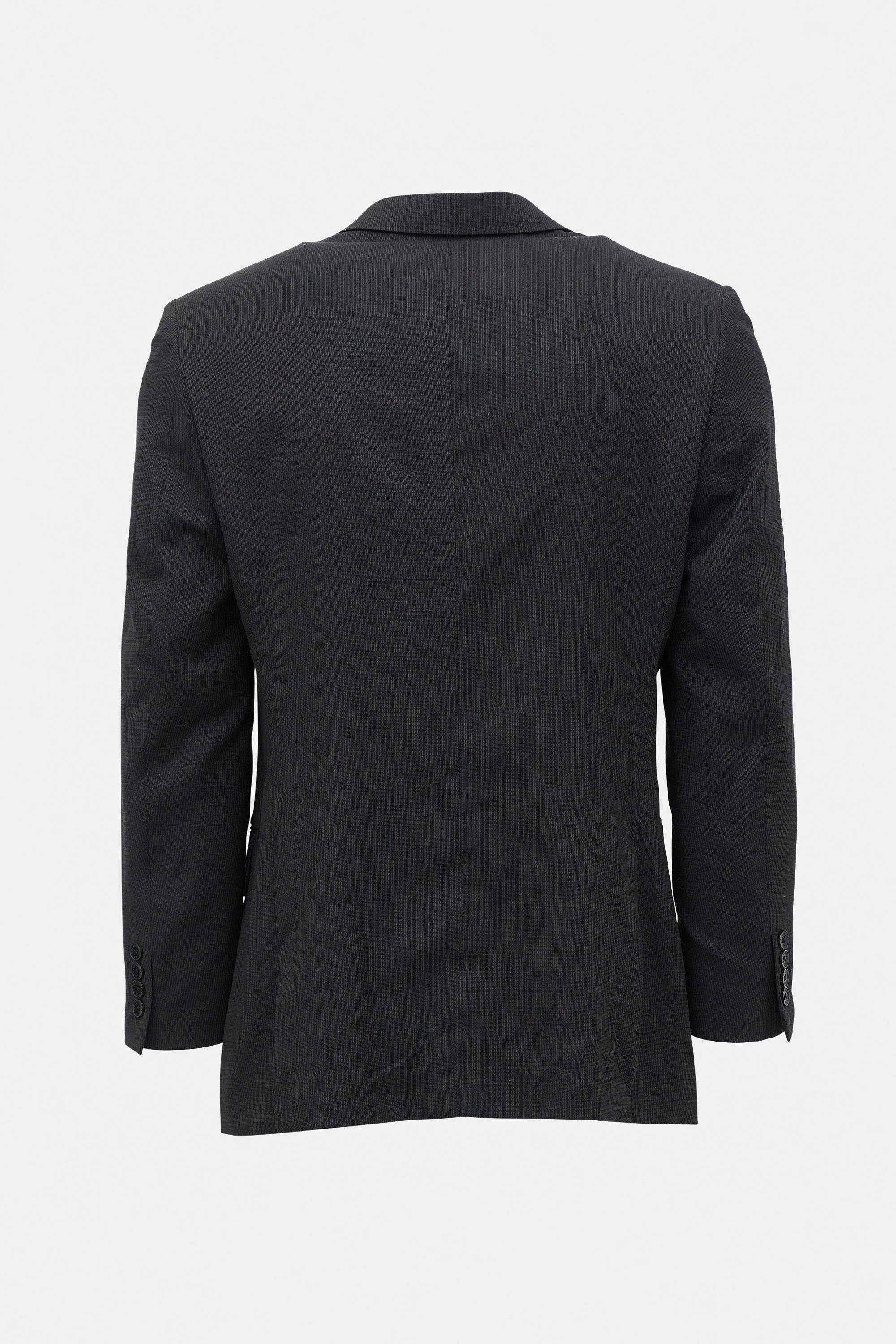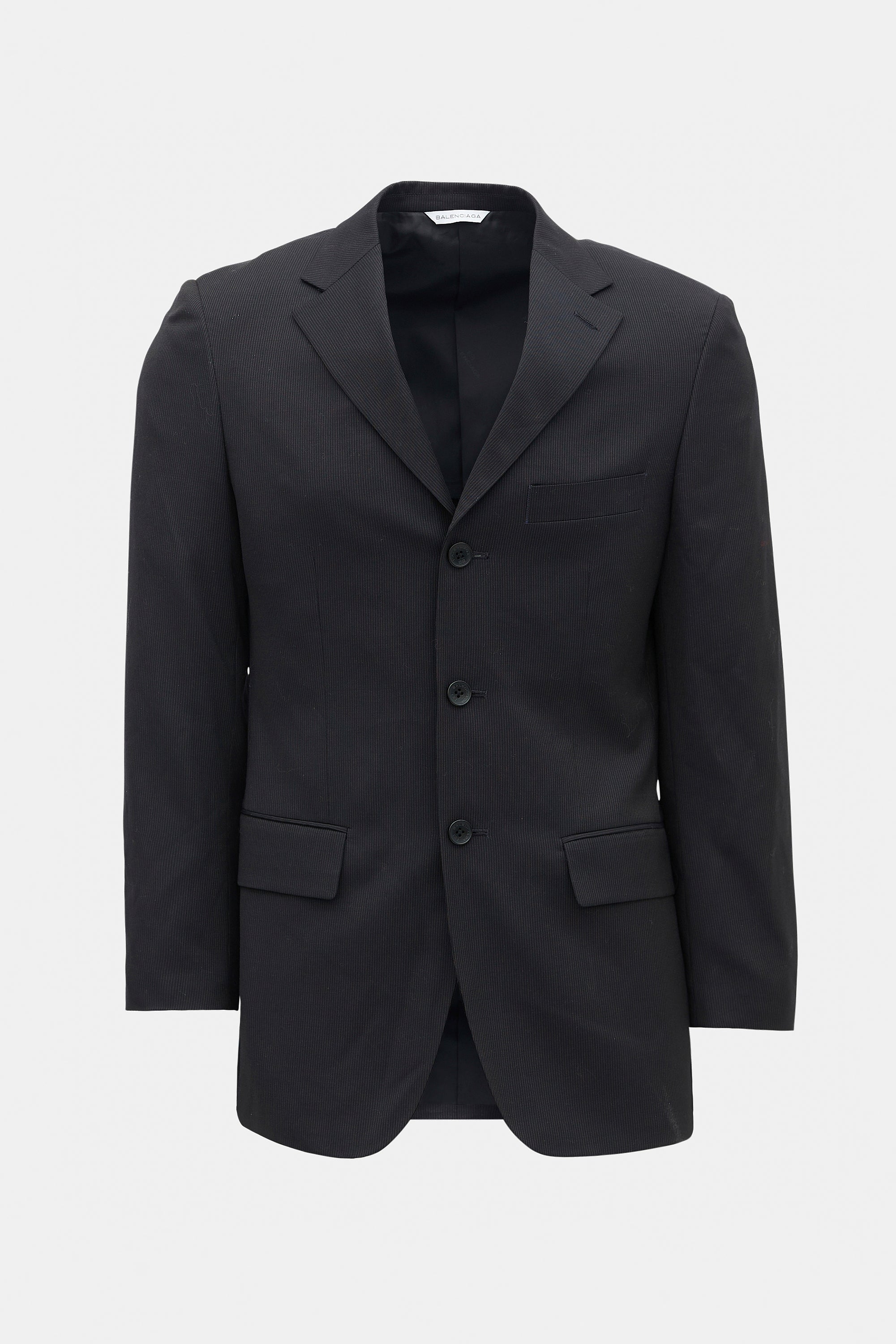 Pre-owned Balenciaga black wool blazer featuring pinstripe pattern, notched collar, button up front, three front pockets, three interior pockets, back double vent, padded shoulders, and buttoned cuffs. Partially lined.