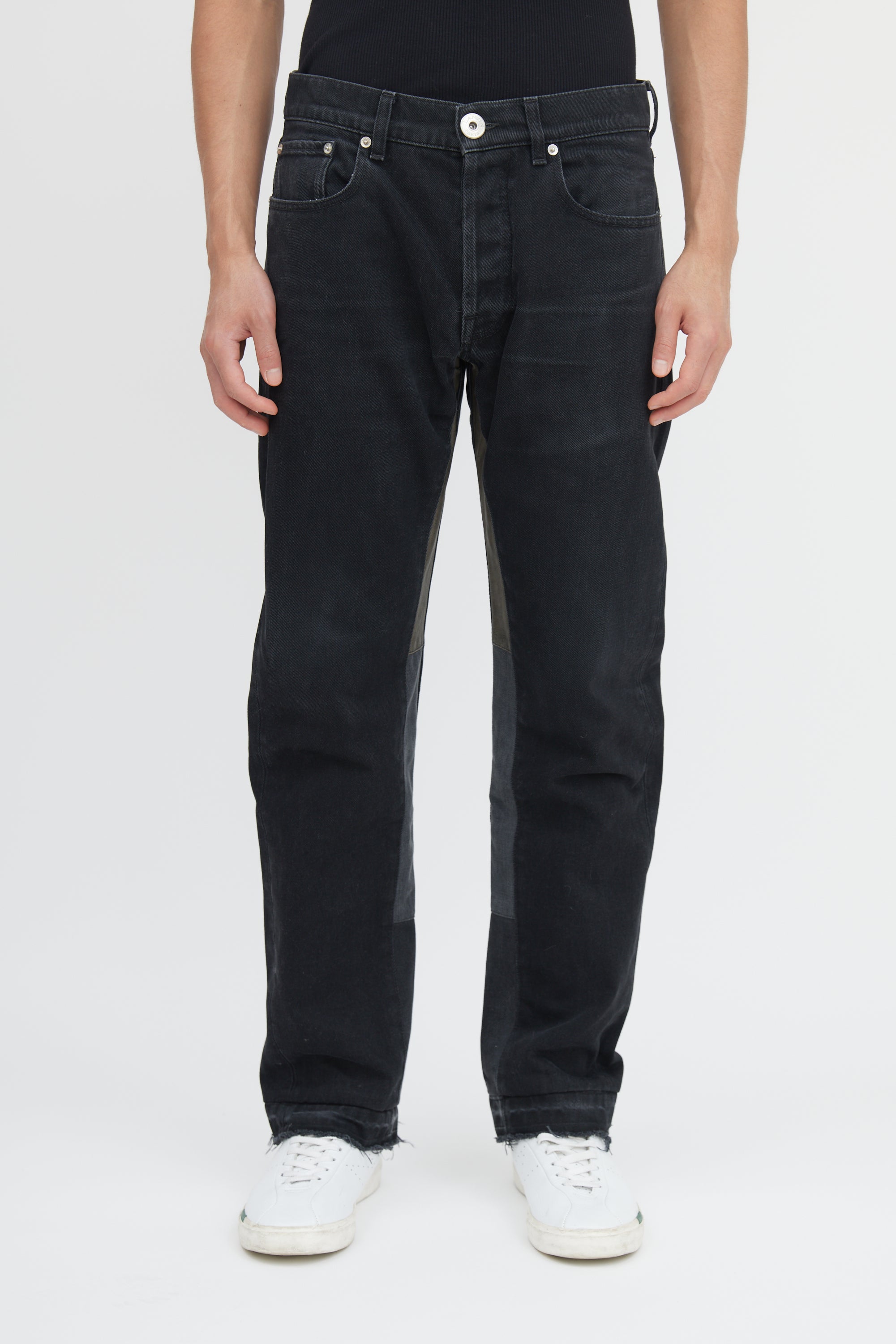 Pre-owned Lanvin X Gallery Dept. black jeans featuring straight leg, leather and denim panels throughout inseam and hem, five pocket styling, black leather and brown Jacron patches at back waist, button fly, and raw hem.