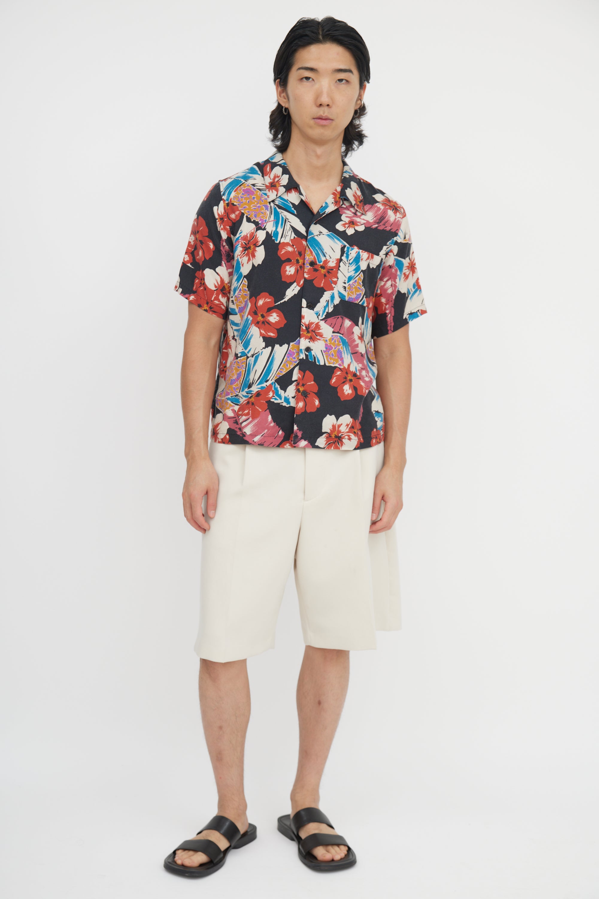 Pre-owned Saint Laurent black and multicolour shirt featuring Hawaiian floral print, convertible collar, button up front, and patch pocket at left chest.