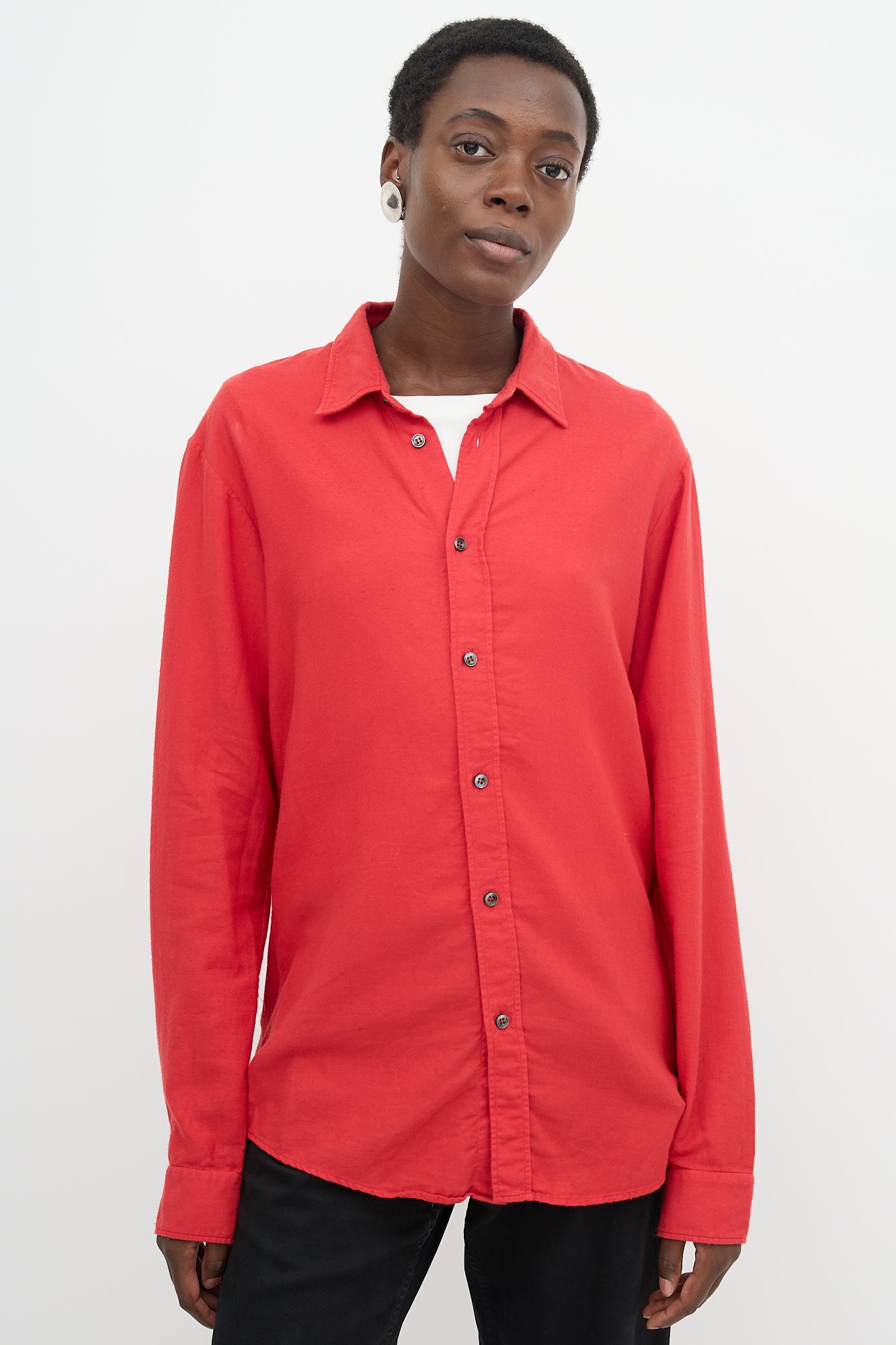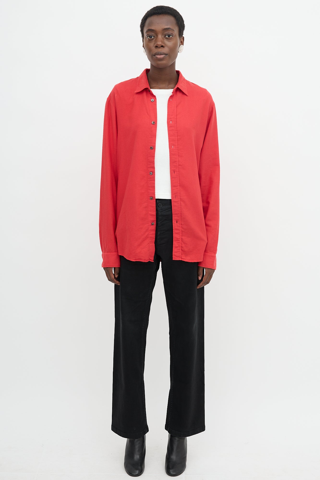 Pre-owned Maison Margiela red shirt featuring intentional distressing throughout, spread collar, button front, signature four white stitches at back collar, and button cuffs.