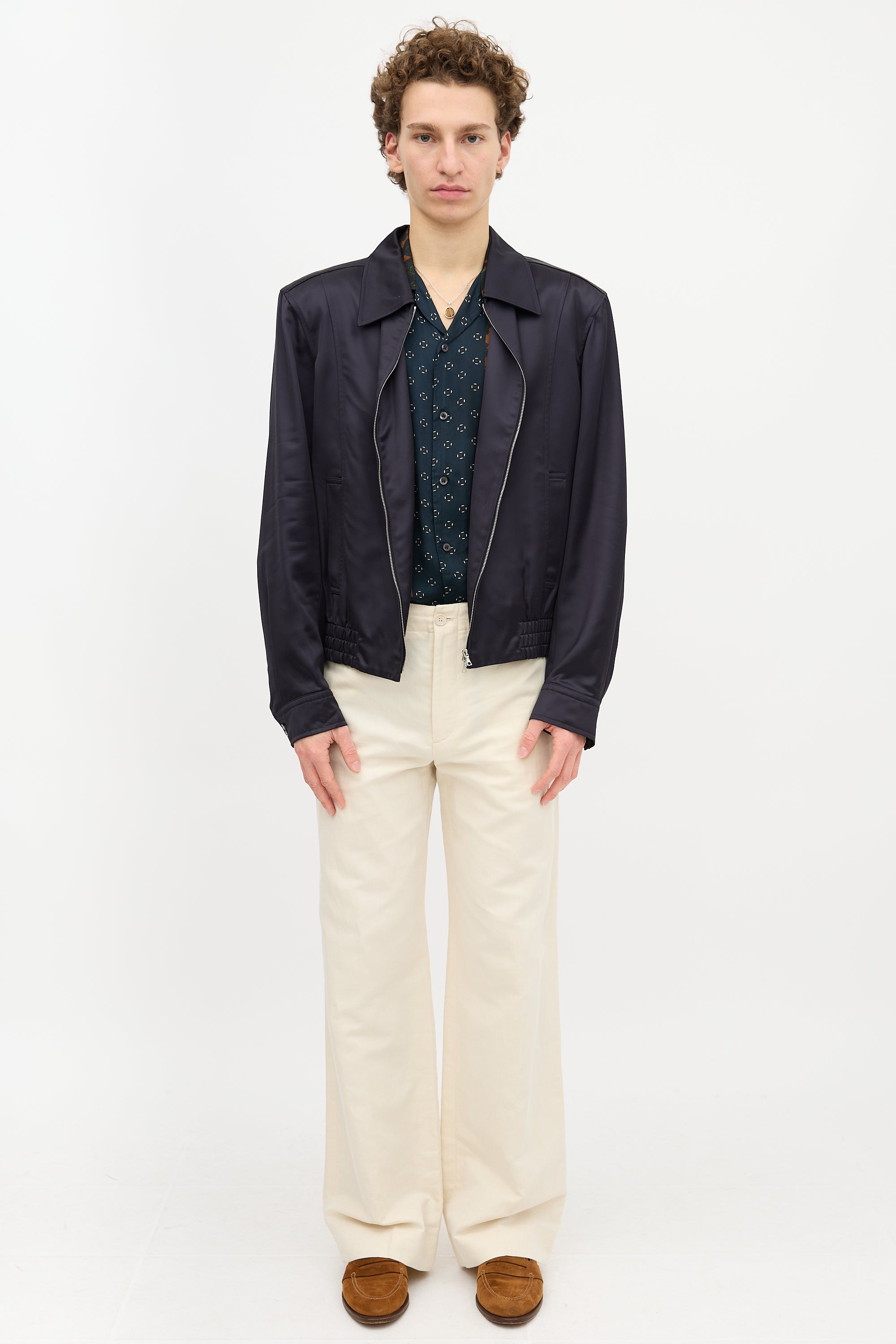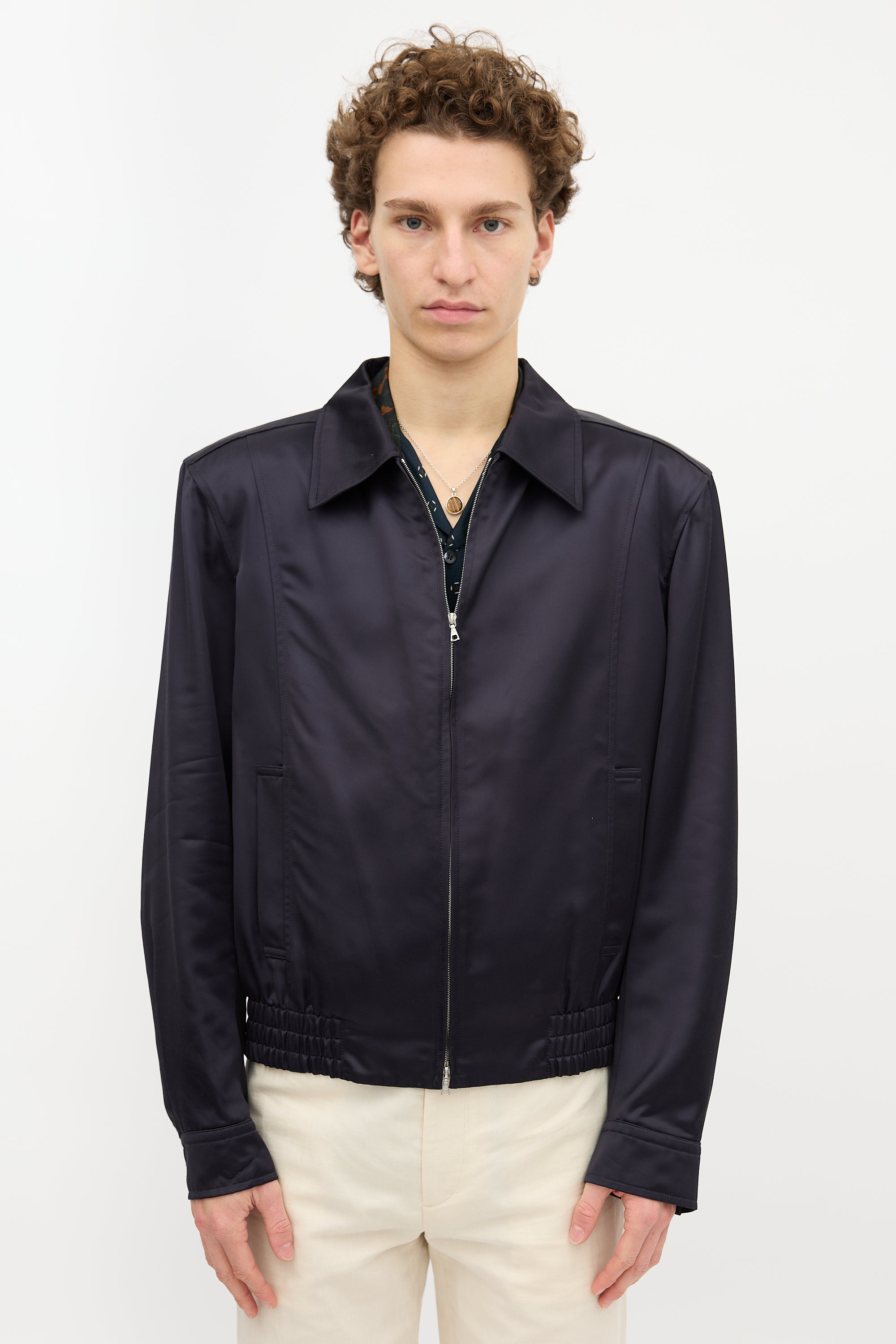 Pre-owned Dries Van Noten navy satin bomber jacket featuring a point collar, dual zip front, two welt pockets at front, padded shoulders, buttoned cuffs, and an elasticized waist. Lined.