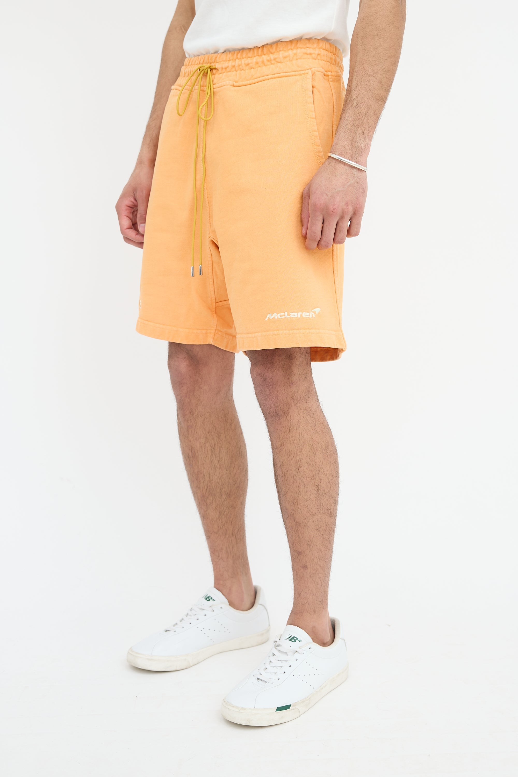 Pre-owned Rhude X McLaren orange Fall 2021 Trackside shorts featuring drawstring waist, two front slash pockets, one back patch pocket, and embroidered logos at hem.