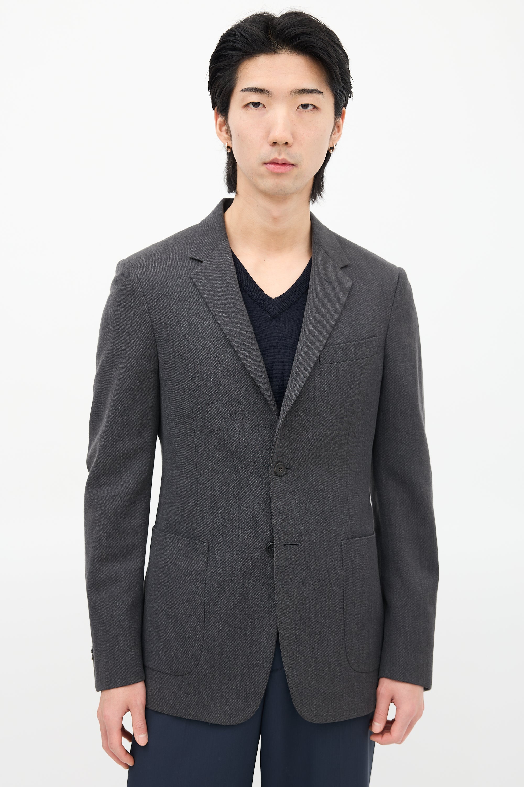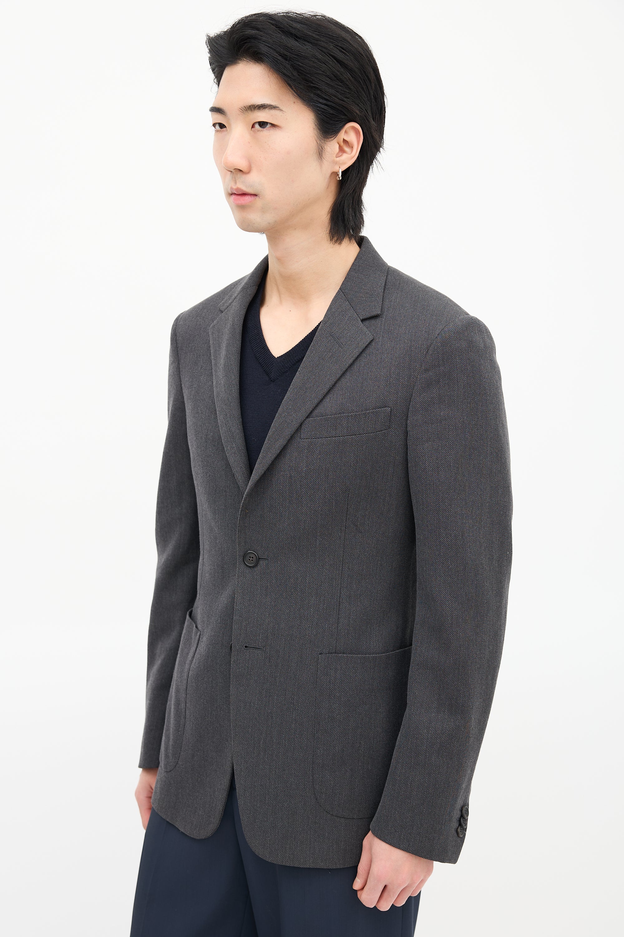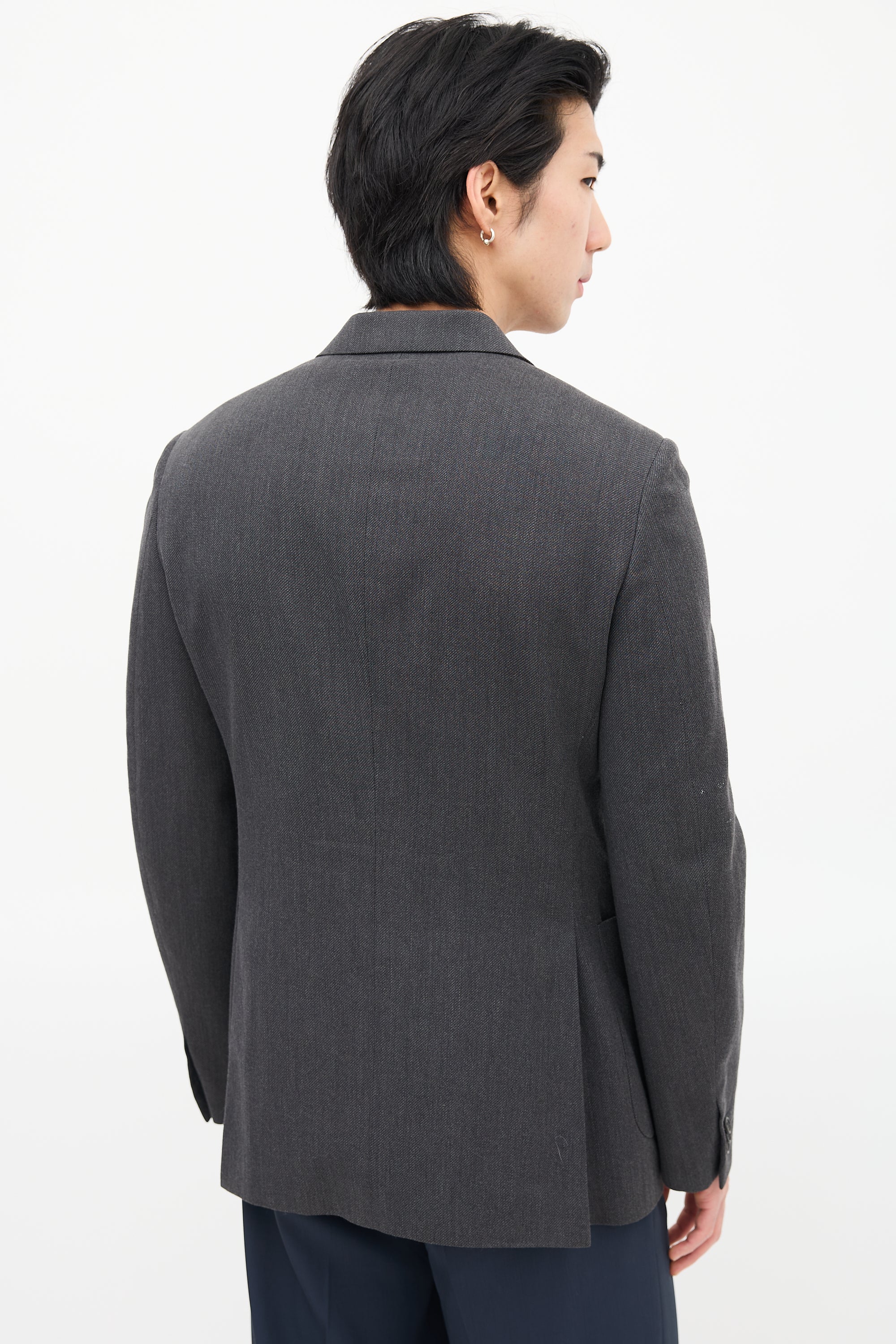 Pre-owned Prada grey wool blazer featuring notched lapel, button up front, welt pocket at left chest, two patch pockets at waist, buttoned cuffs, and double back vent. Lined.