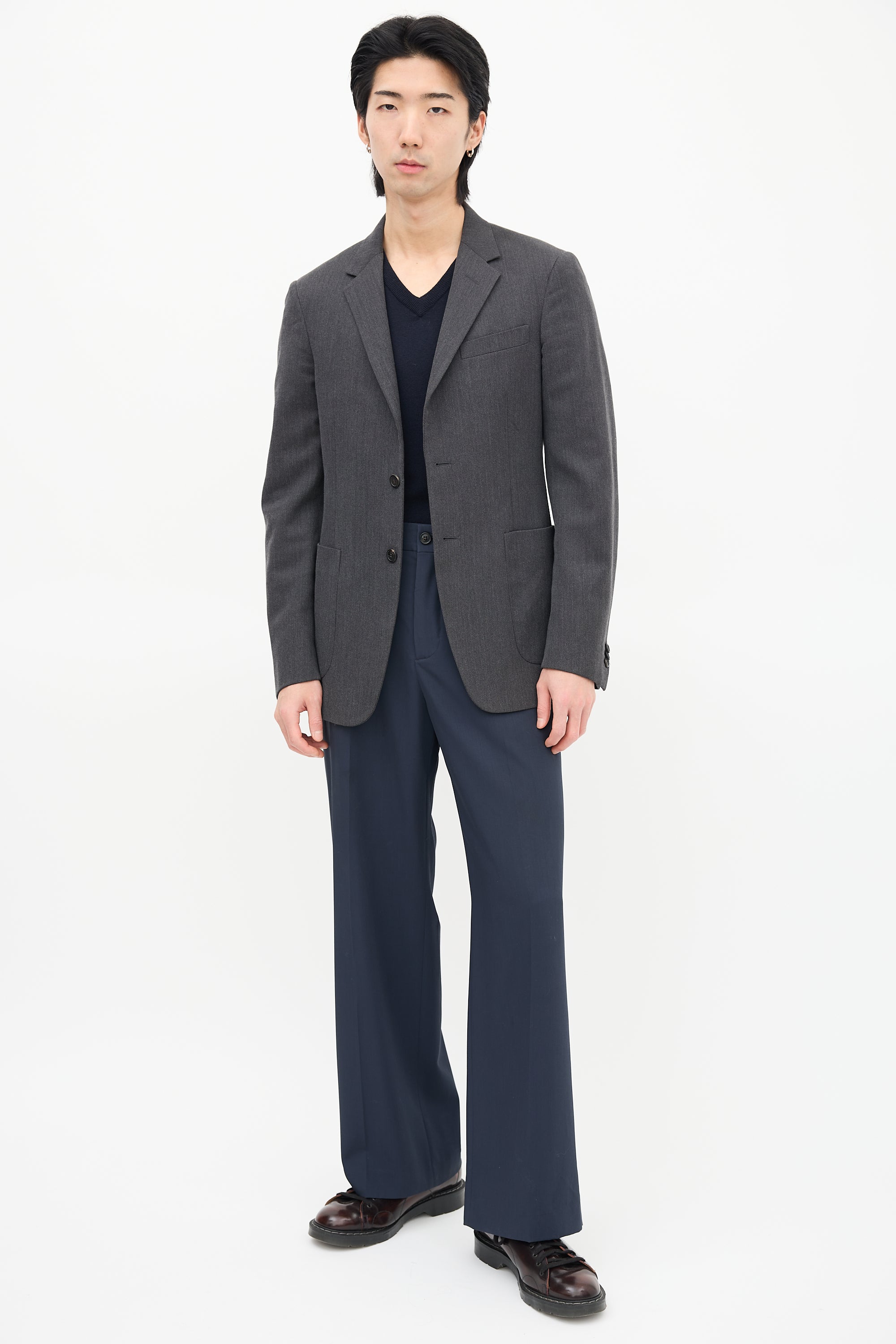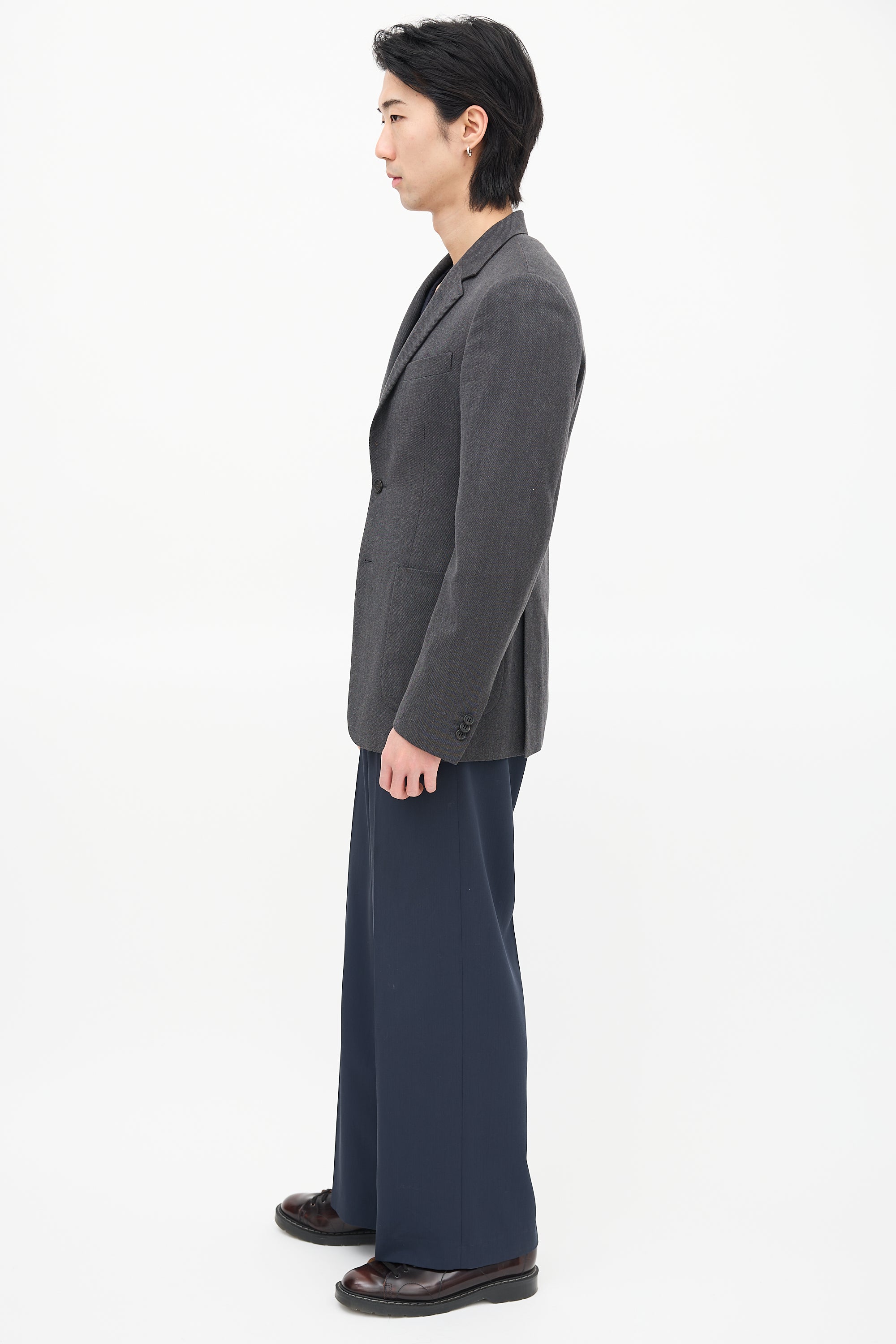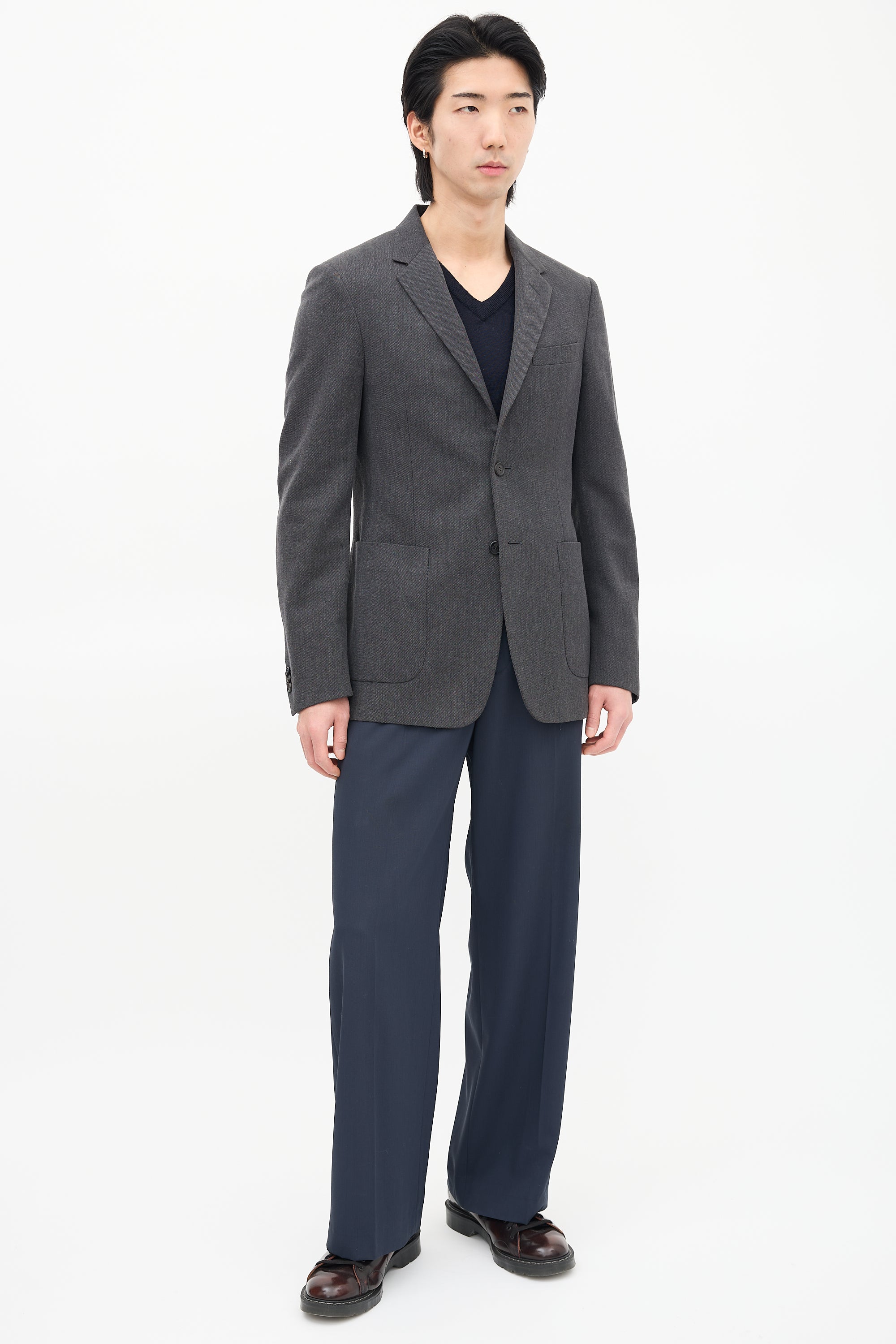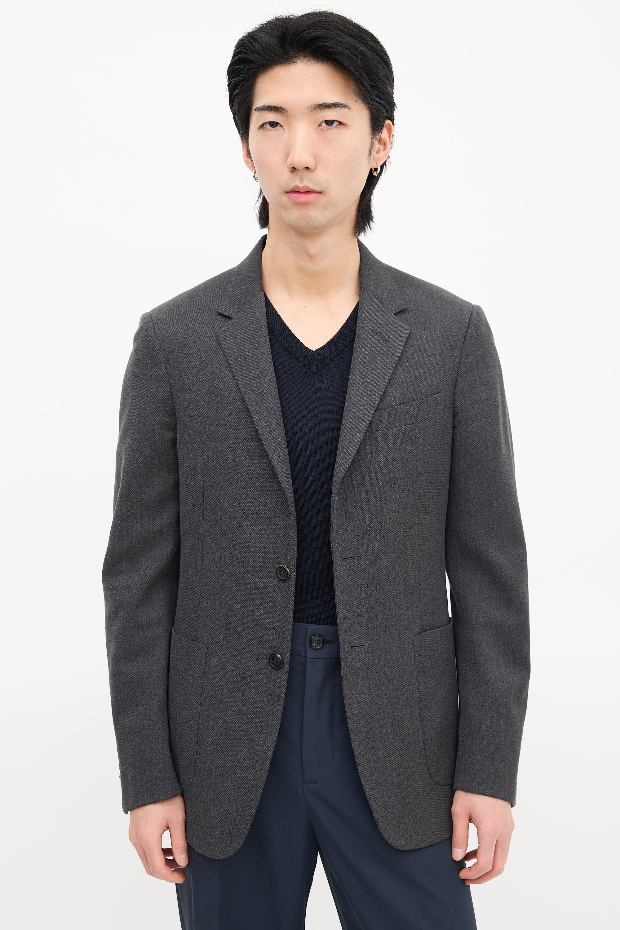 Pre-owned Prada grey wool blazer featuring notched lapel, button up front, welt pocket at left chest, two patch pockets at waist, buttoned cuffs, and double back vent. Lined.