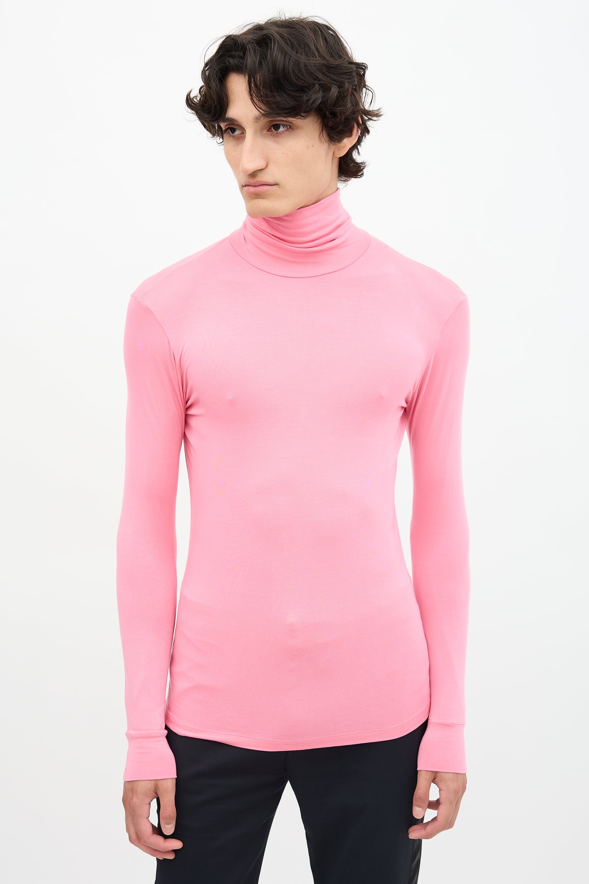 Pre-owned Raf Simons Fall/Winter 2021 pink micromodal blend top featuring turtleneck with white embroidered initial and sleeve cuffs.