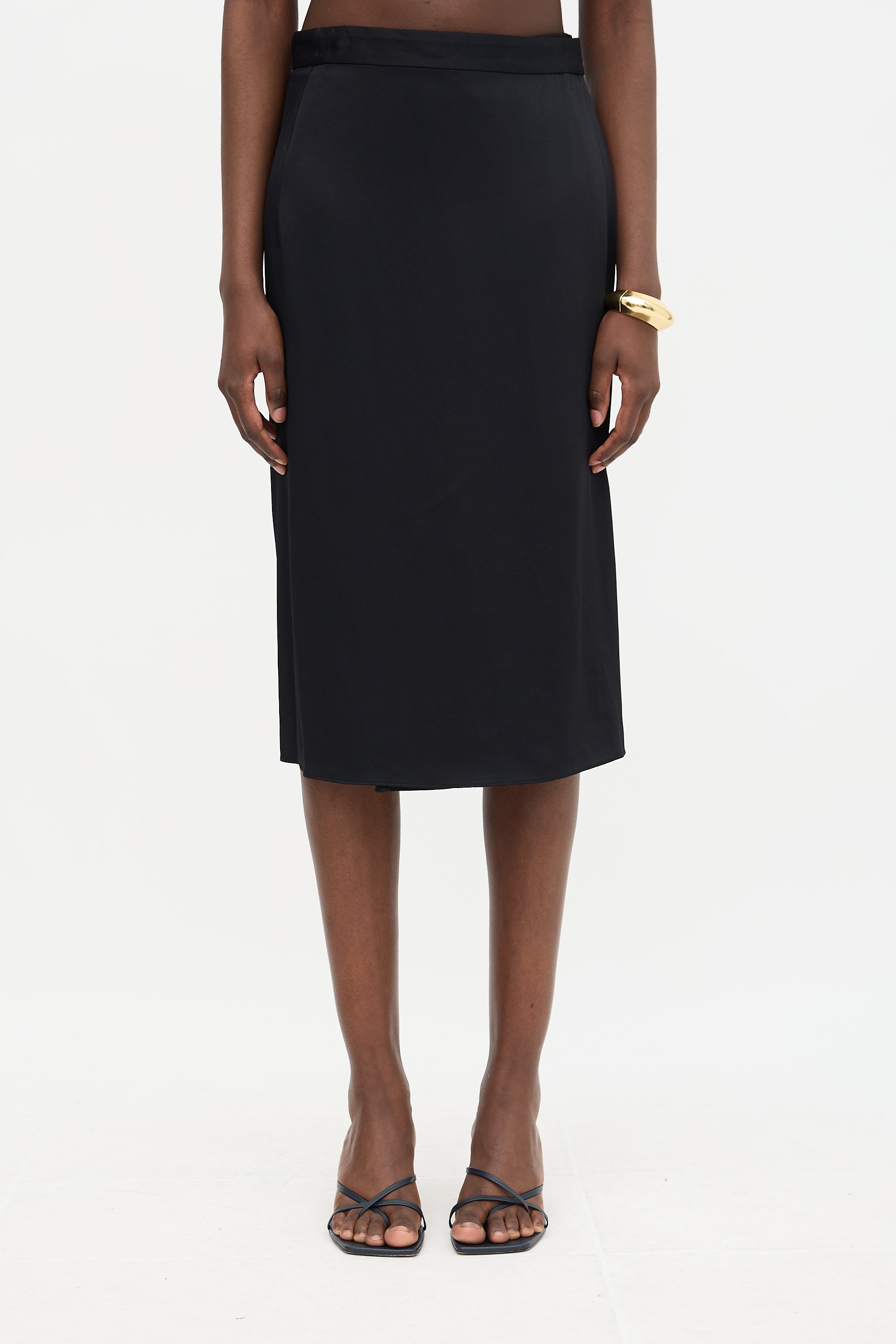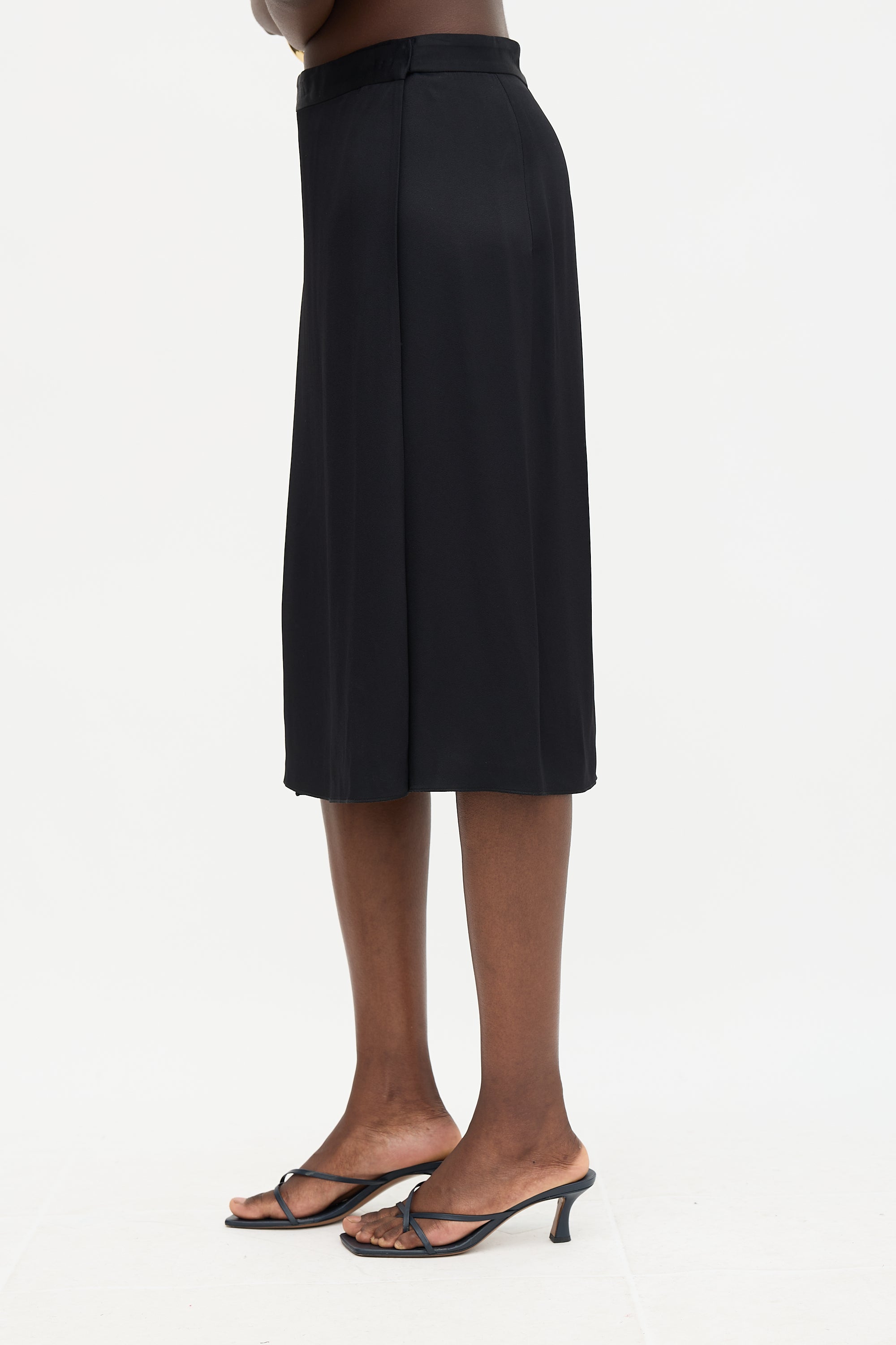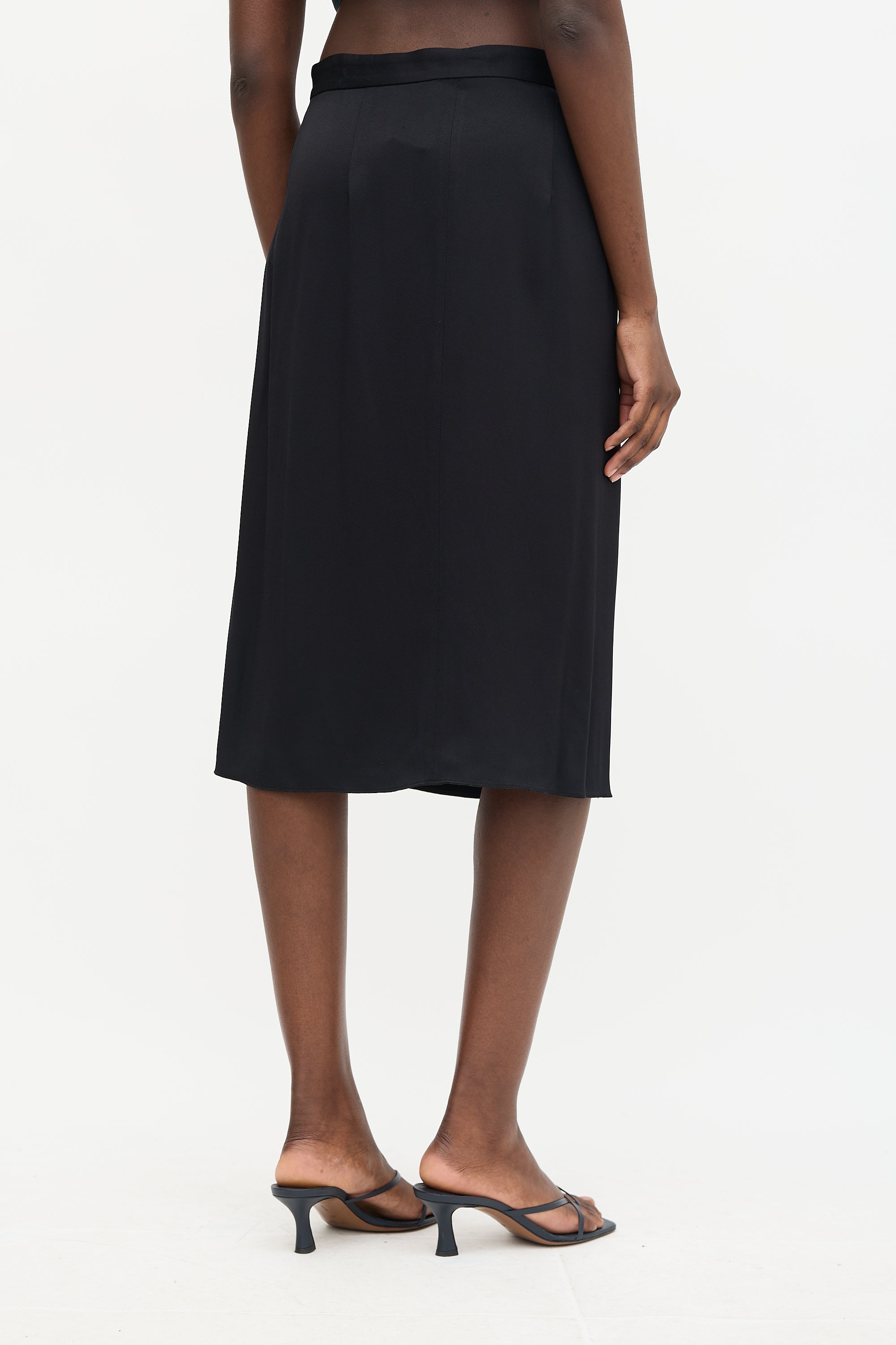 Pre-owned Celine black satin wrap skirt featuring a wrap front closure with hook and eye fastening and silk lining. Phoebe Philo era design.