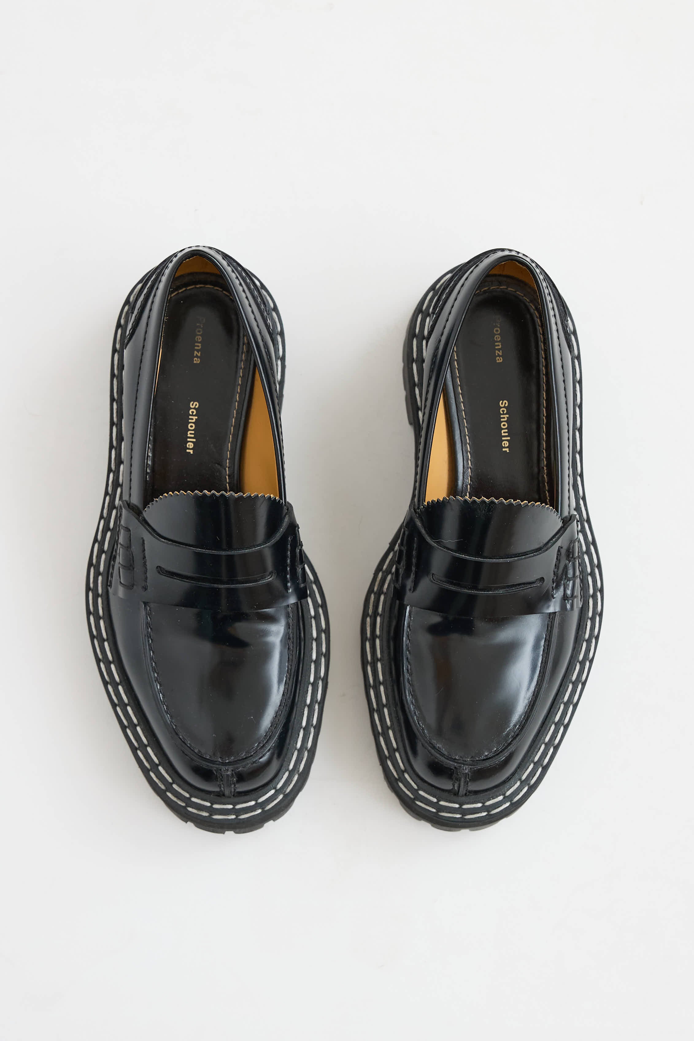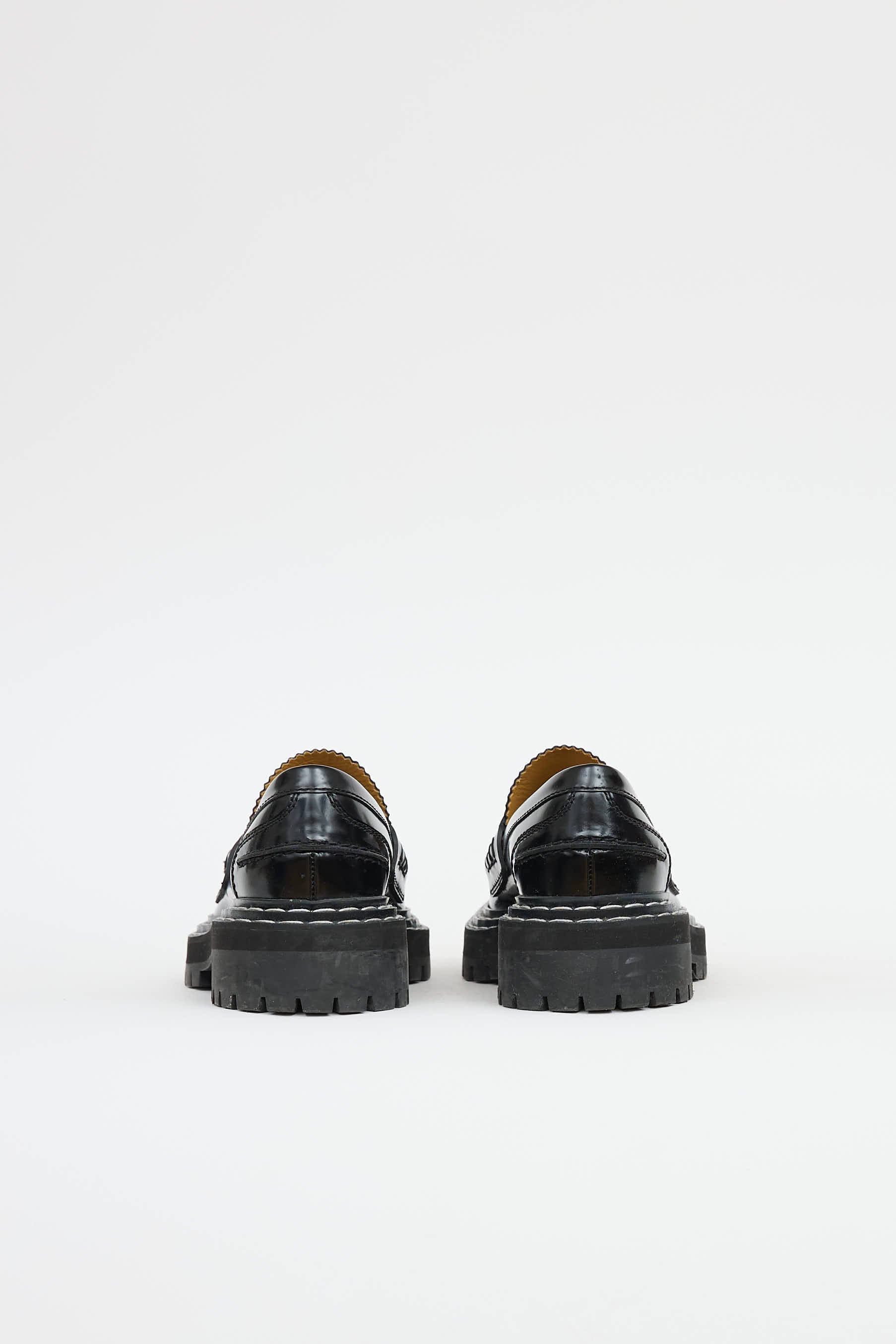 Pre-owned Proenza Schouler black loafers featuring a rounded toe, leather upper, penny strap at vamp, serrated top line, treaded rubber platform sole with contrast stitch details.
