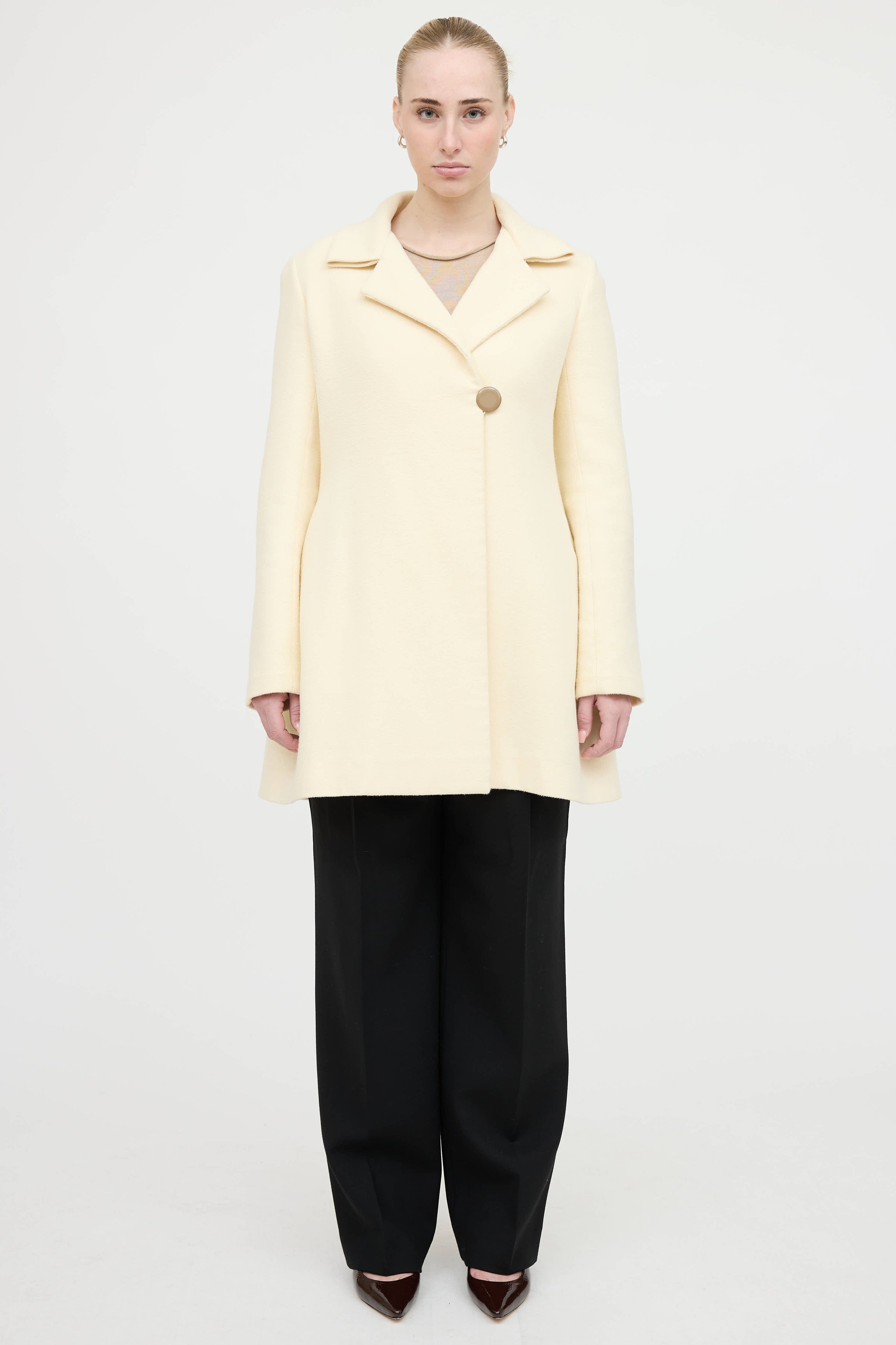 Pre-owned The Row cream long sleeve coat featuring pointed collar, singular button front, and slit pockets at side.