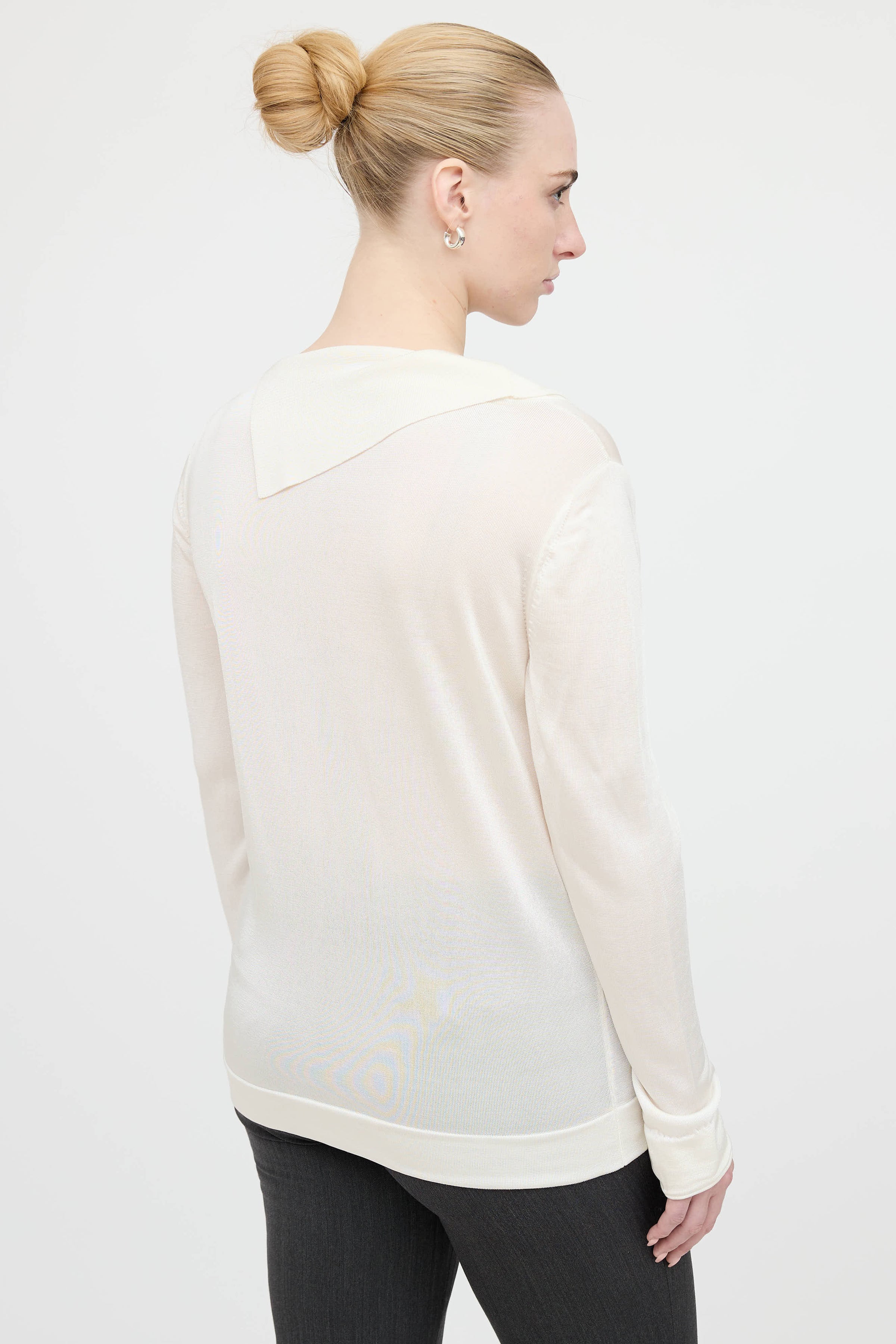 Pre-owned The Row white knit top featuring boat neckline, asymmetrical foled collar, long sleeves, and rolled hems.
