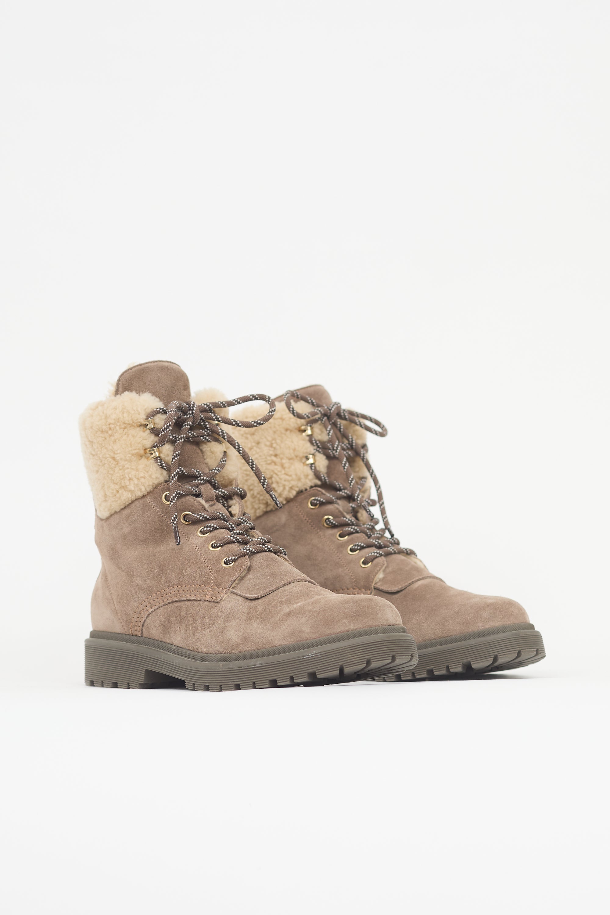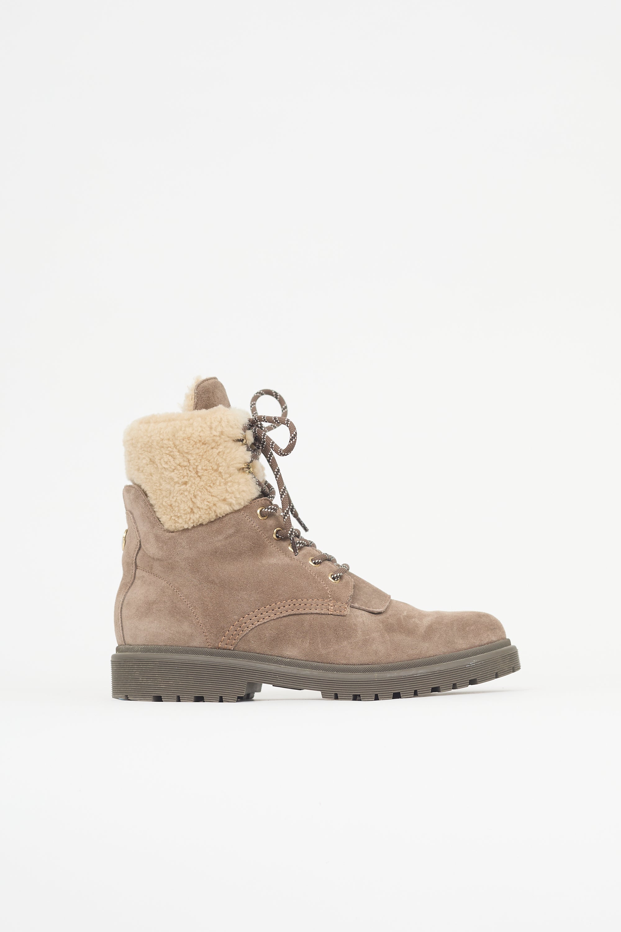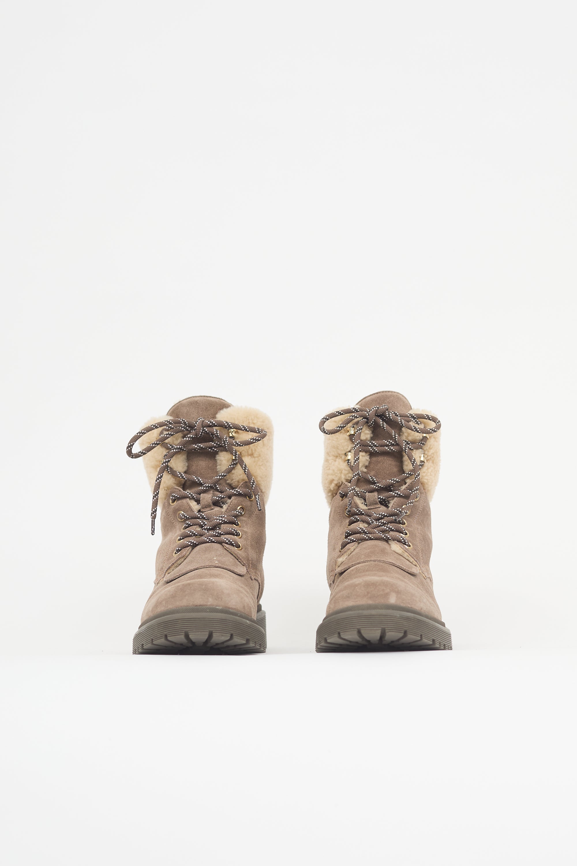 Pre-owned Moncler brown suede and beige shearling Patty boots featuring rounded toe, lace up front, logo embellishment at back shaft, and tonal treaded rubber sole. Comes with original dust bag.