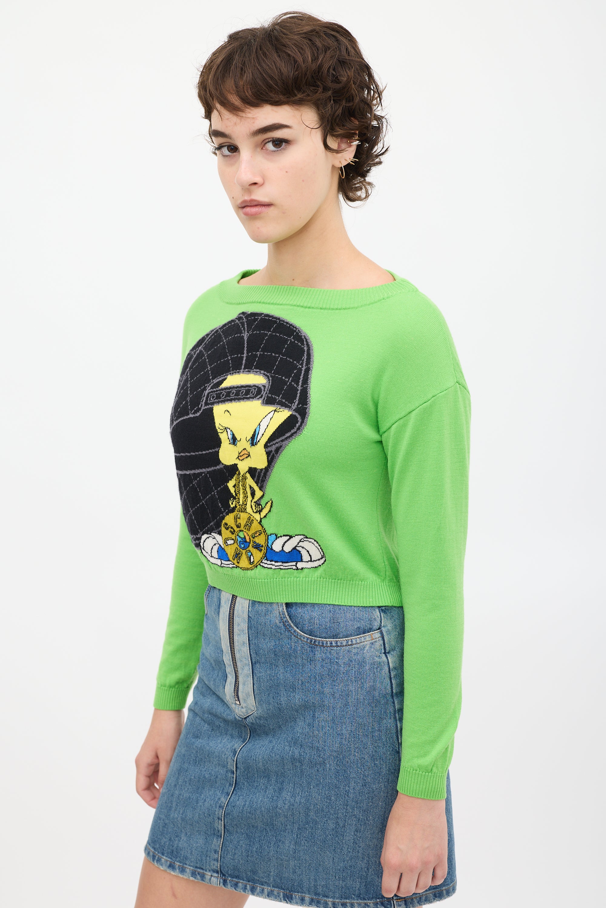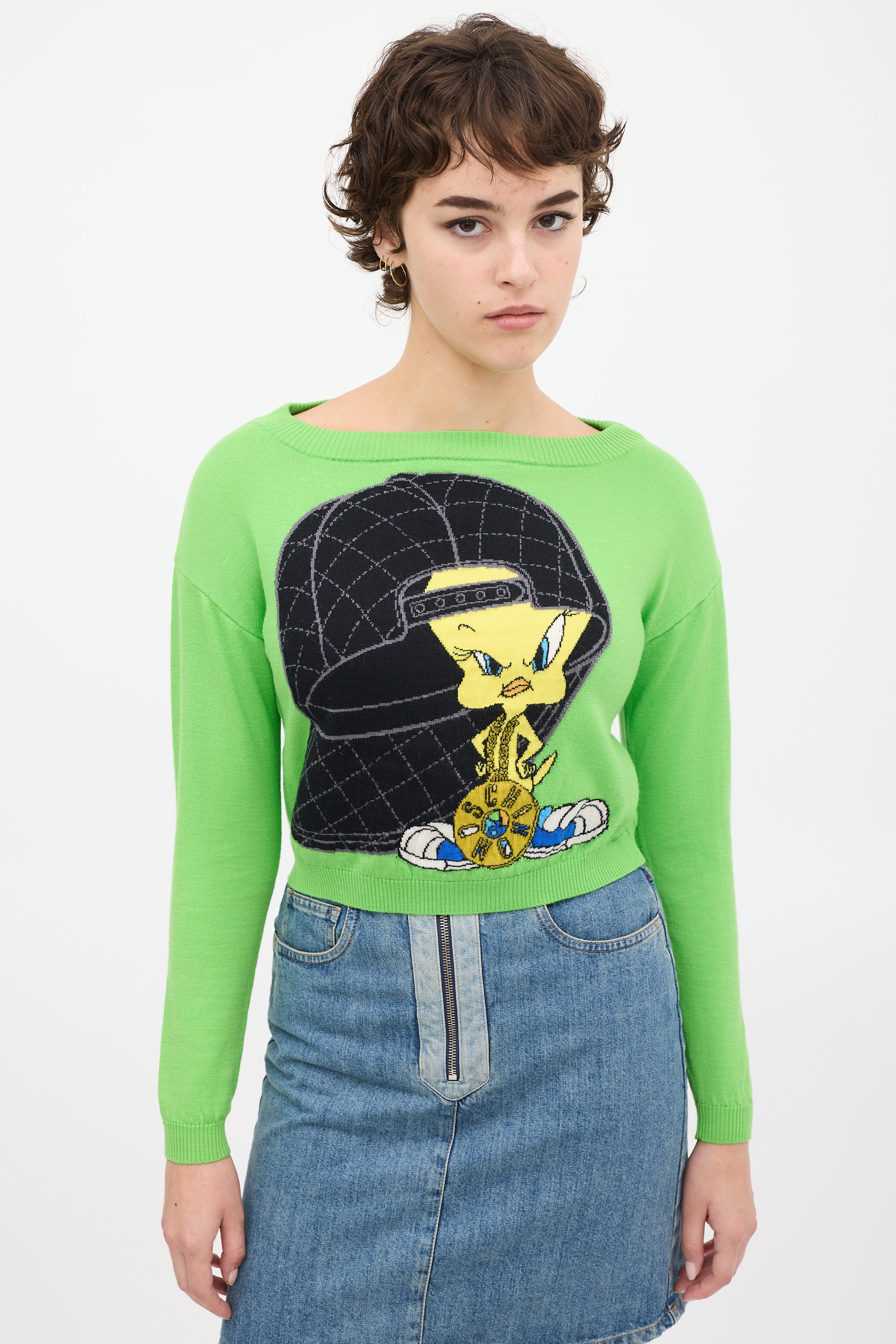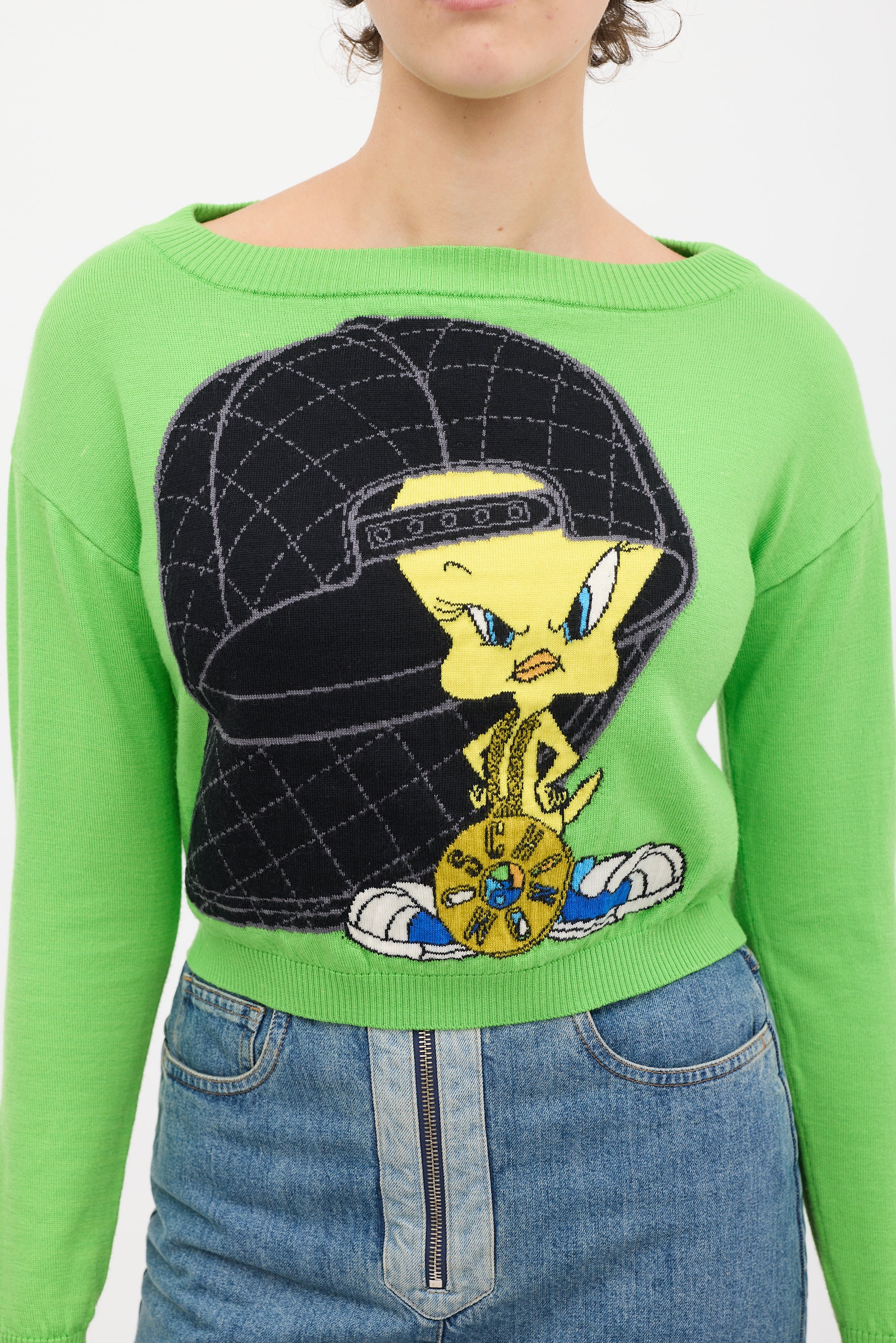 Pre-owned Moschino green knit sweater featuring a multicolour Tweety Bird graphic at front and back, long sleeves, and ribbed hem.