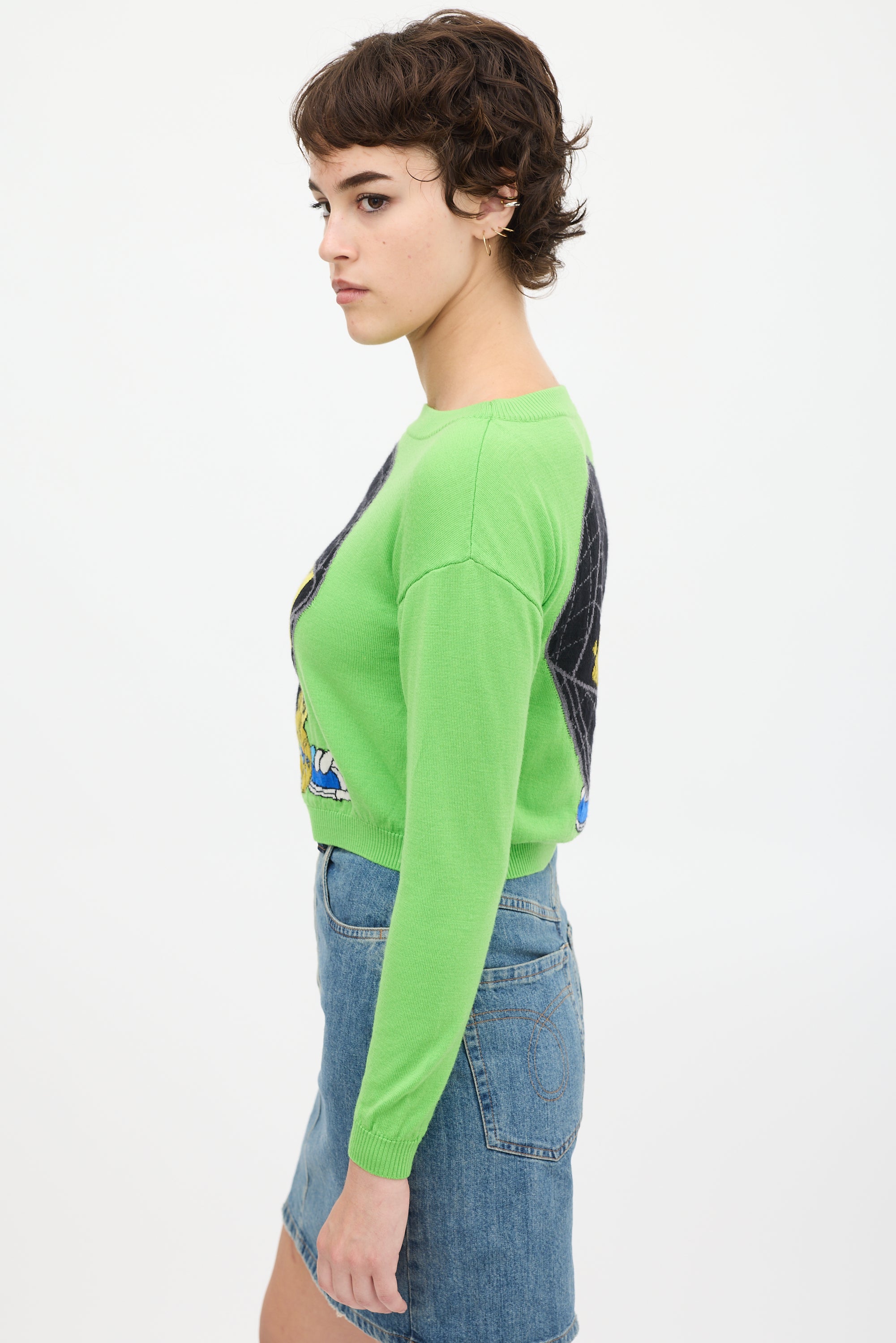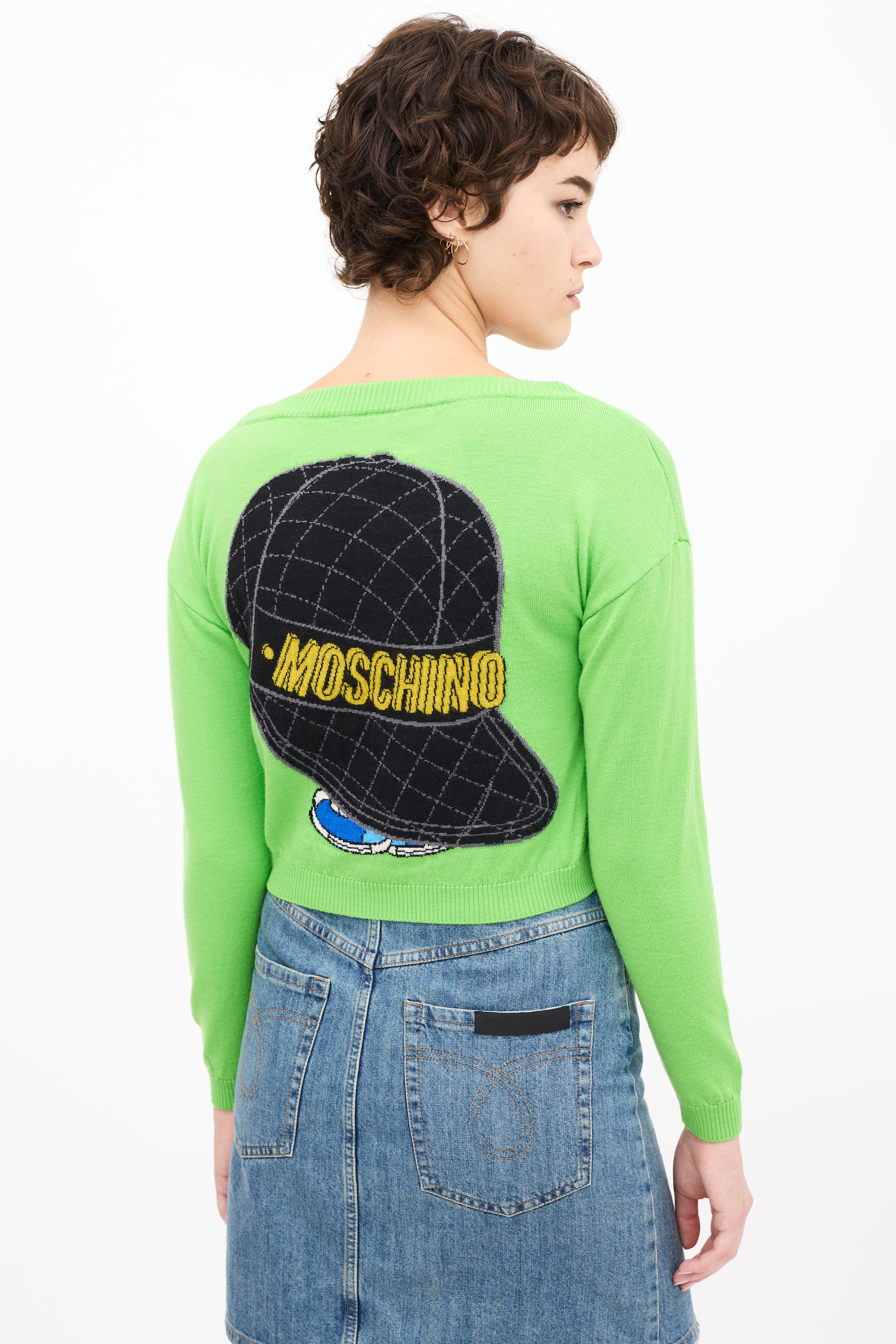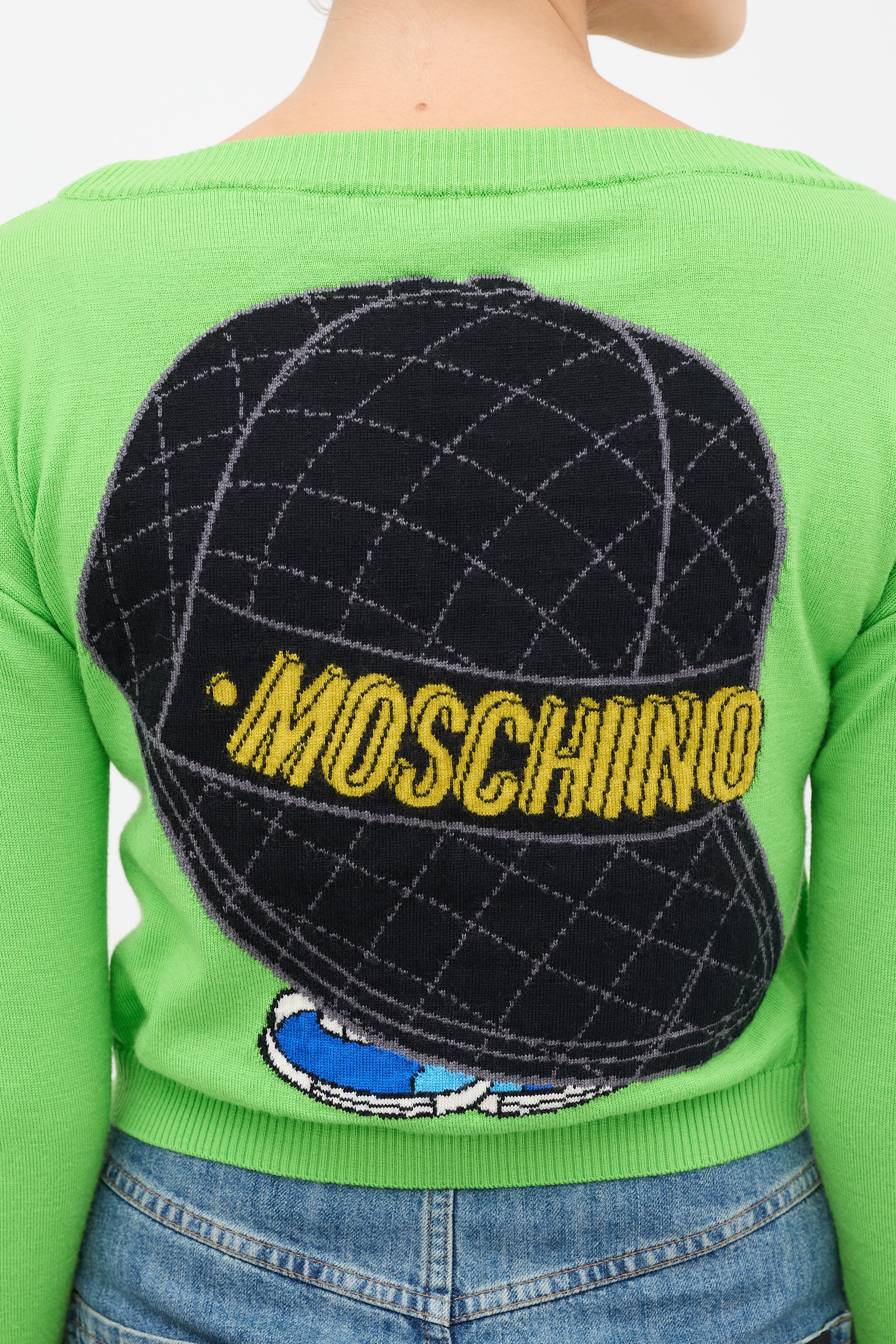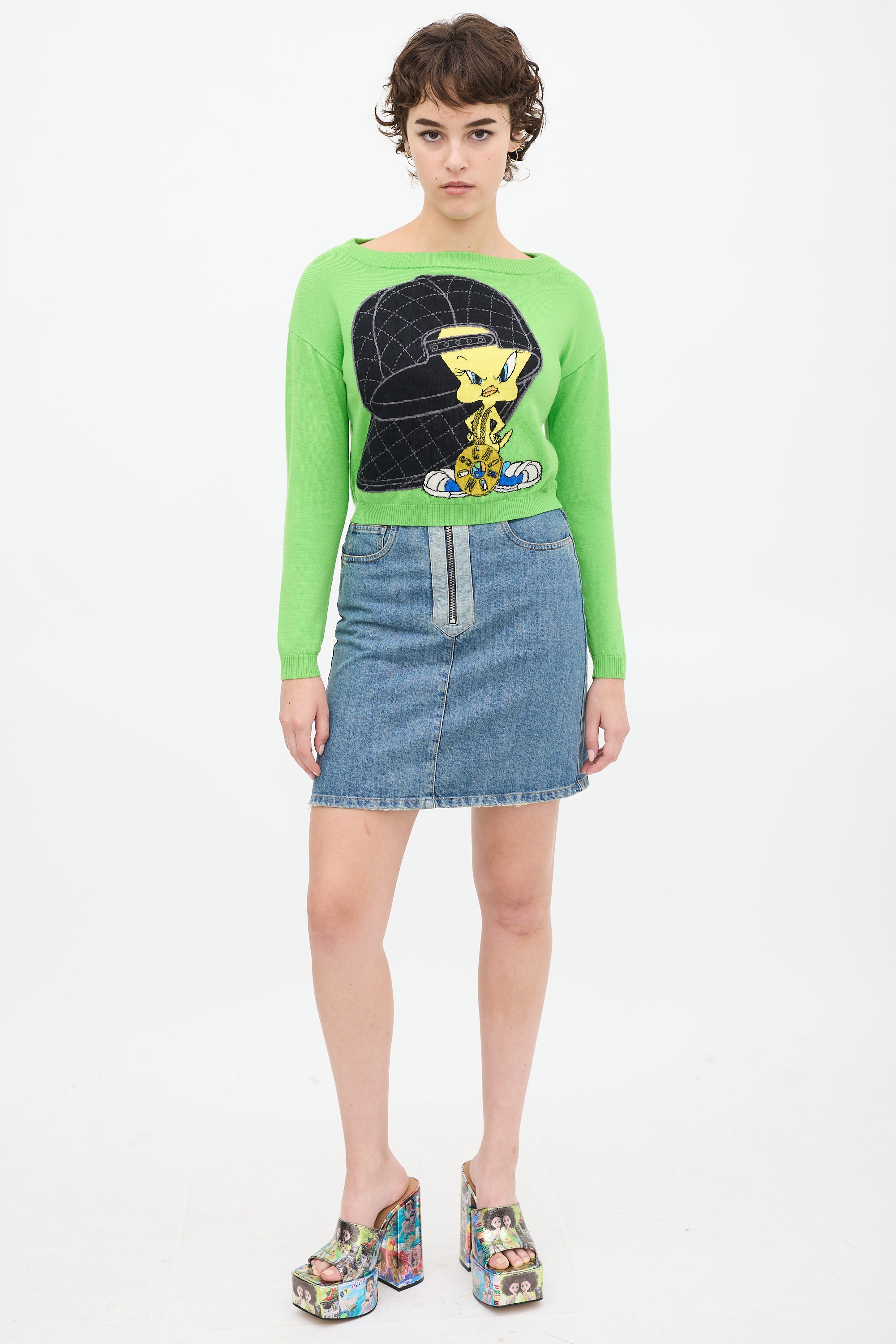 Pre-owned Moschino green knit sweater featuring a multicolour Tweety Bird graphic at front and back, long sleeves, and ribbed hem.