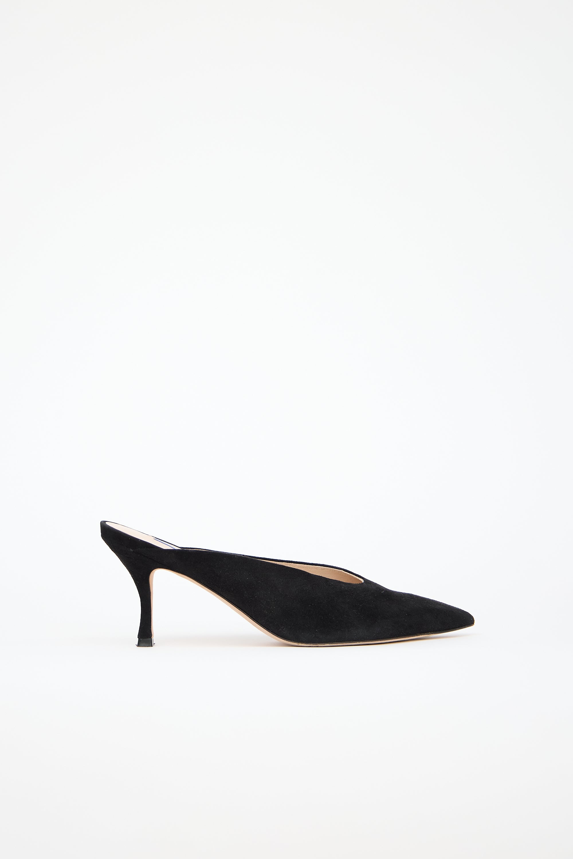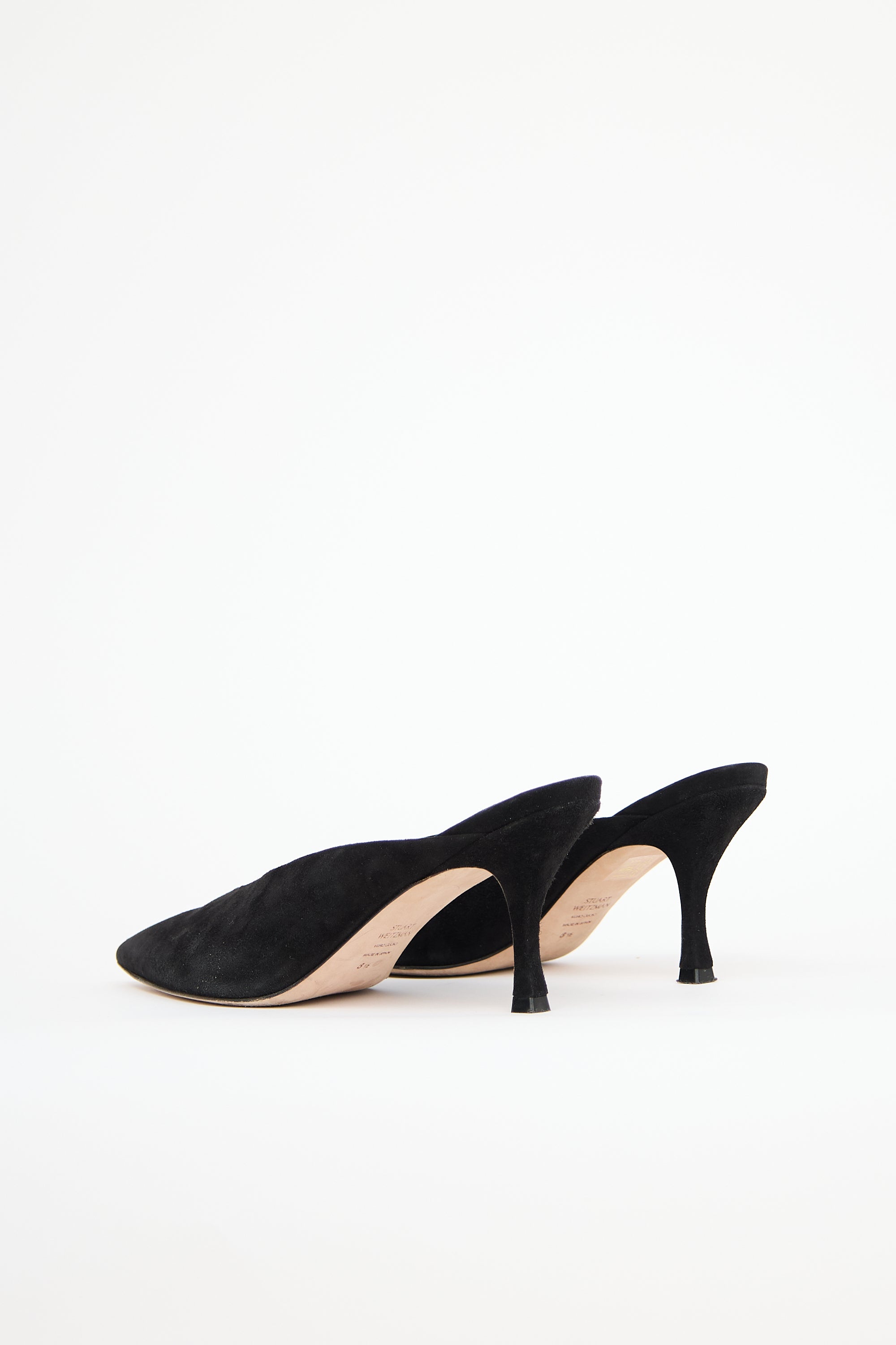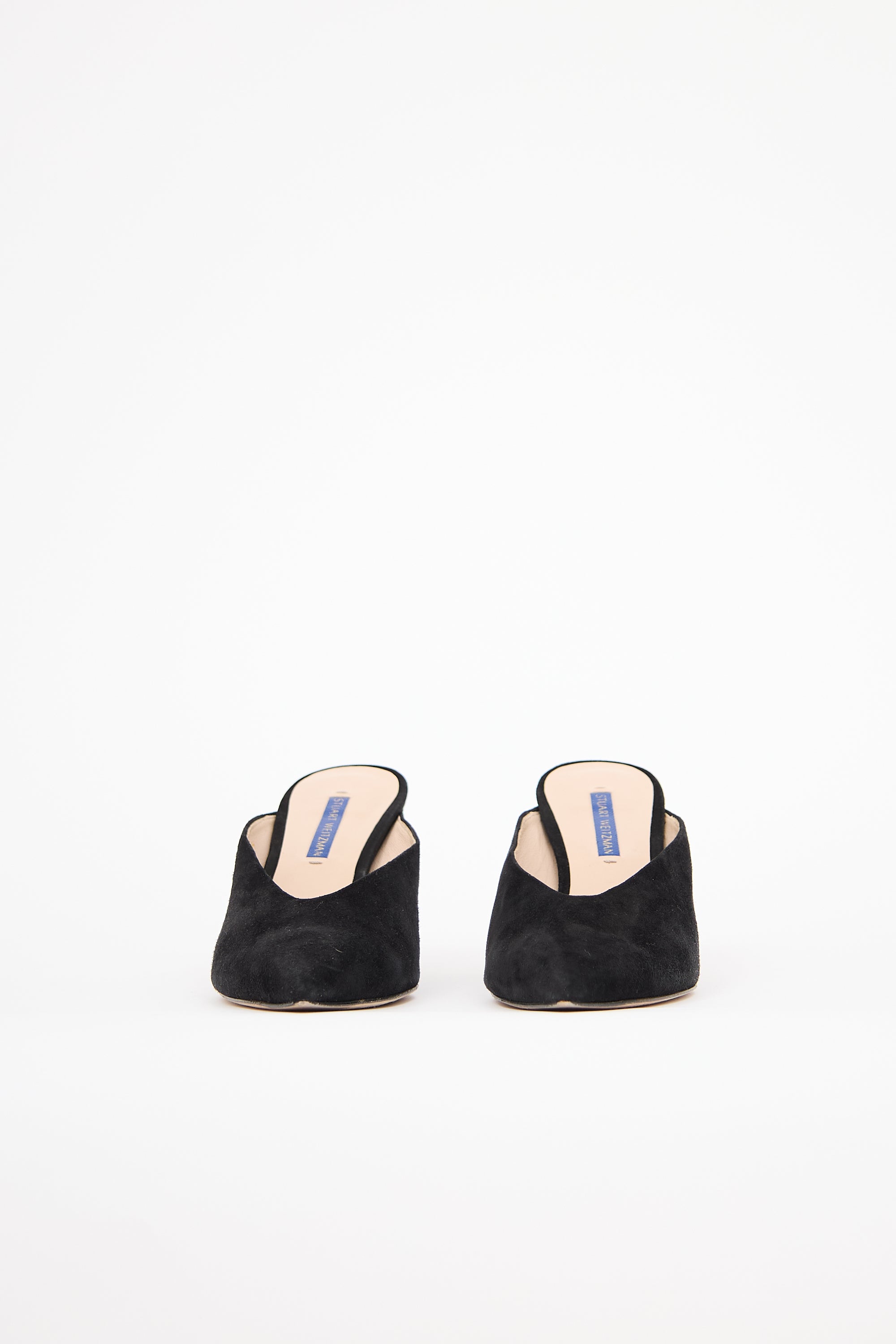 Pre-owned Stuart Weitzman black suede Lulah mules featuring a pointed toe, slip on entry, and covered continental heel.