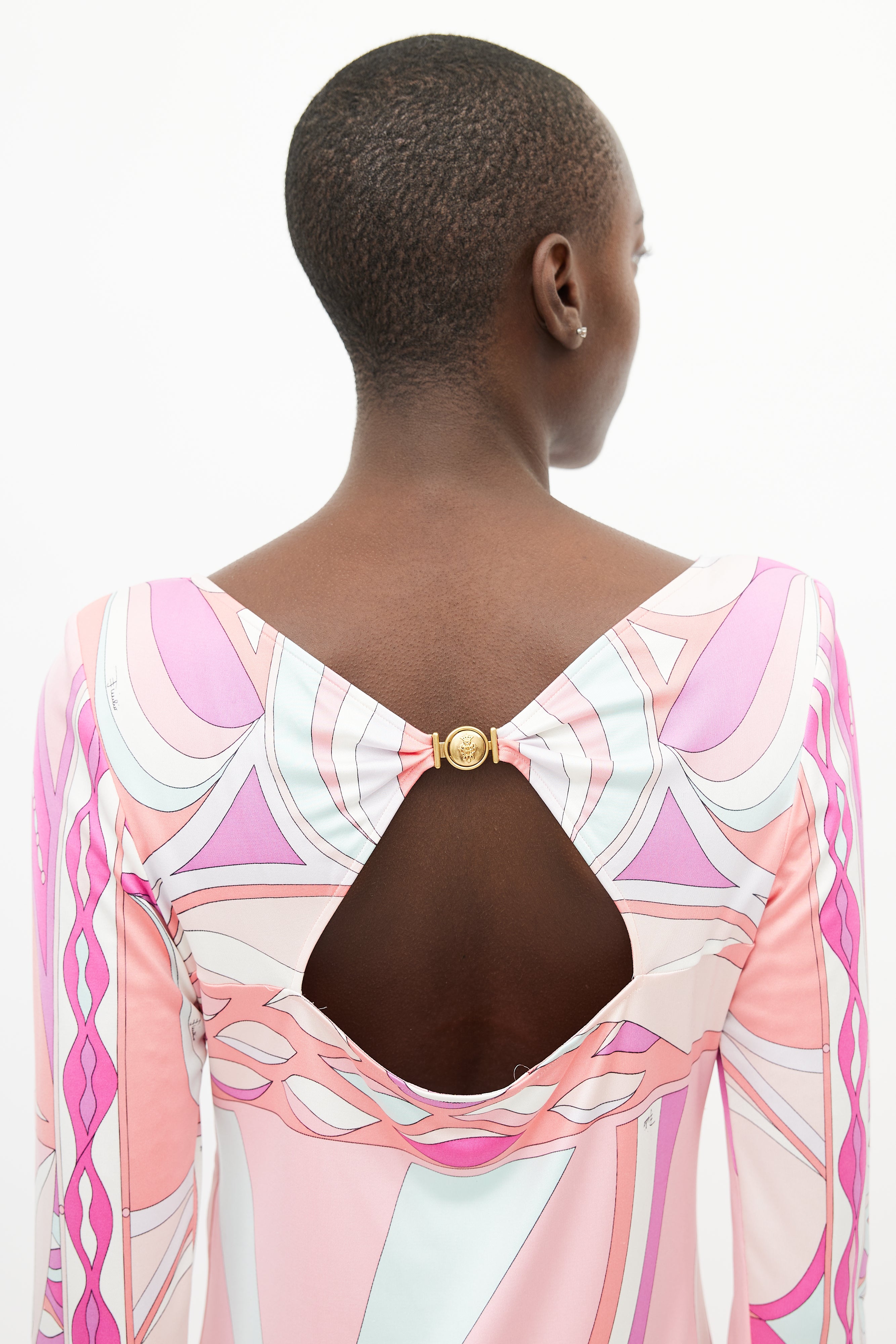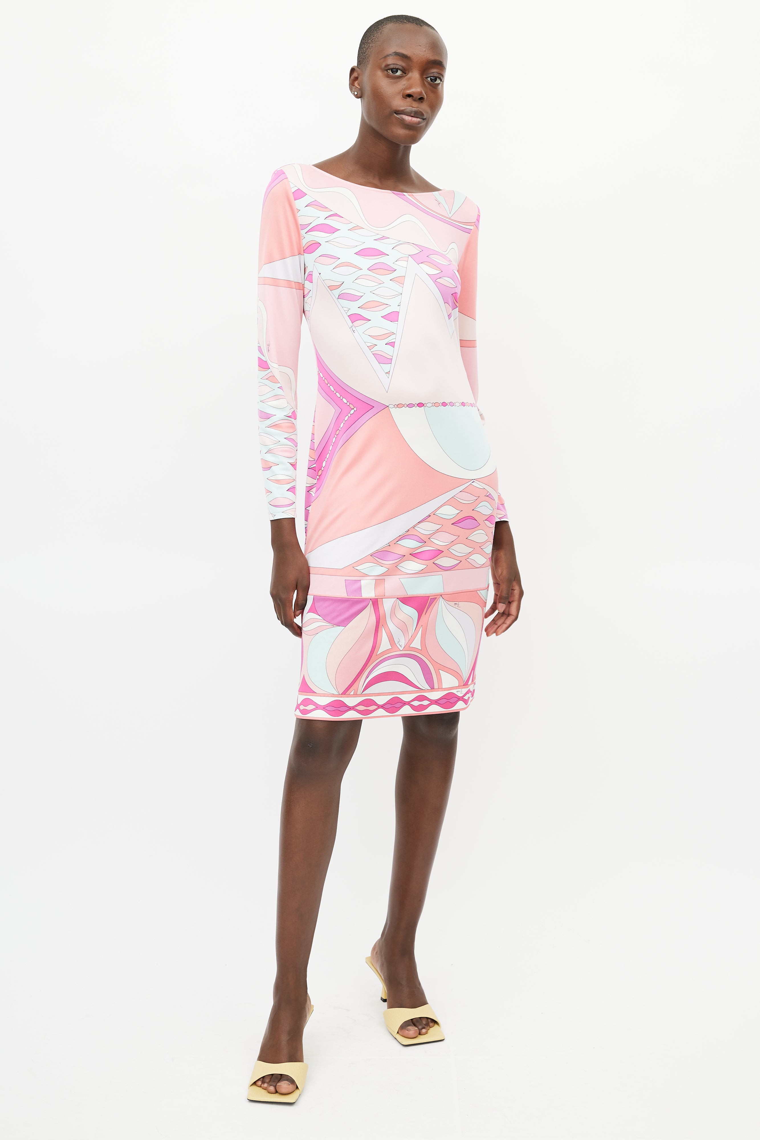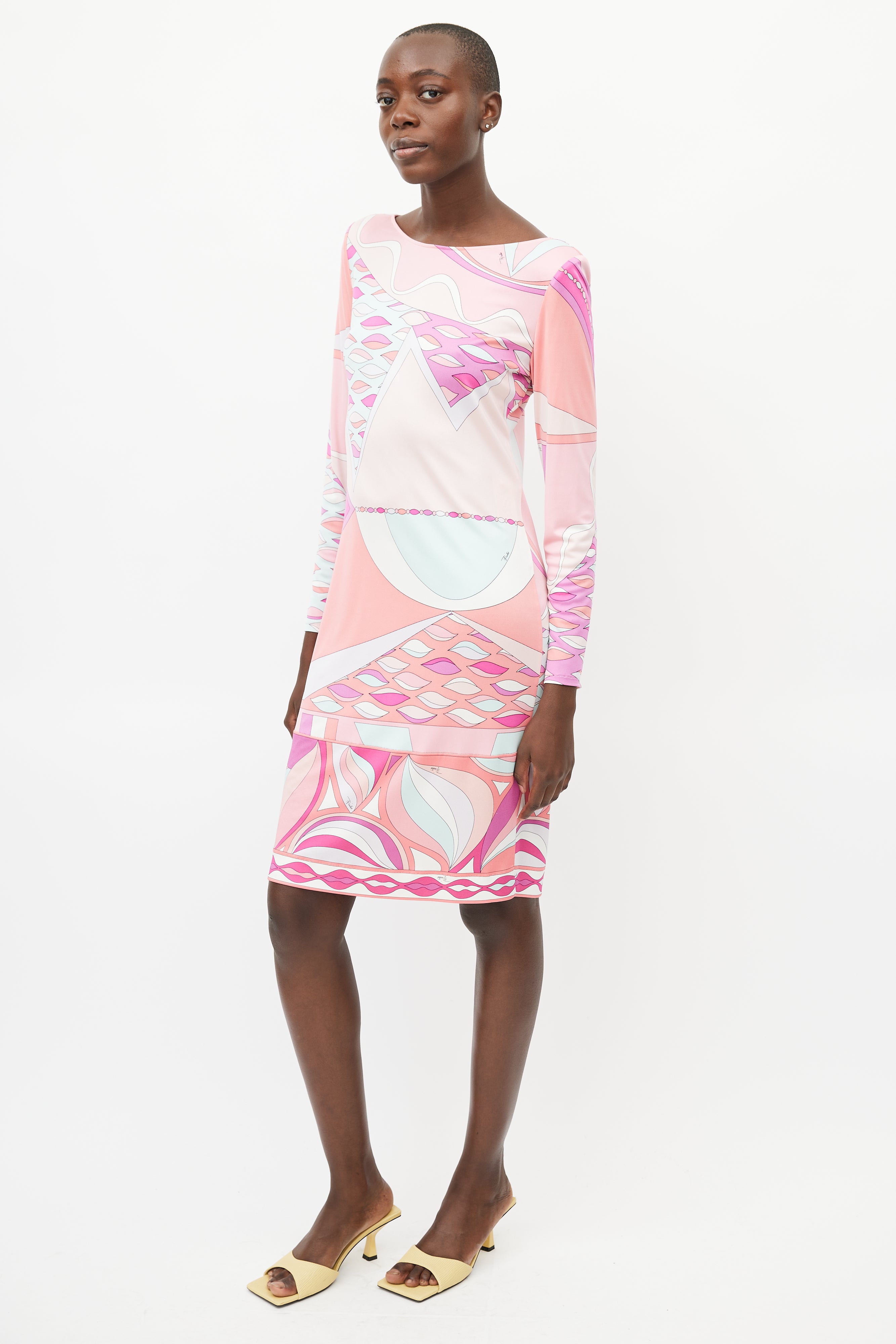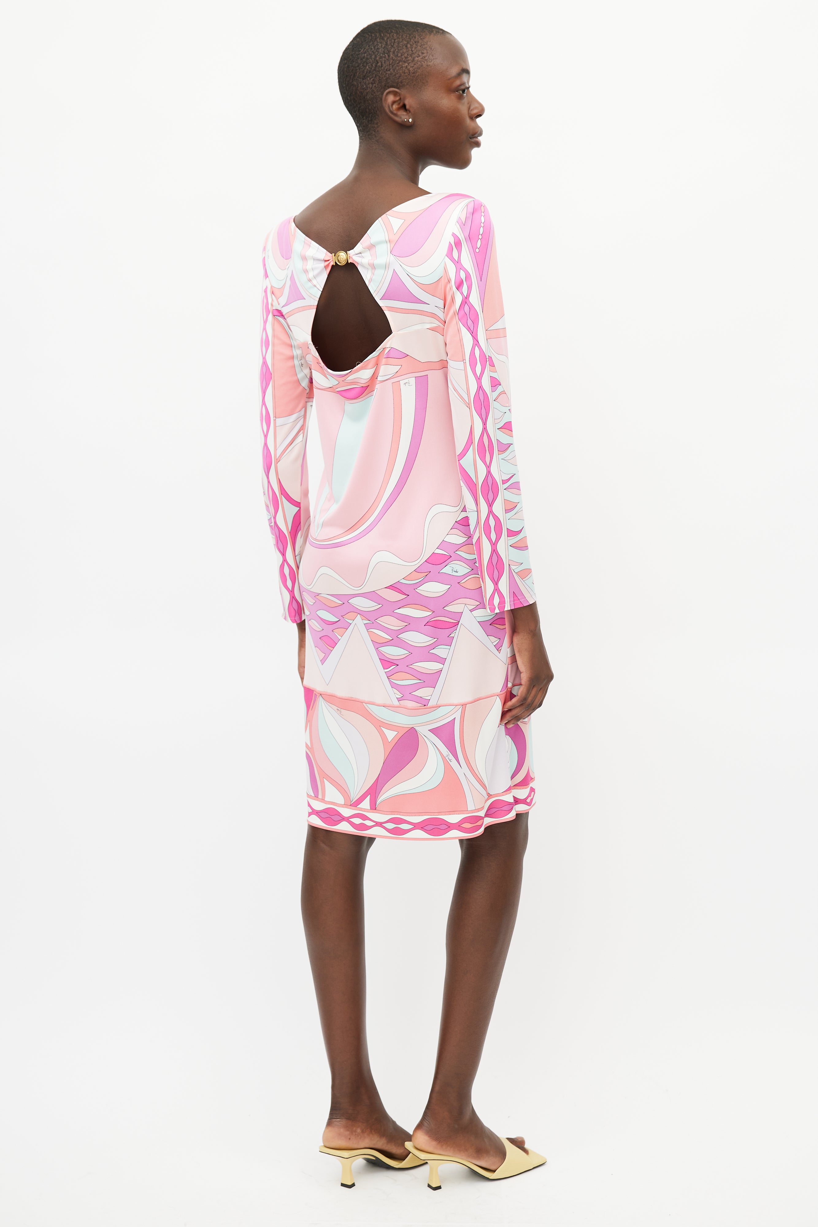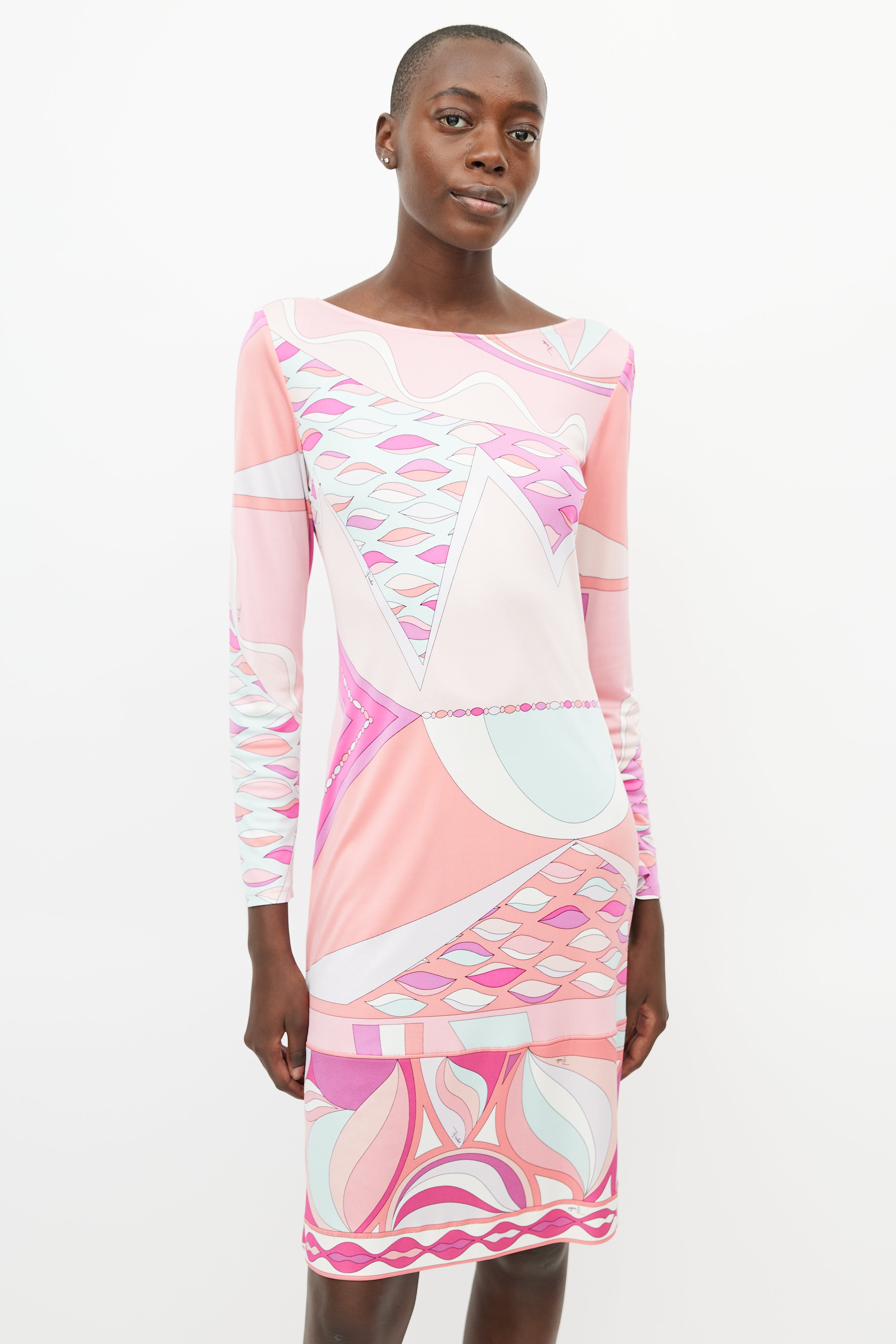 Pre-owned Emilio Pucci pink silk dress featuring a multicolour abstract print throughout, round neckline, structured shoulders, long sleeves, and gold tone clasp closure at back.