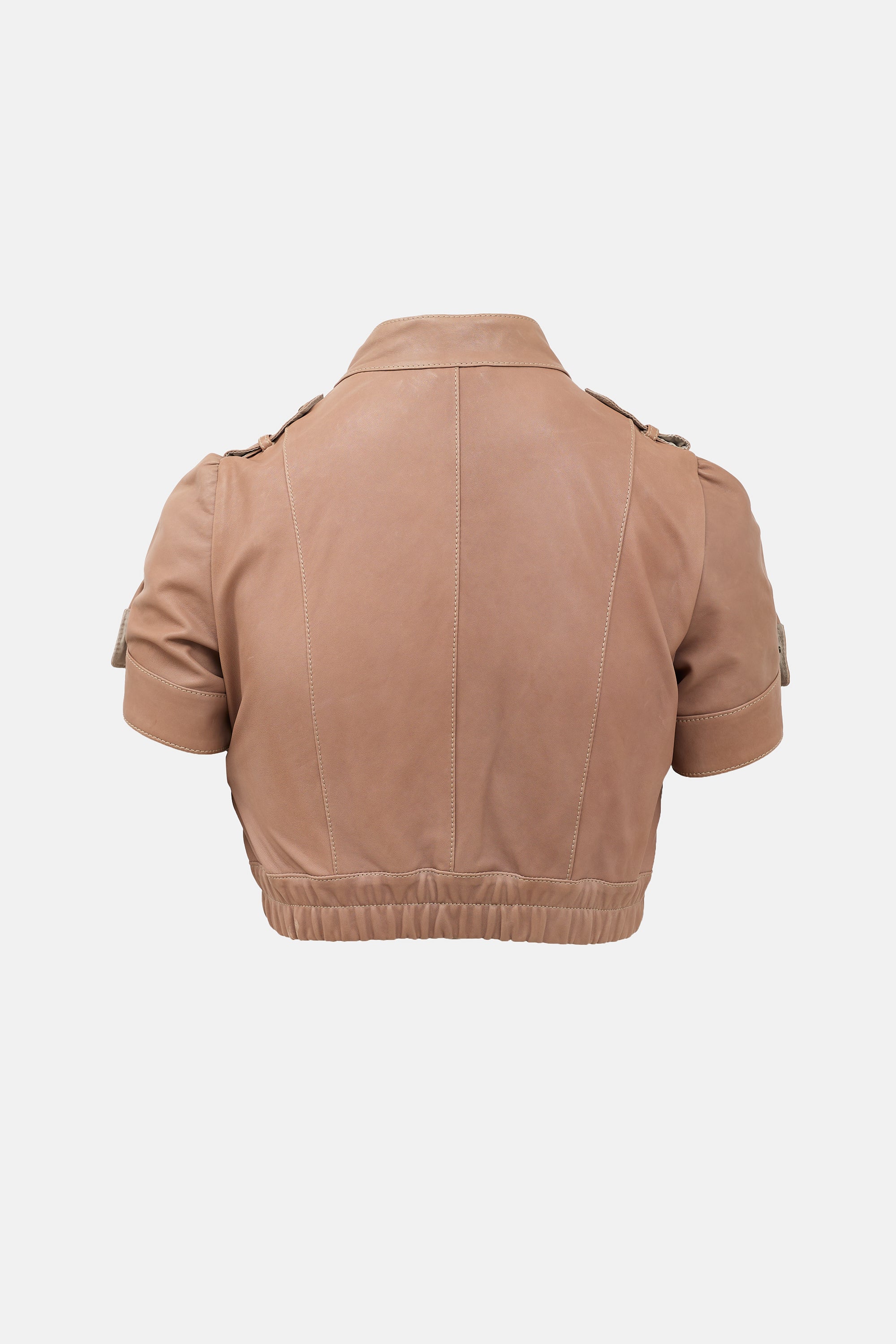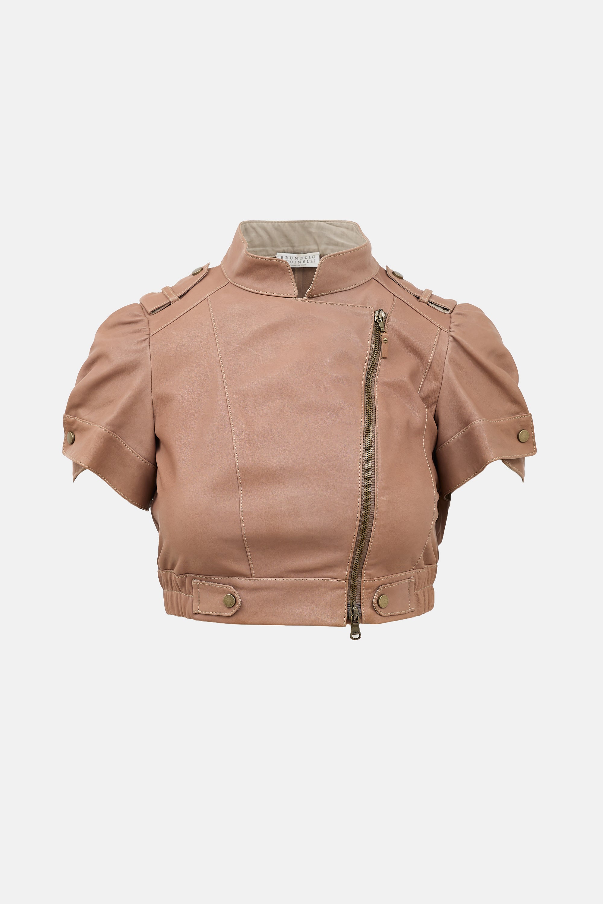 Pre-owned Brunello Cucinelli brown leather jacket featuring asymmetrical zip front, stand collar, decorative epaulettes and buttons at waist, short sleeves with snap button adjustment, and elasticized hem.