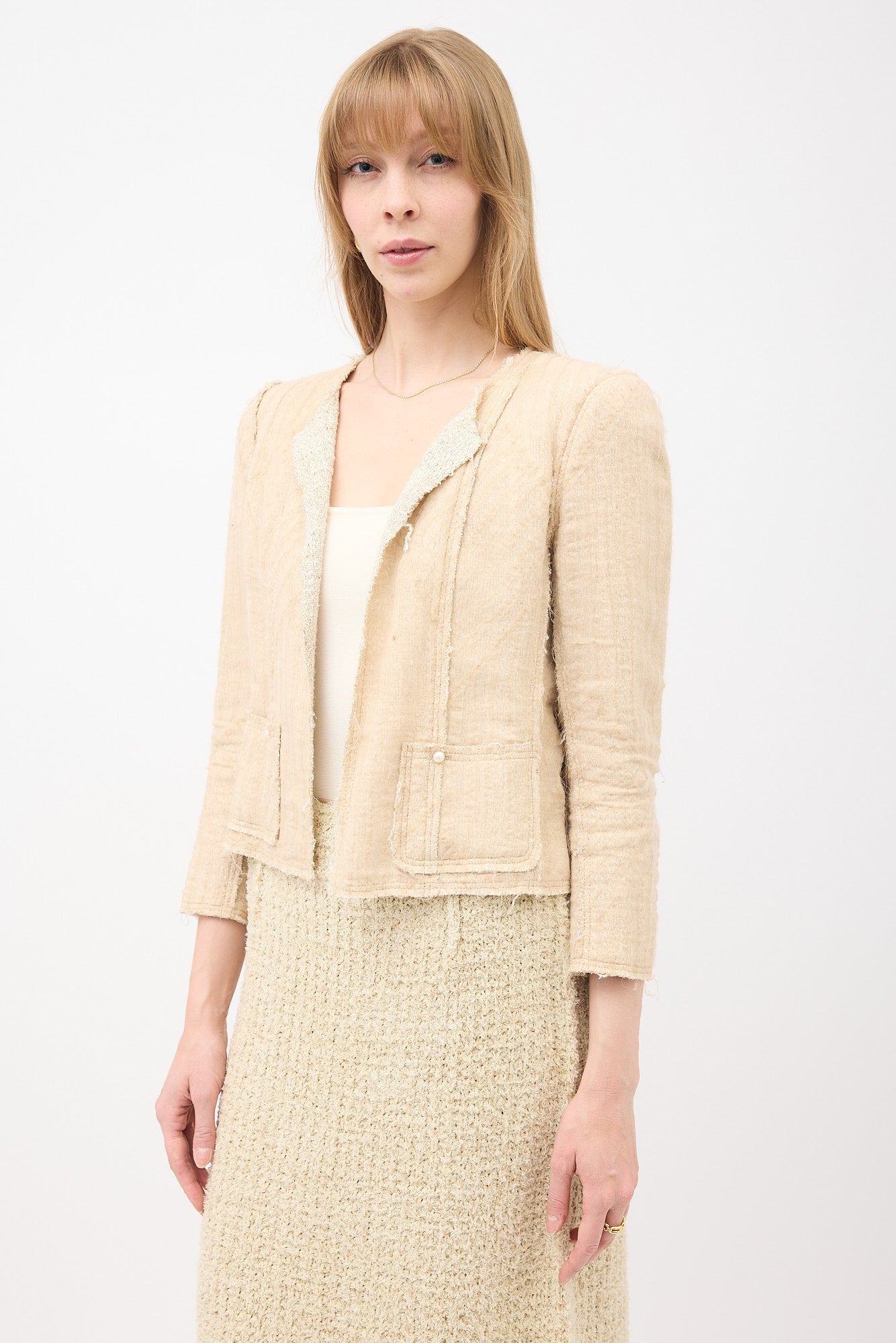 Pre-owned Chanel Spring/Summer 2003 beige silk blend overlay tweed jacket featuring round neckline, open front, interlocking CC faux pearl buttons, two front patch pockets, padded shoulder, and buttoned cuffs. Lined.