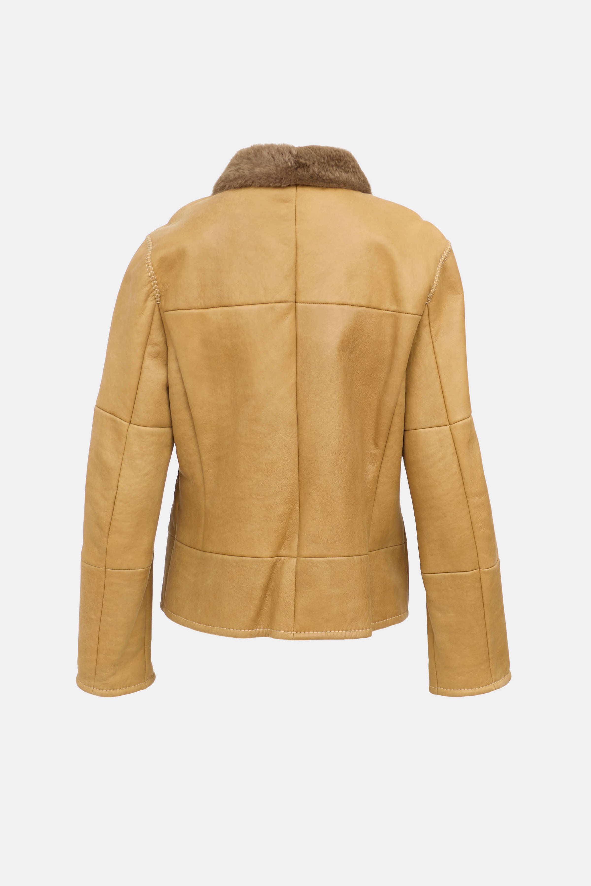 Pre-owned Christ brown leather shearling jacket featuring shearling pointed collar, button up closure, and two slip pockets at waist.