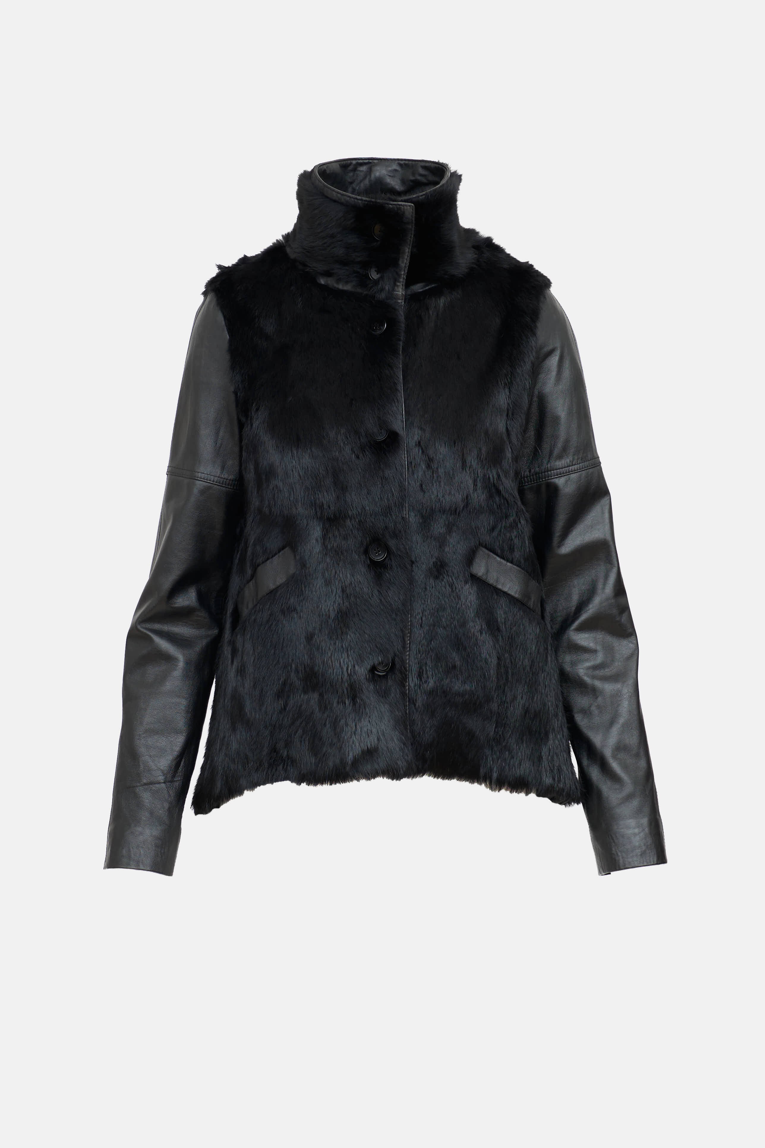 Pre-owned Derek Lam black leather and rabbit fur jacket featuring stand collar, leather sleeves, slip pockets at waist, button up closure, and V cut at back. Lined.