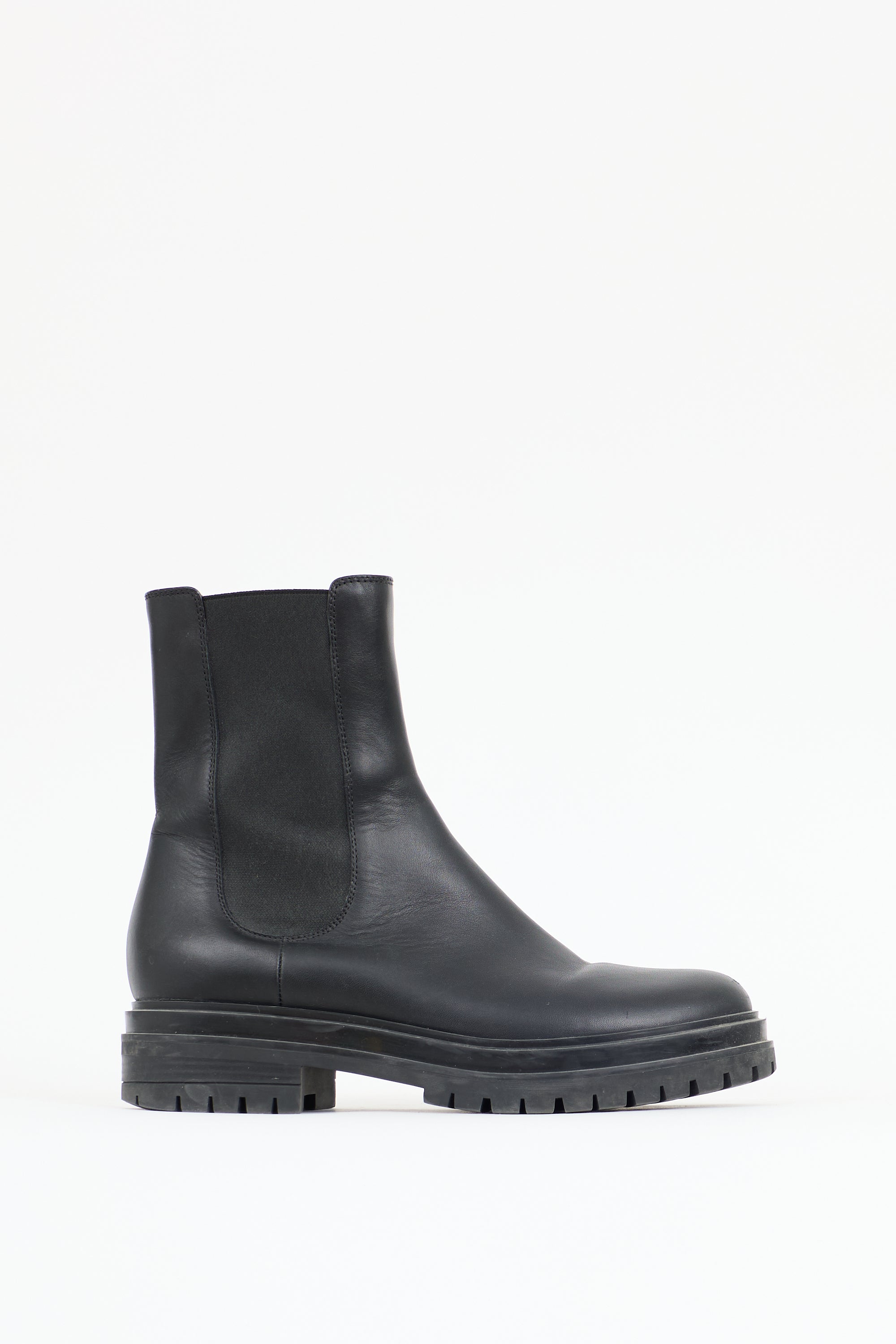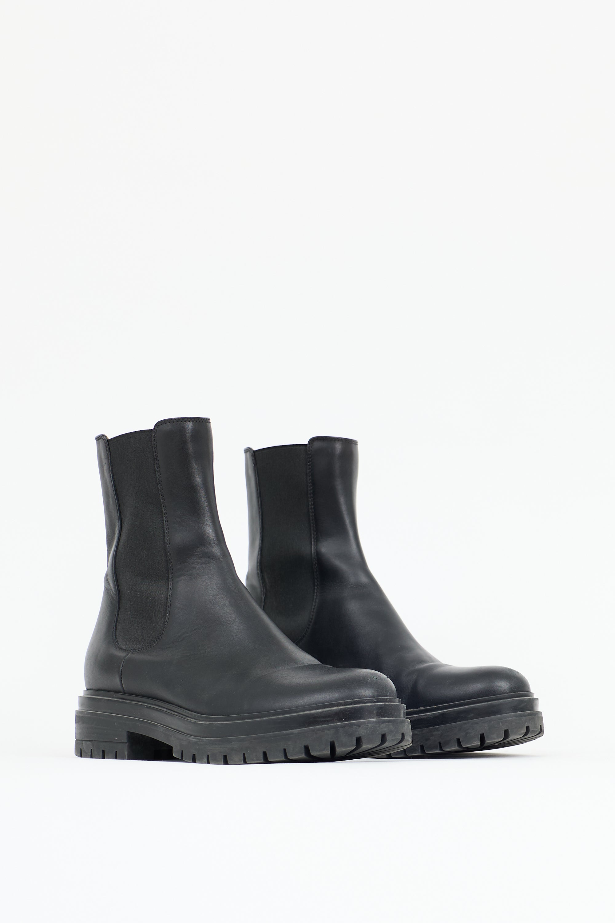 Pre-owned Gianvito Rossi black leather Chelsea boots featuring rounded toe, elastic sides, pull tabs at tongue and counter, and treaded rubber sole.