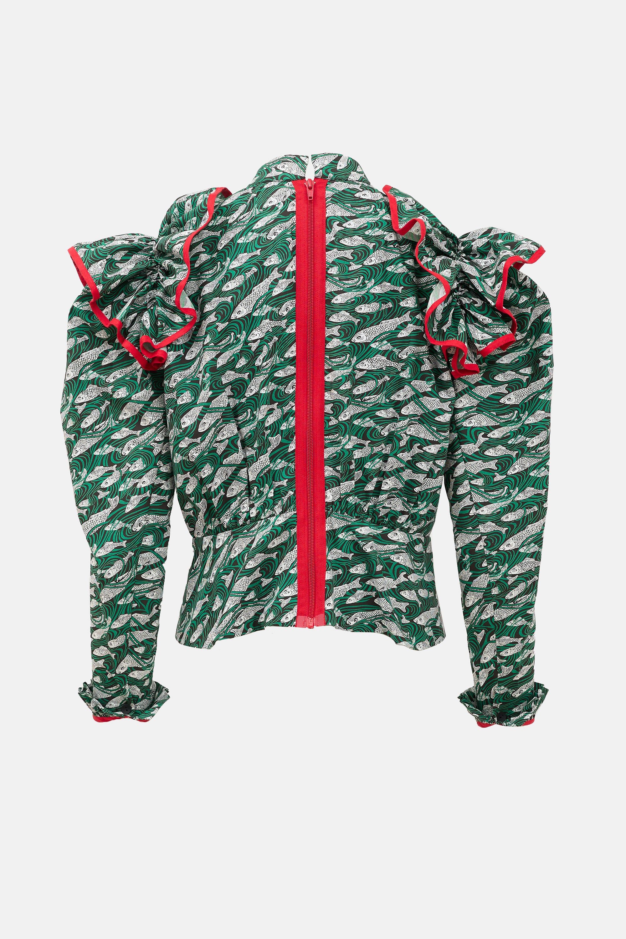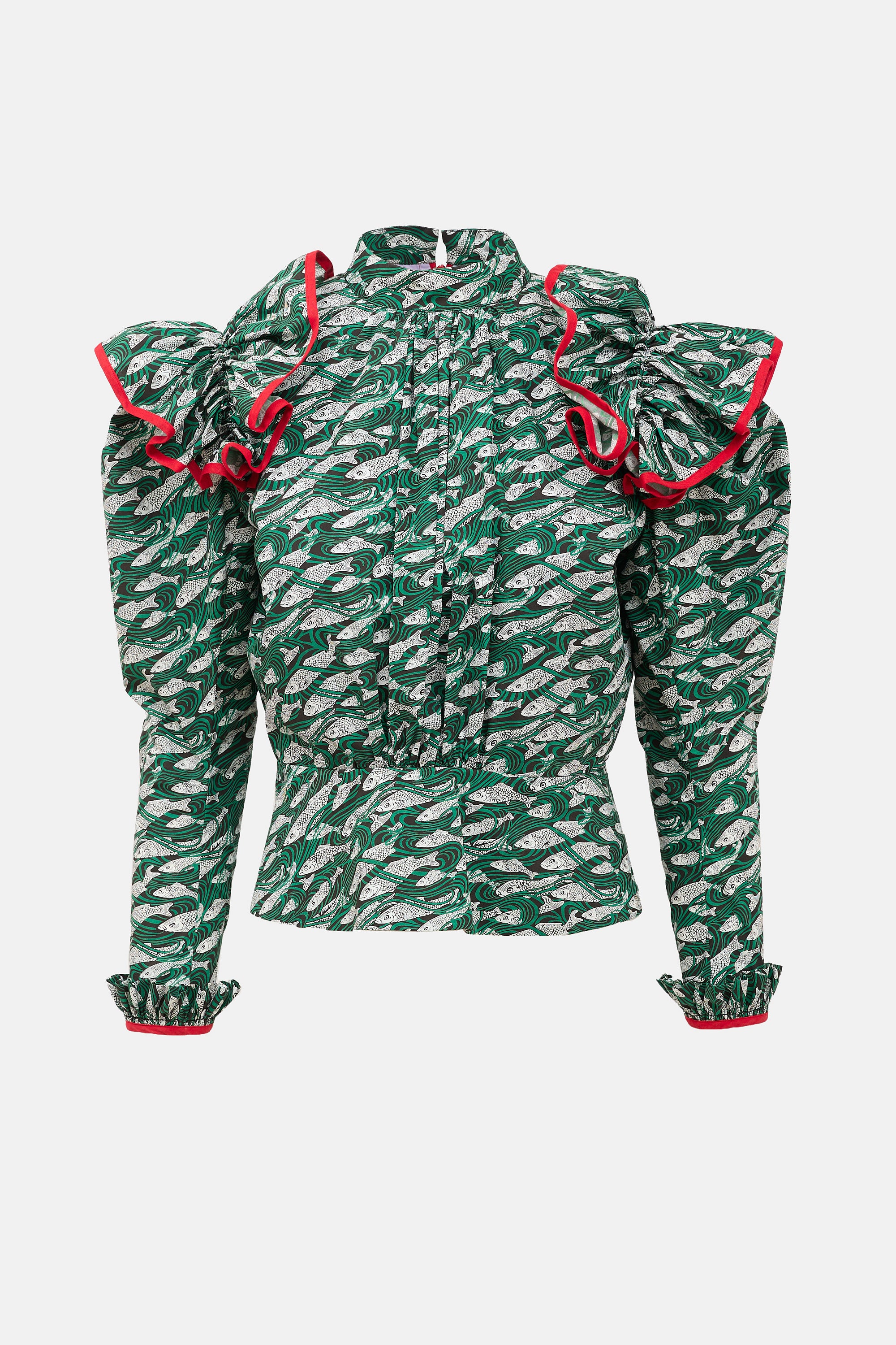 Pre-owned Matty Bovan green blouse featuring white fishprint, red folded trim, ruffled shoulder and cuff, pleated front, and zip closure at back.