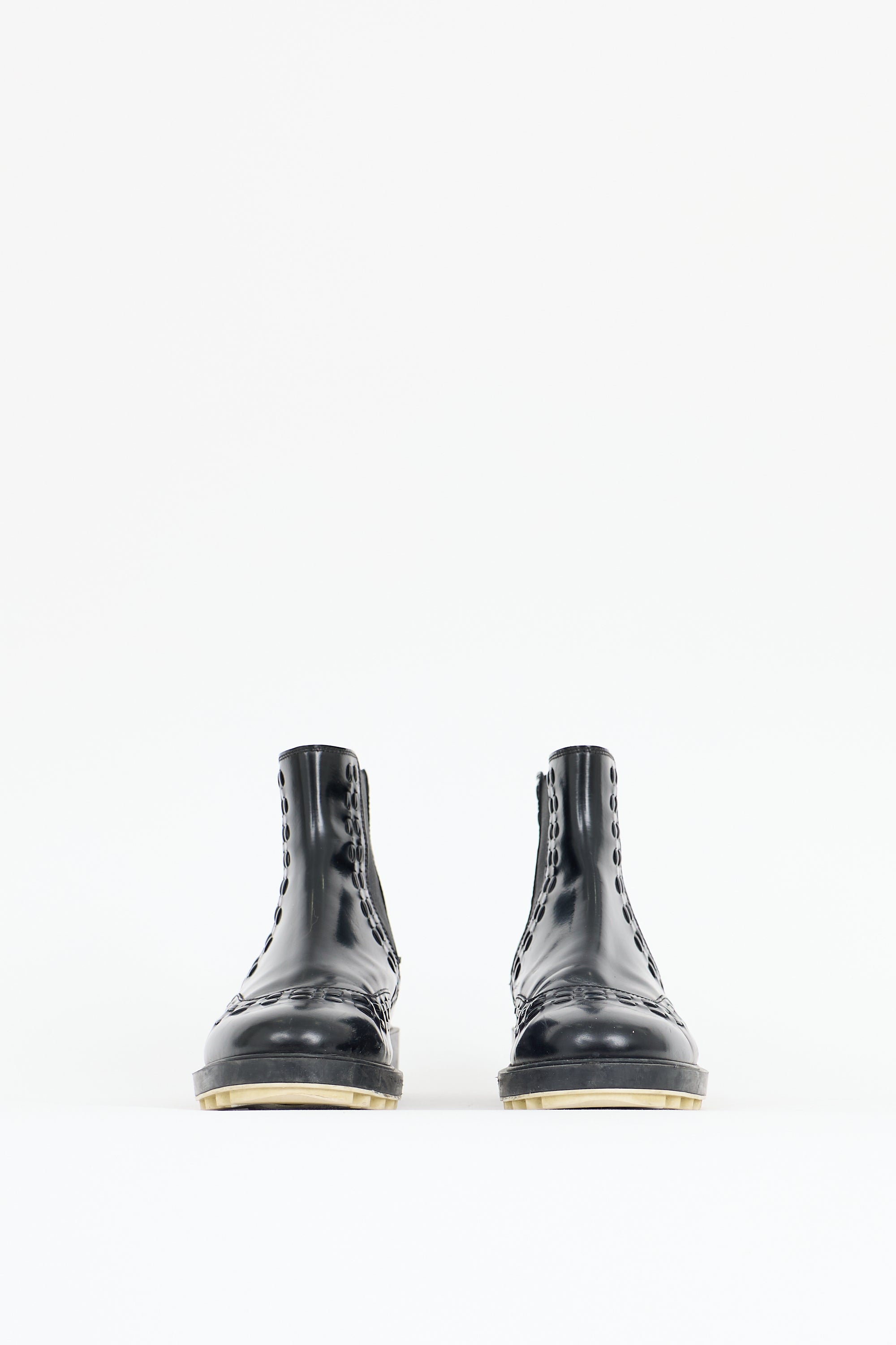 Pre-owned Tod's black leather ankle boots featuring rounded toe, woven detail, elastic sides, and black and cream rubber layered sole.