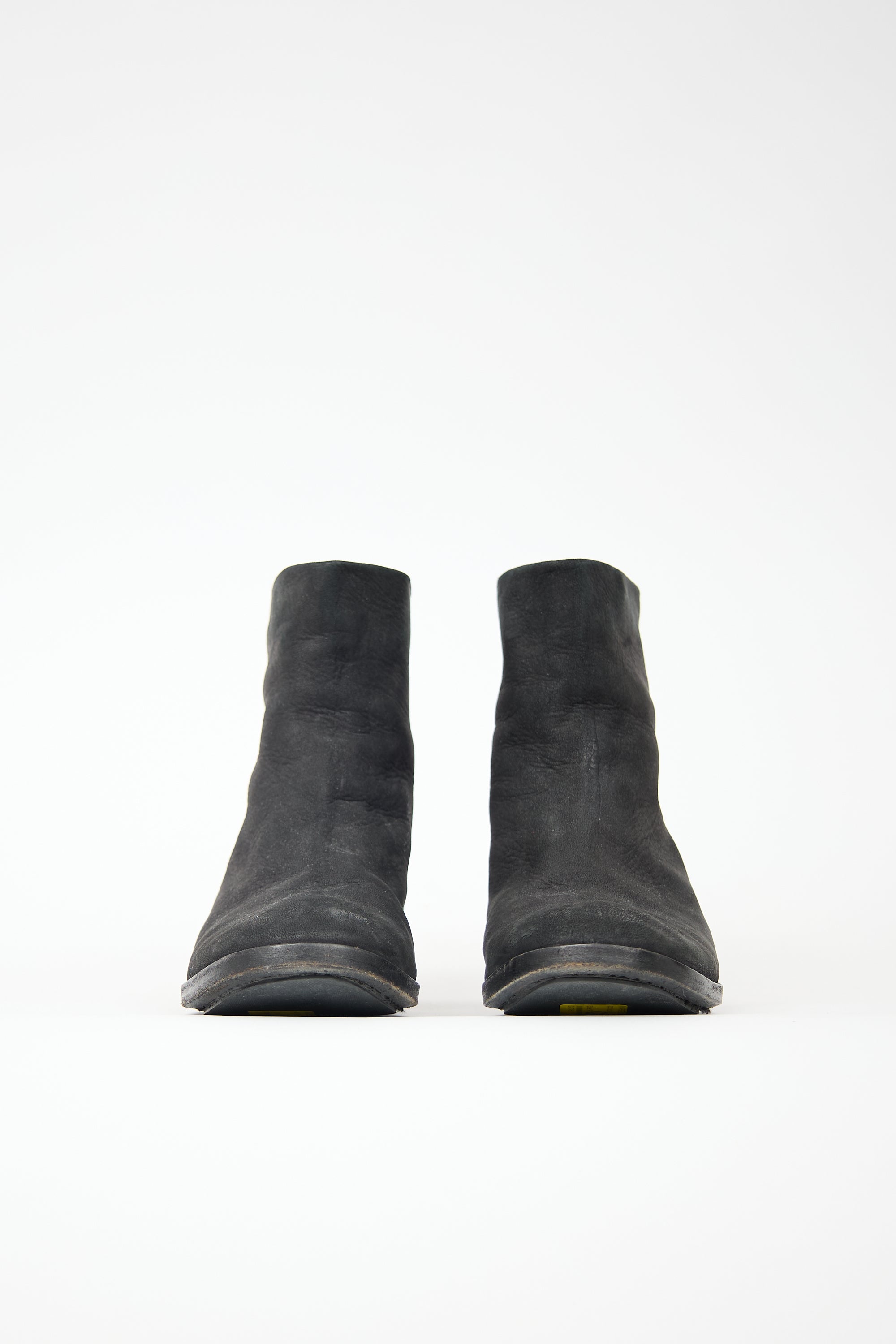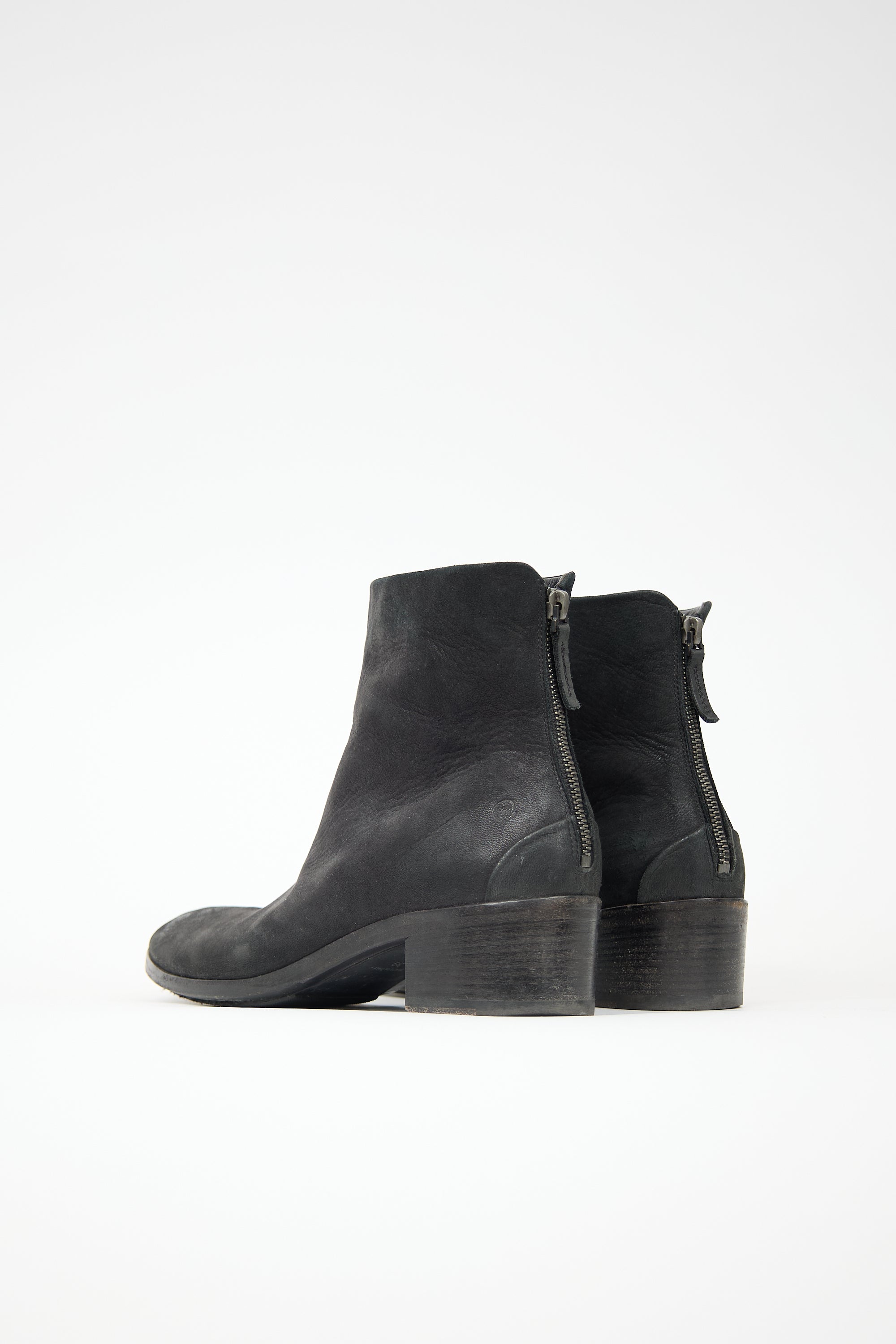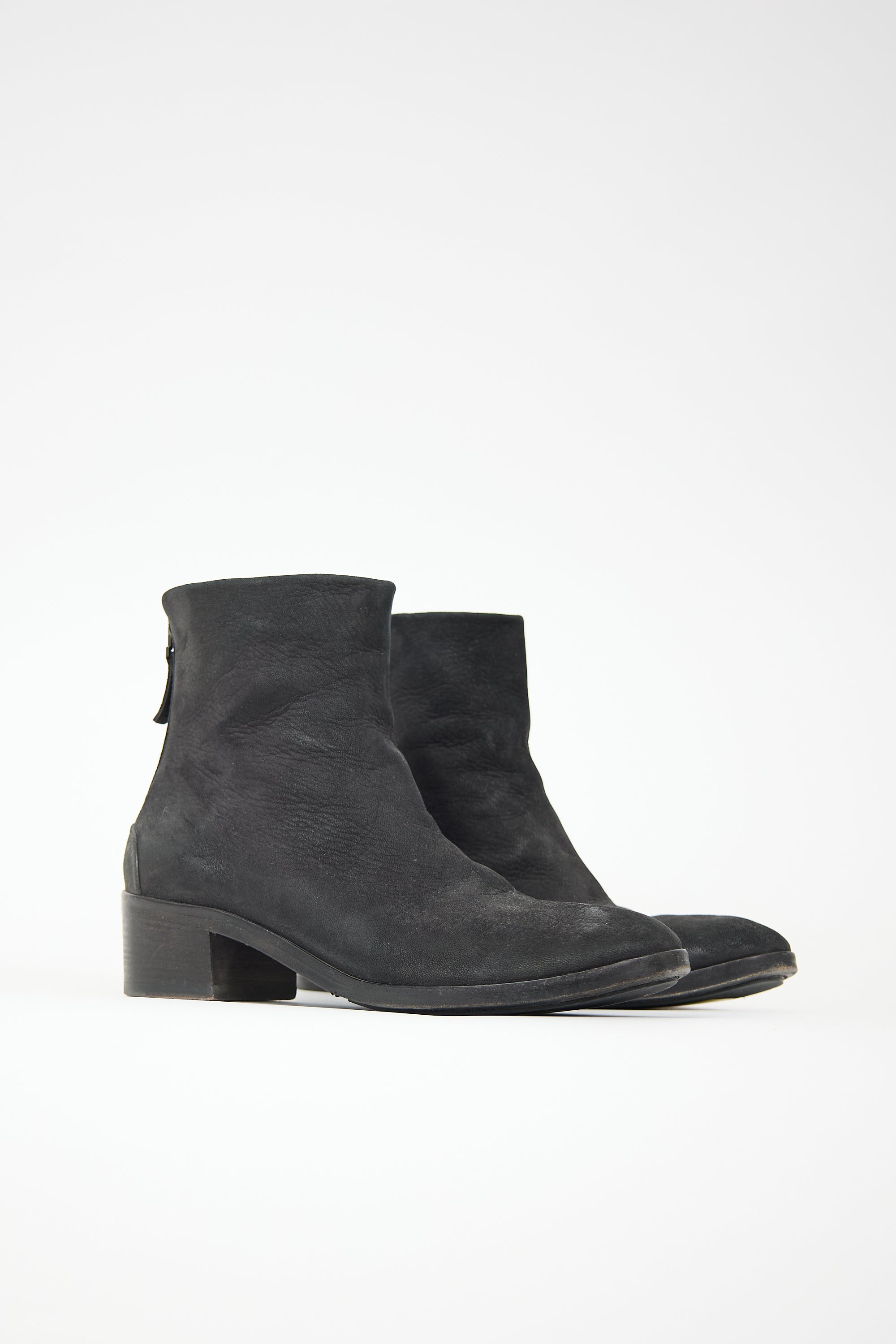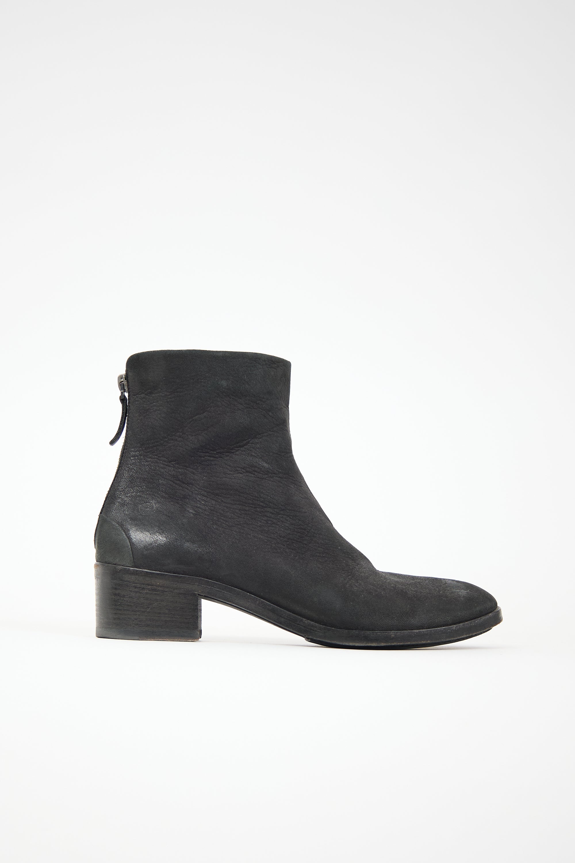 Pre-owned Marsèll black suede ankle boot featuring a rounded toe, back zip closure, and a stacked heel.