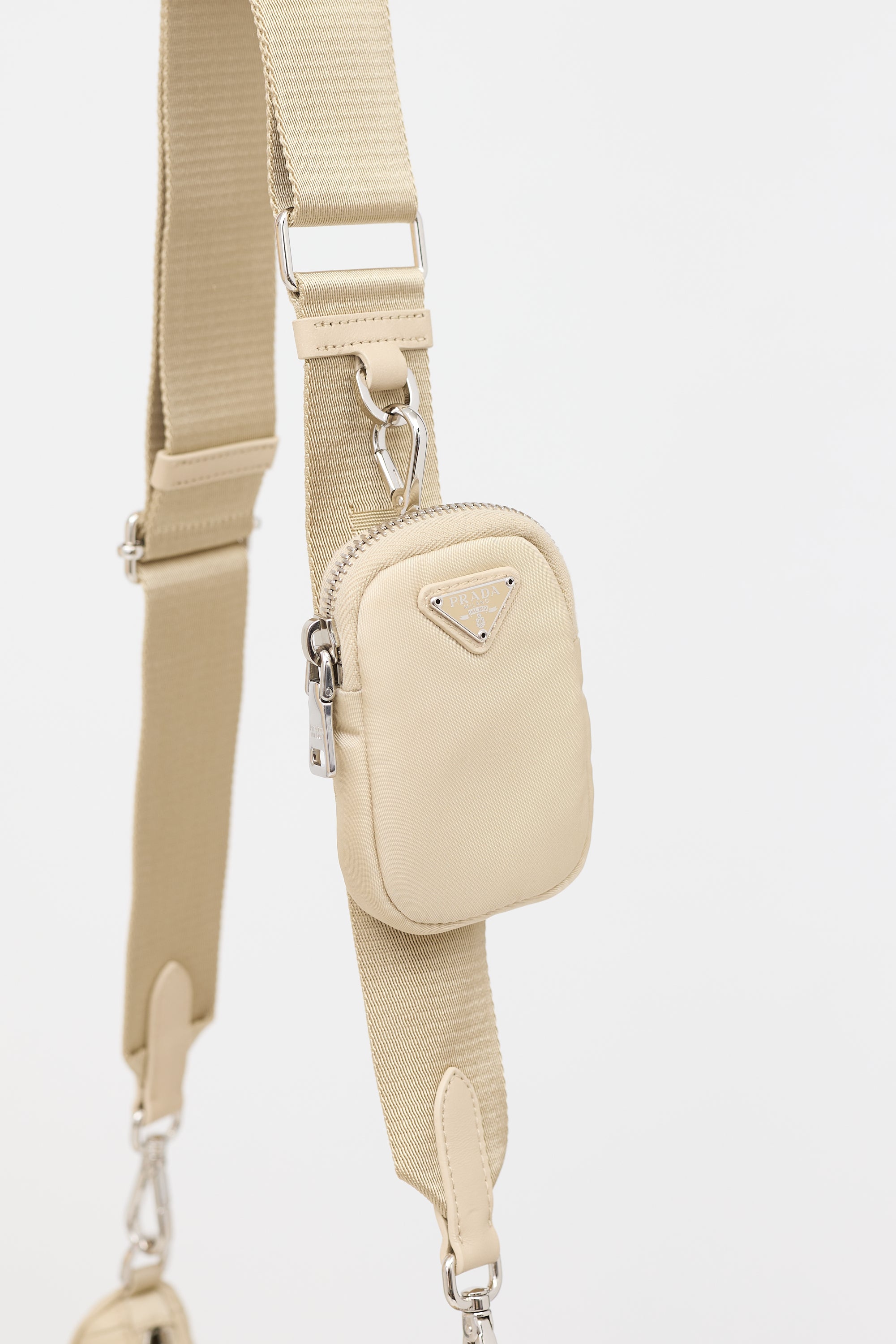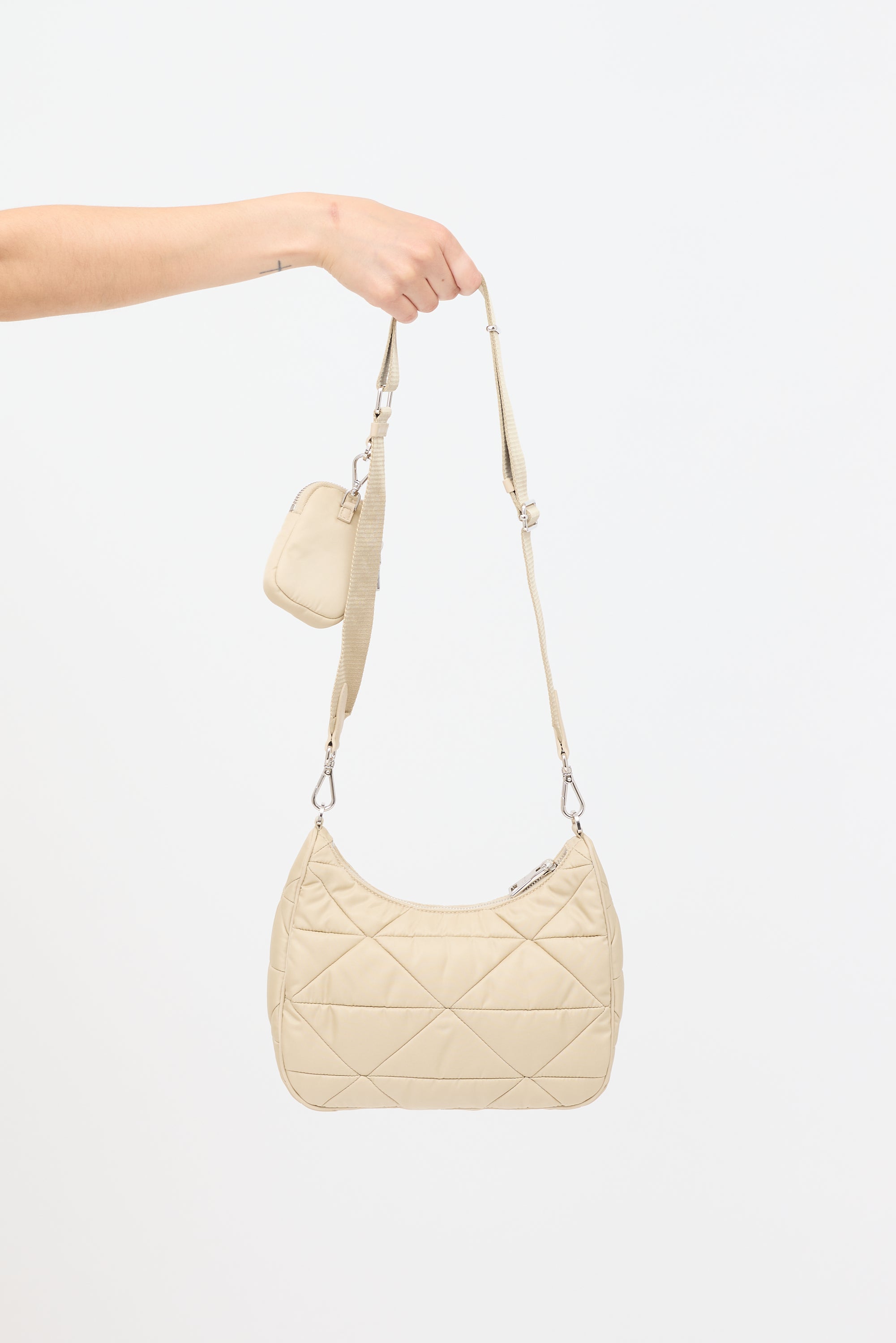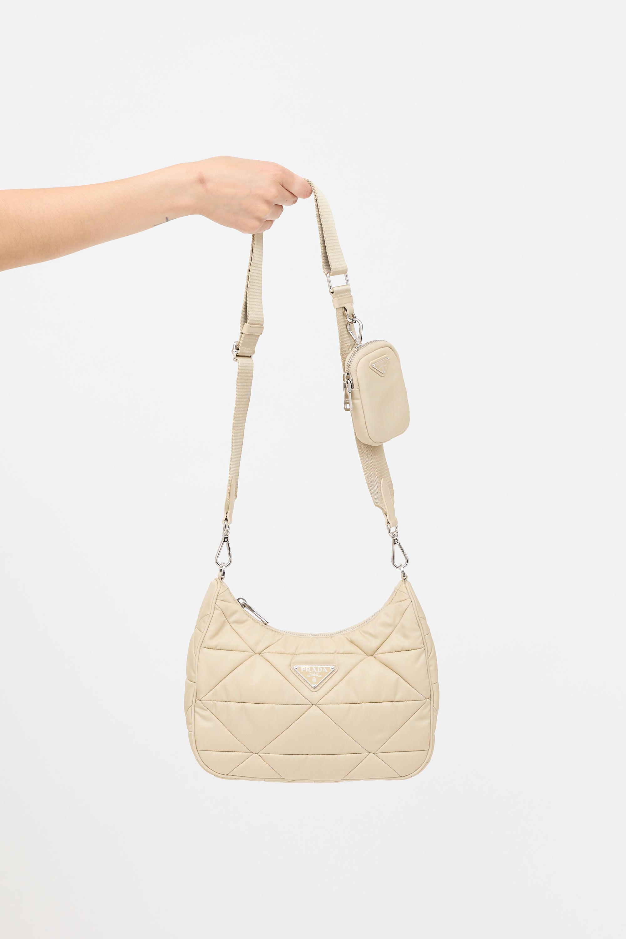 Pre-owned Prada beige Re-Edition 2005 shoulder bag featuring a padded nylon body, silver tone hardware, signature enameled triangle logo plaque at front, adjustable and detachable grosgrain strap, top zip closure, one lined main compartment with zip pocket, and detachable matching coin pouch with zip closure. Comes with original dust bags.