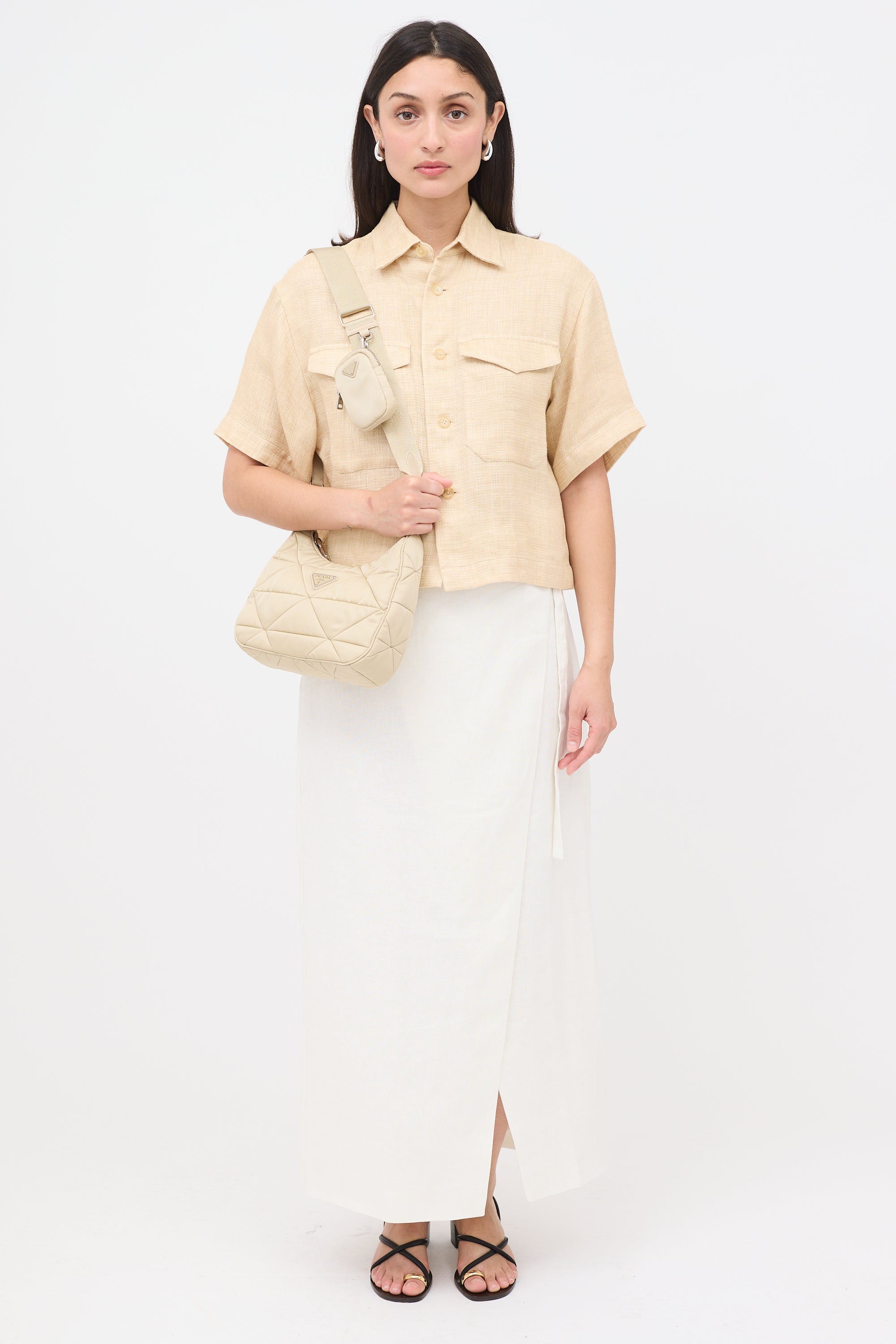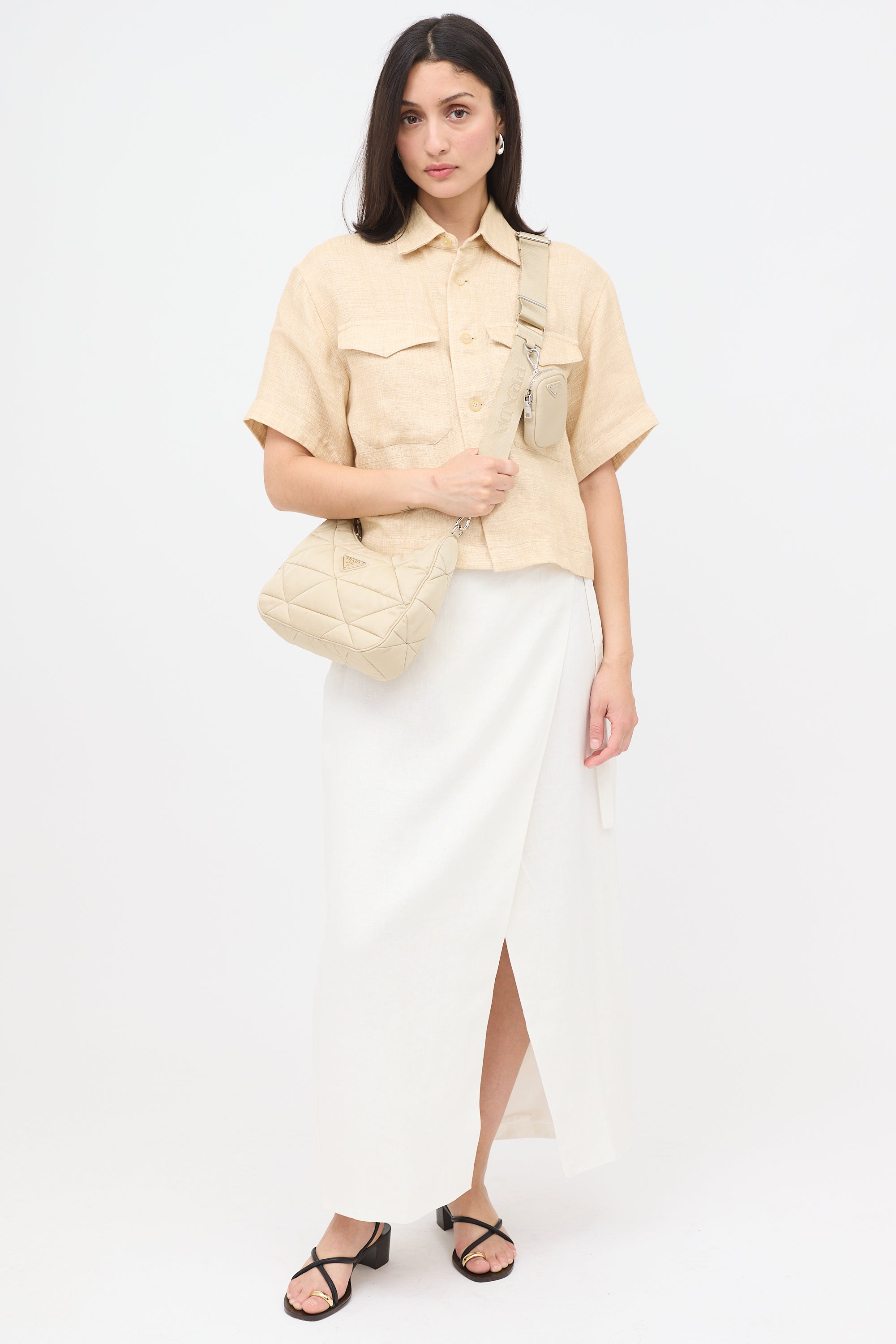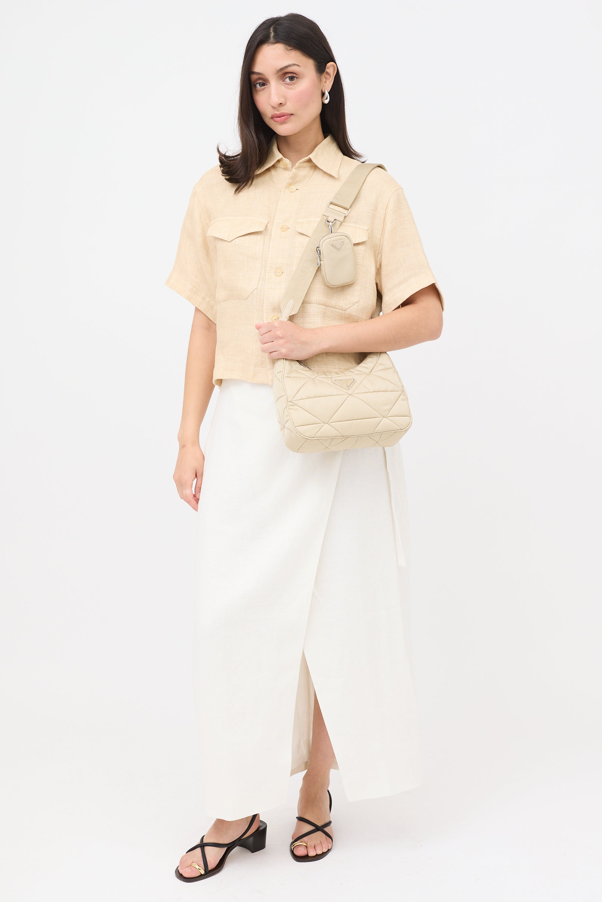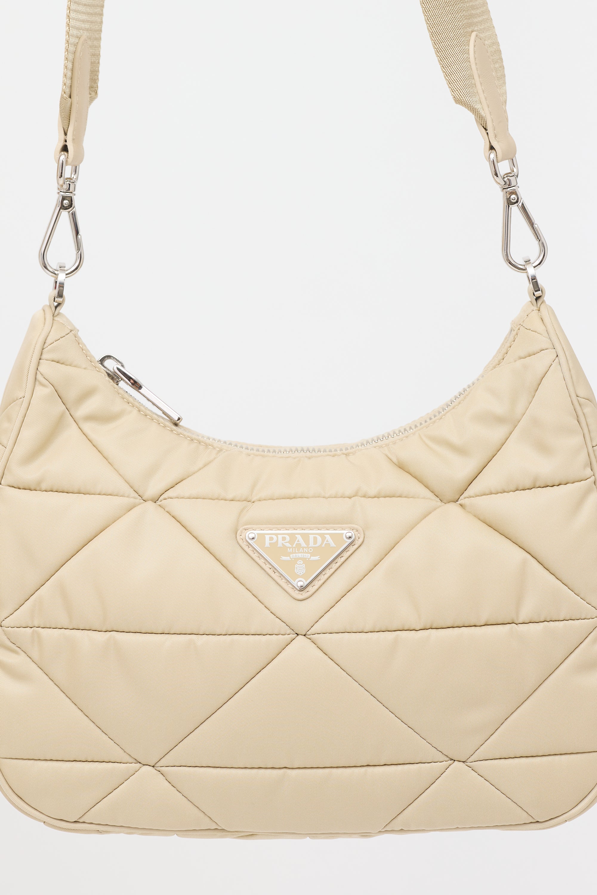 Pre-owned Prada beige Re-Edition 2005 shoulder bag featuring a padded nylon body, silver tone hardware, signature enameled triangle logo plaque at front, adjustable and detachable grosgrain strap, top zip closure, one lined main compartment with zip pocket, and detachable matching coin pouch with zip closure. Comes with original dust bags.