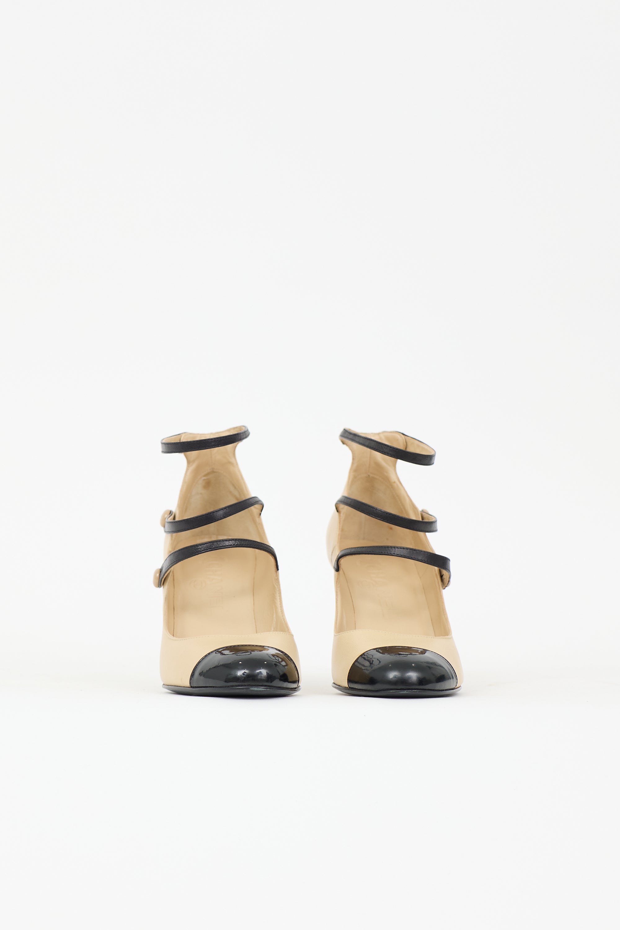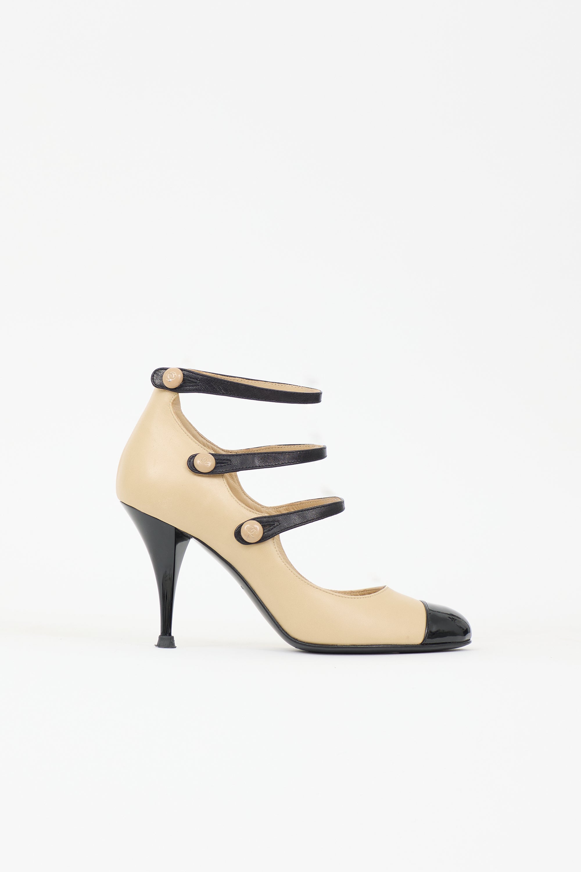 Pre-owned Chanel beige and black leather pump featuring a rounded cap toe, straps across instep with CC embossed button closure, and comma heel. Comes with original dust bag and box.