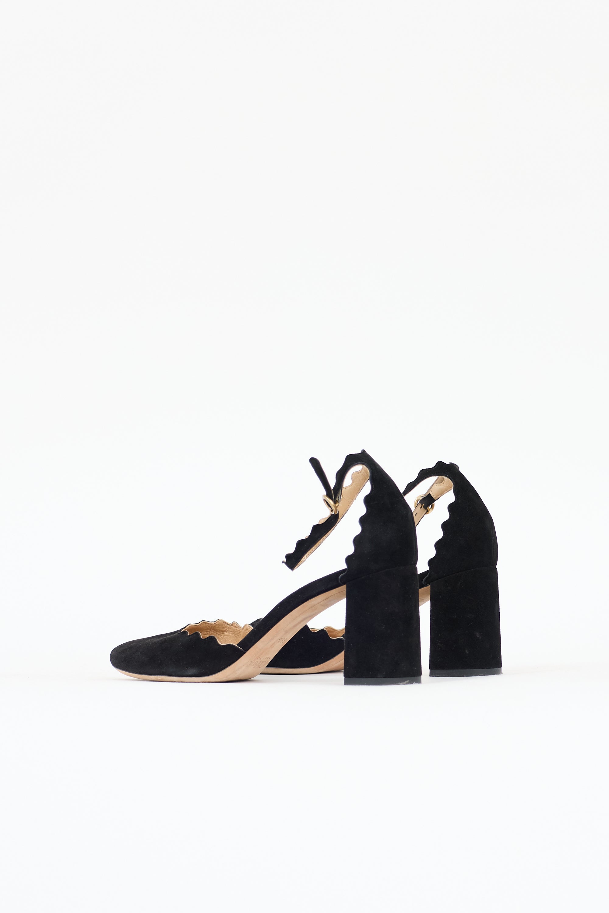 Pre-owned Chloé black suede Lauren pump featuring an almond toe, scalloped edges, adjustable ankle strap with gold tone buckle, and a covered block heel.