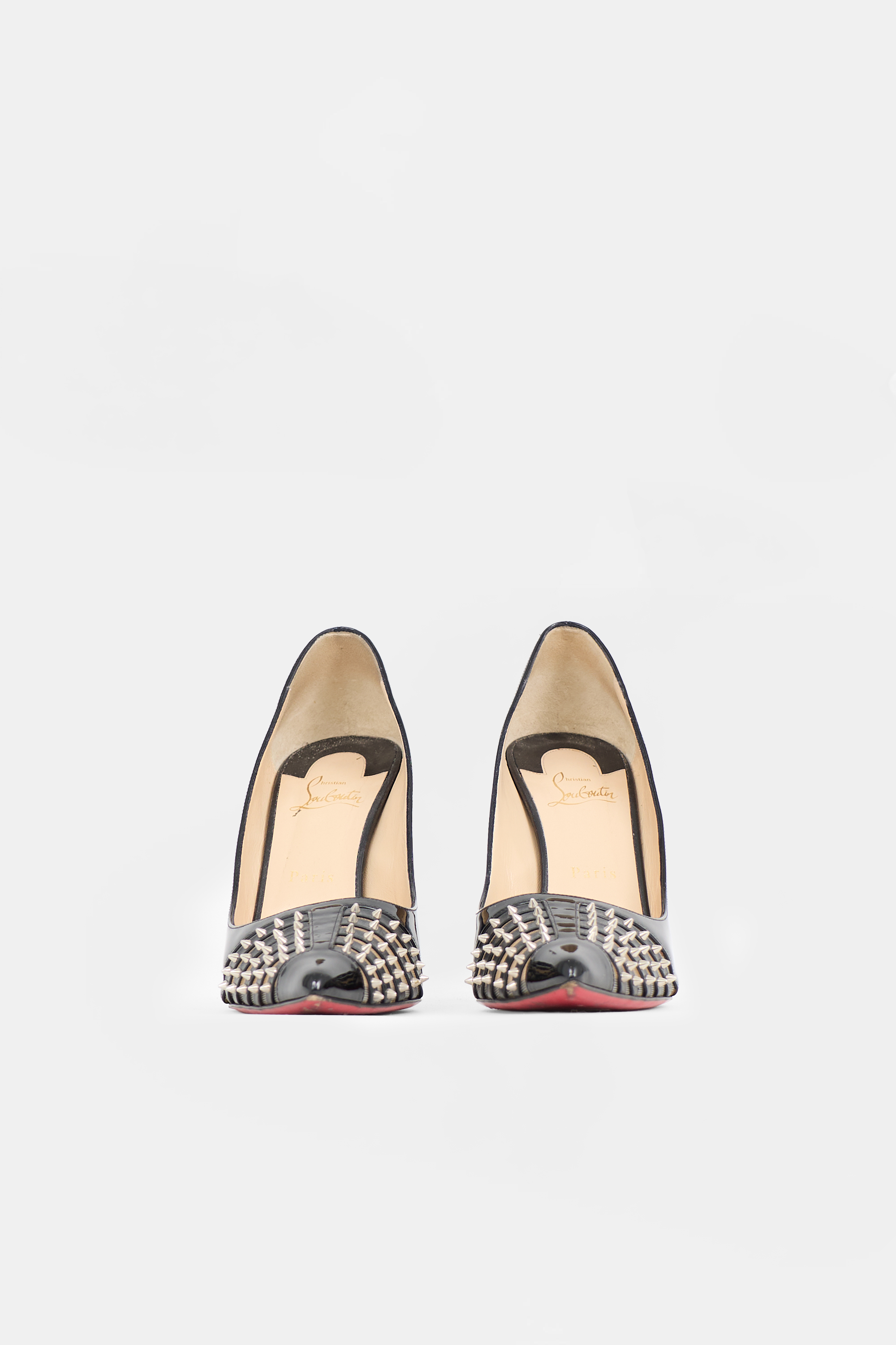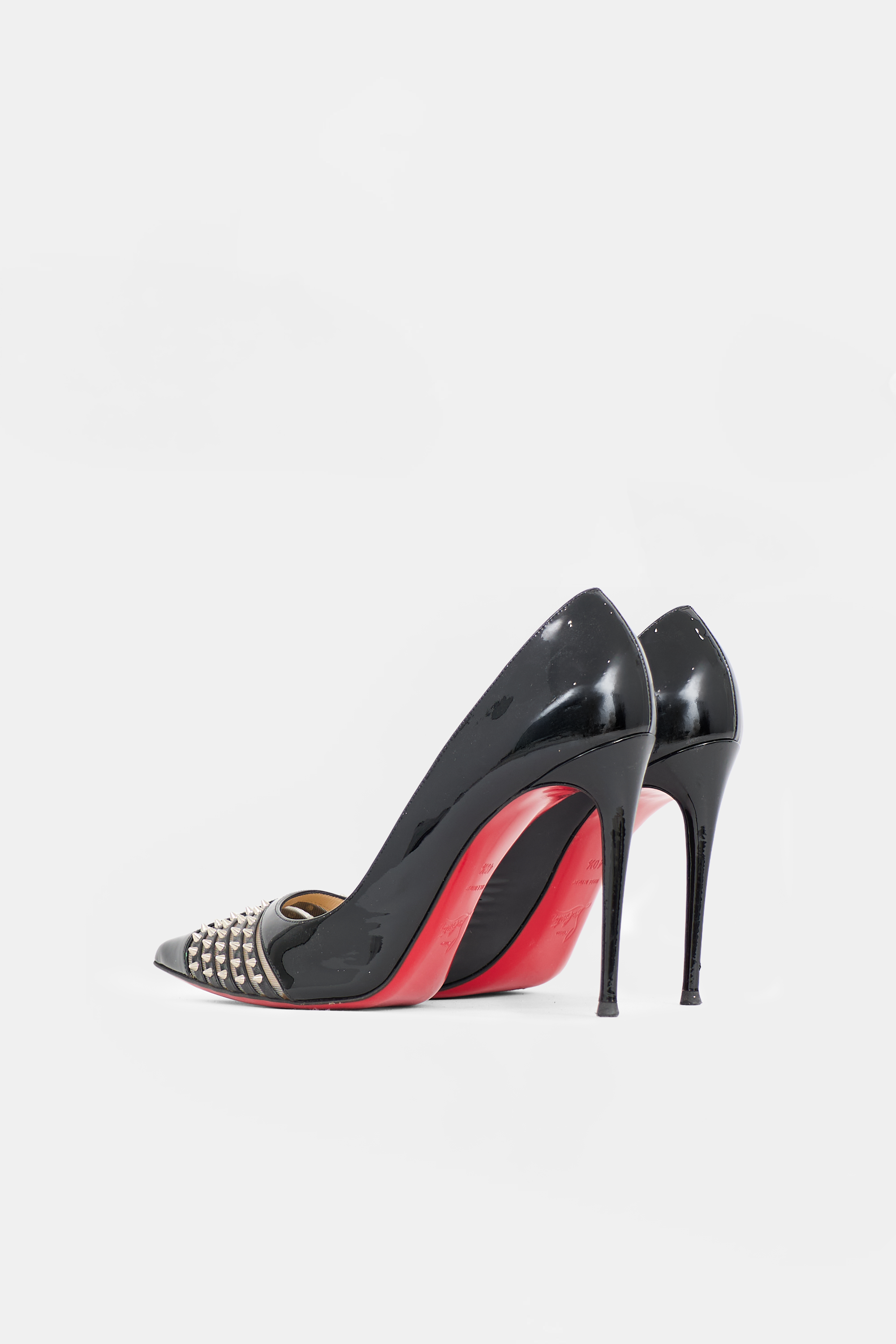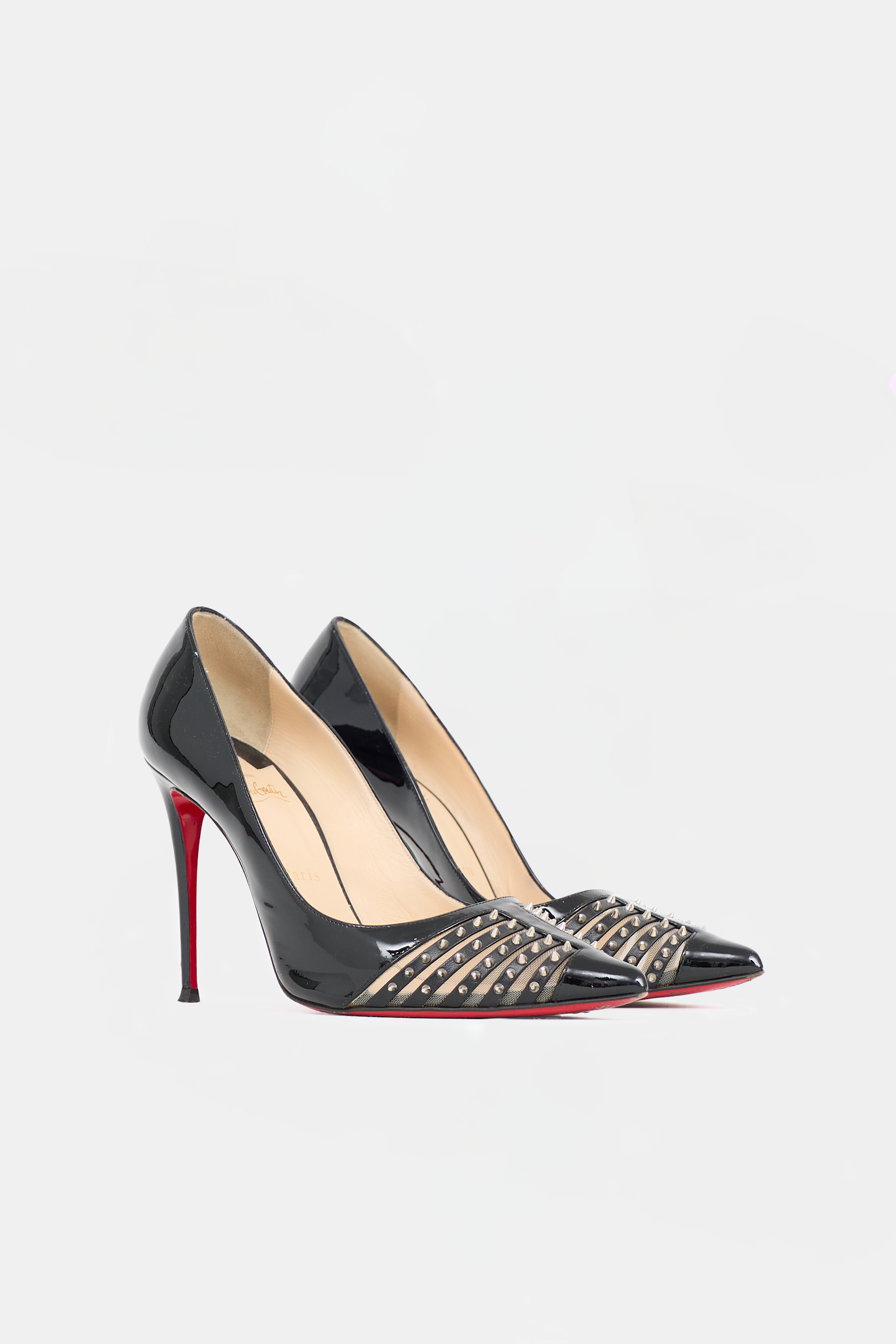 Pre-owned Christian Louboutin black patent leather Baretta pumps featuring pointed toe, cut out vamp with mesh panel and spike embellishments, covered stiletto heel, and signature red lacquered outsole.