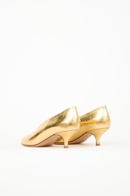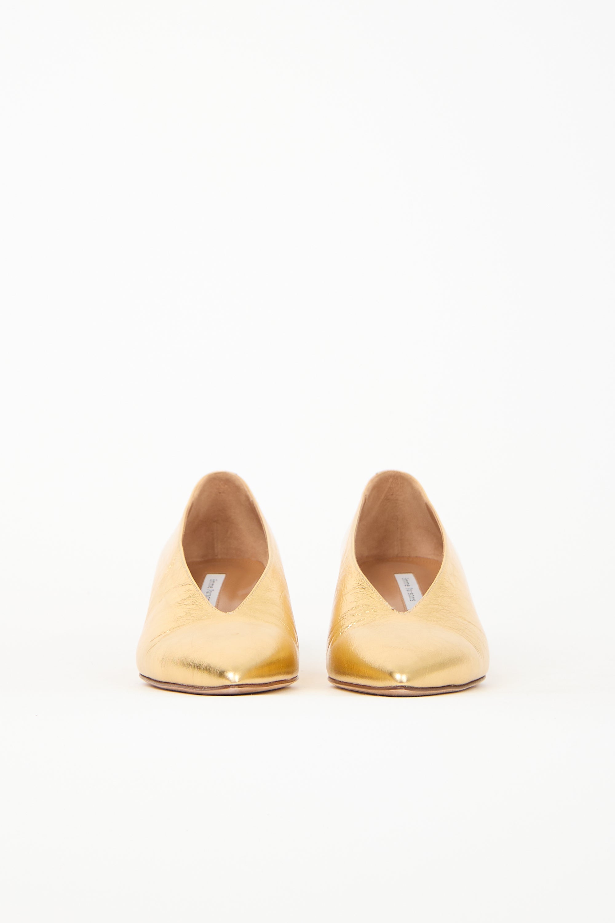 Pre-owned Emme Parsons gold leather Veneto pumps featuring pointed toe, V-collar, and kitten heel. Includes original dust bag and box.