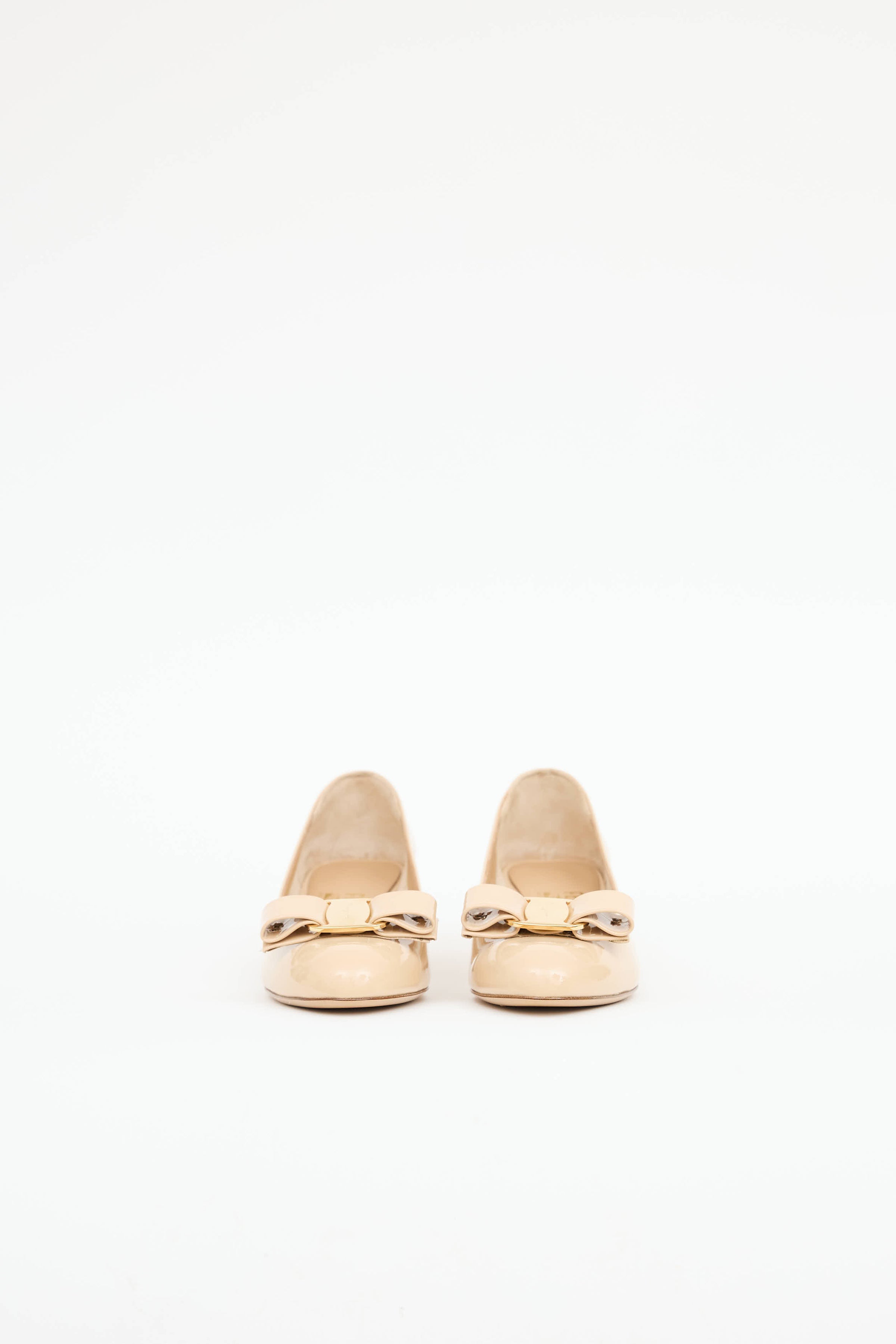 Pre-owned Ferragamo beige patent leather Vara Bow pumps featuring rounded toe, bow with gold tone bar at vamp, and covered block heel.