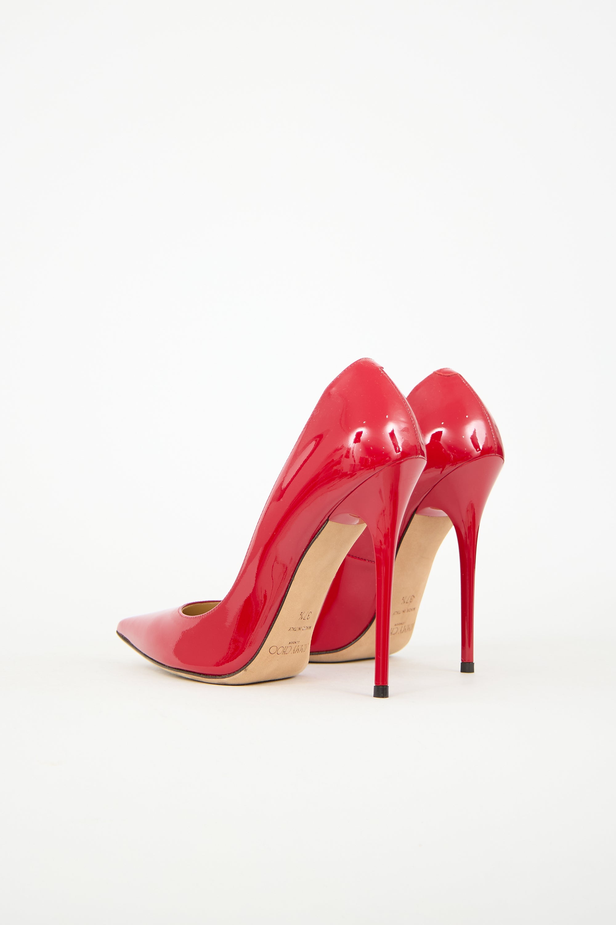 Pre-owned Jimmy Choo red patent leather Anouk pumps featuring pointed toe, covered stiletto heel, and leather insole and outsole. Comes with original dust bag.