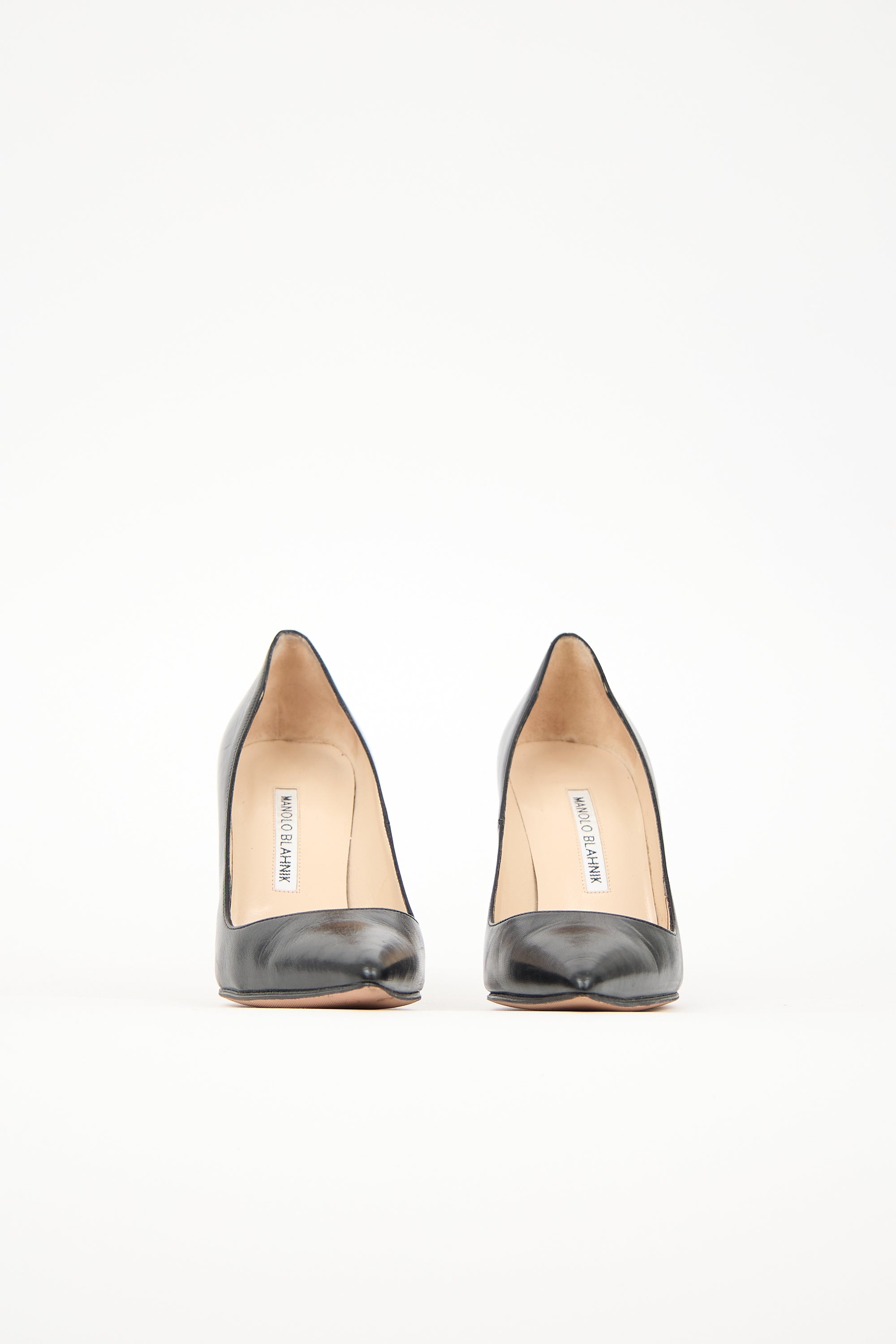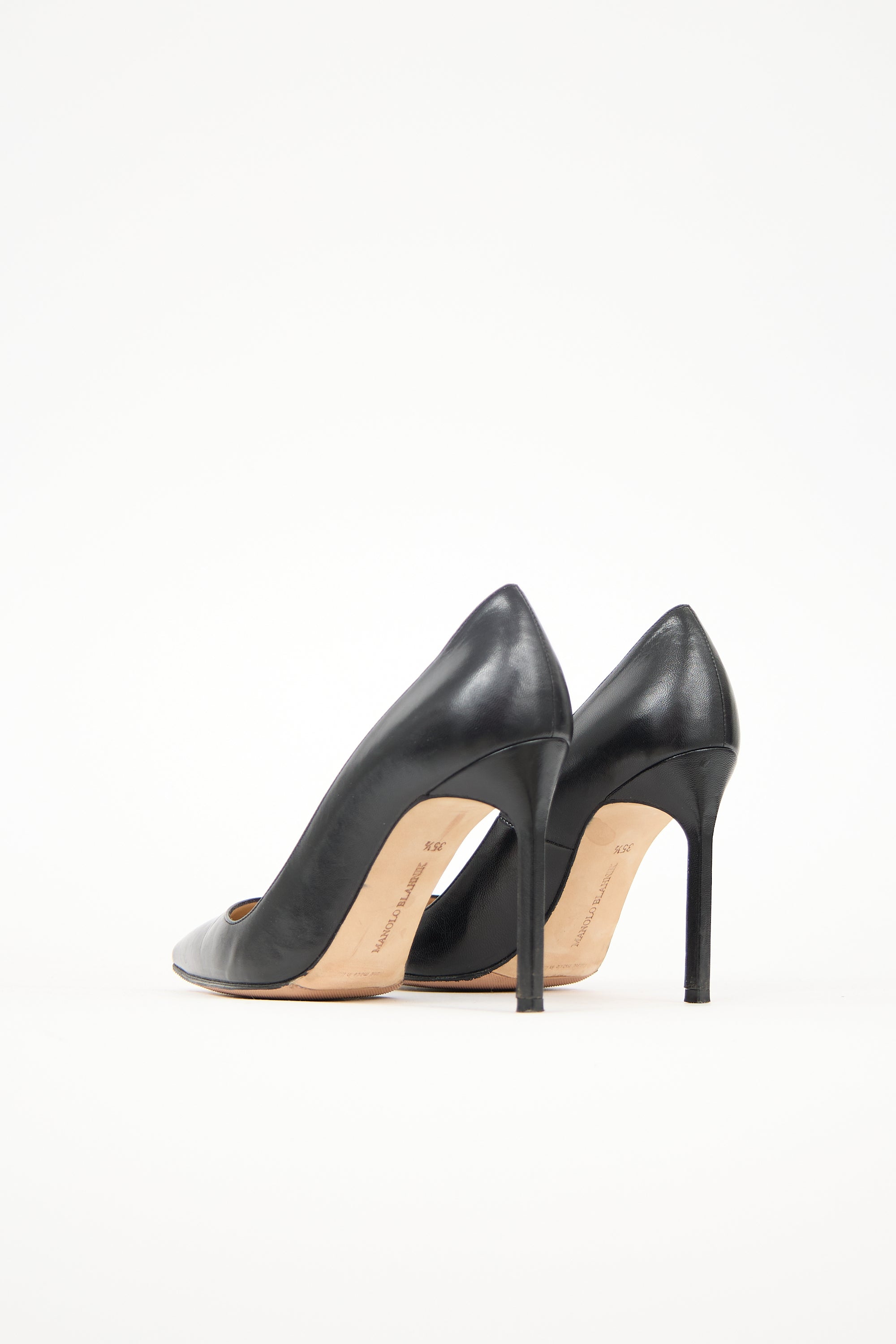 Pre-owned Manolo Blahnik black leather BB pumps featuring pointed toe, covered stiletto heel, and leather insole and outsole. Comes with original dust bag.