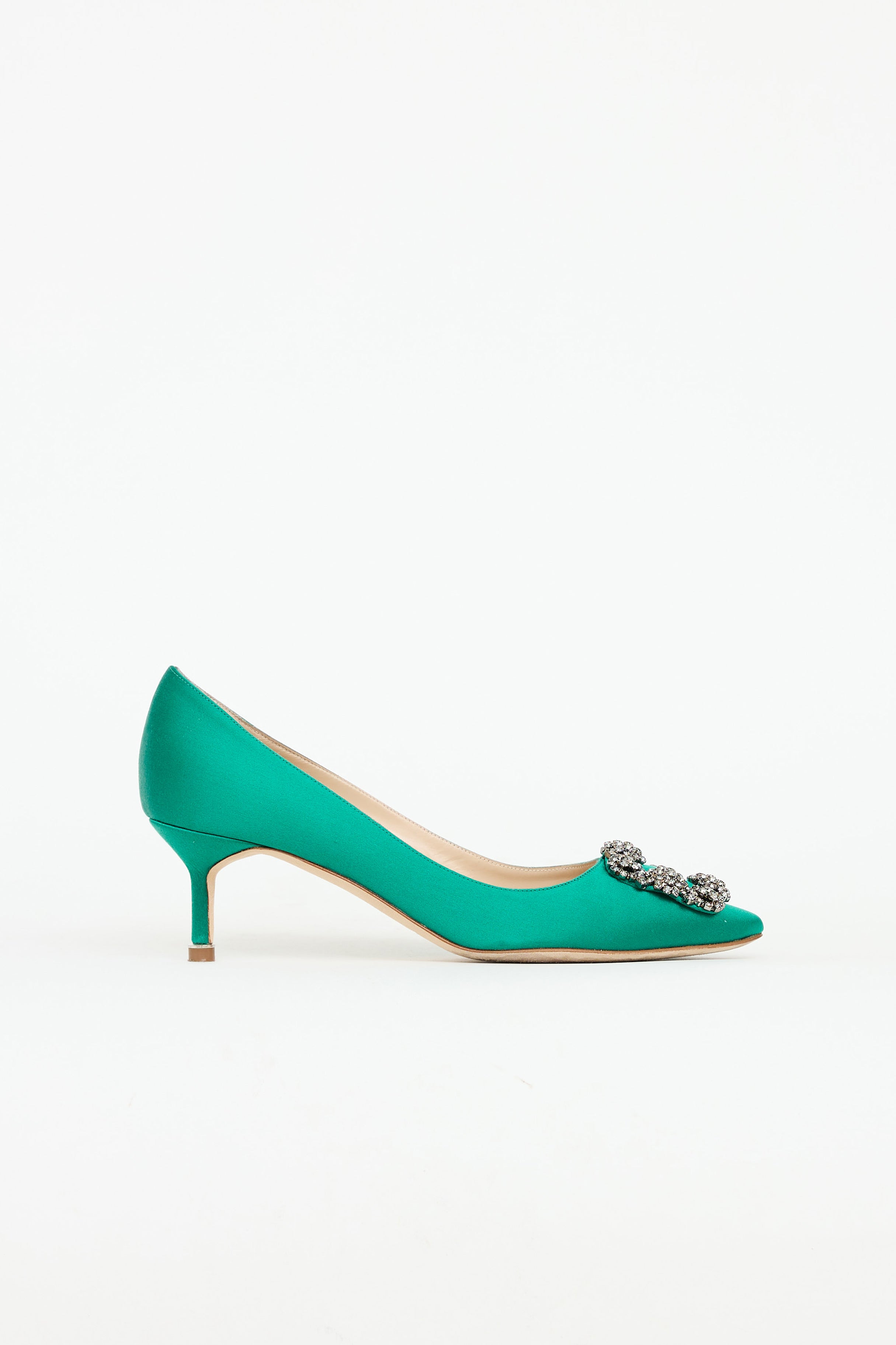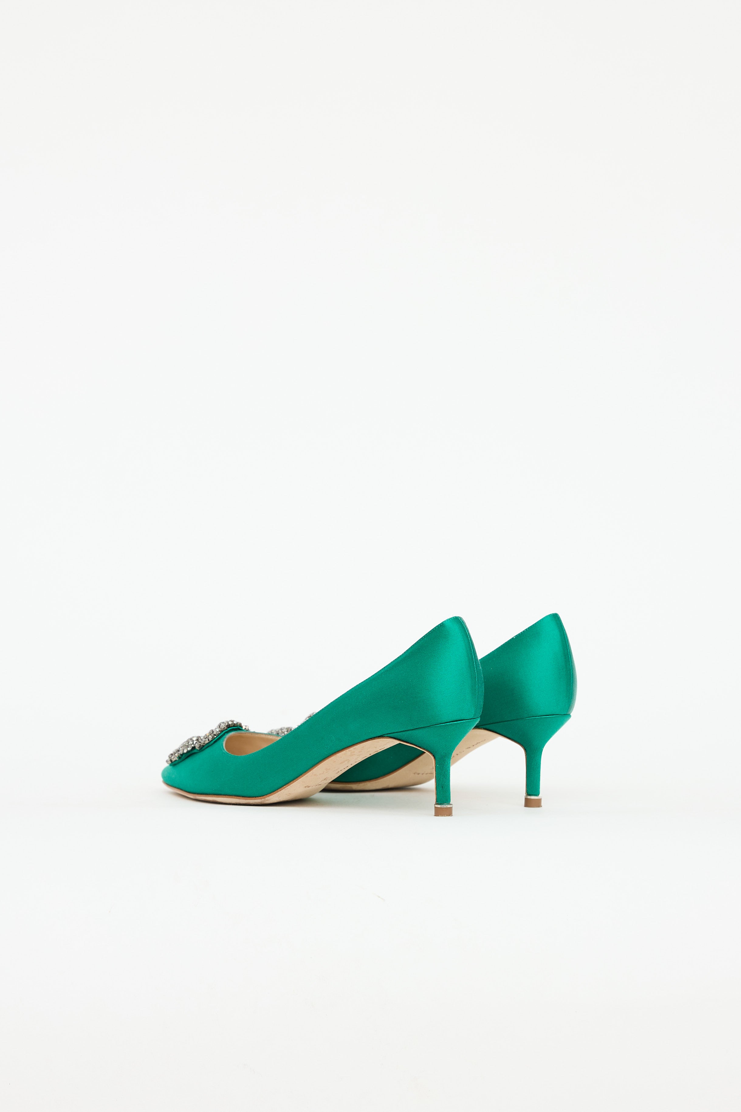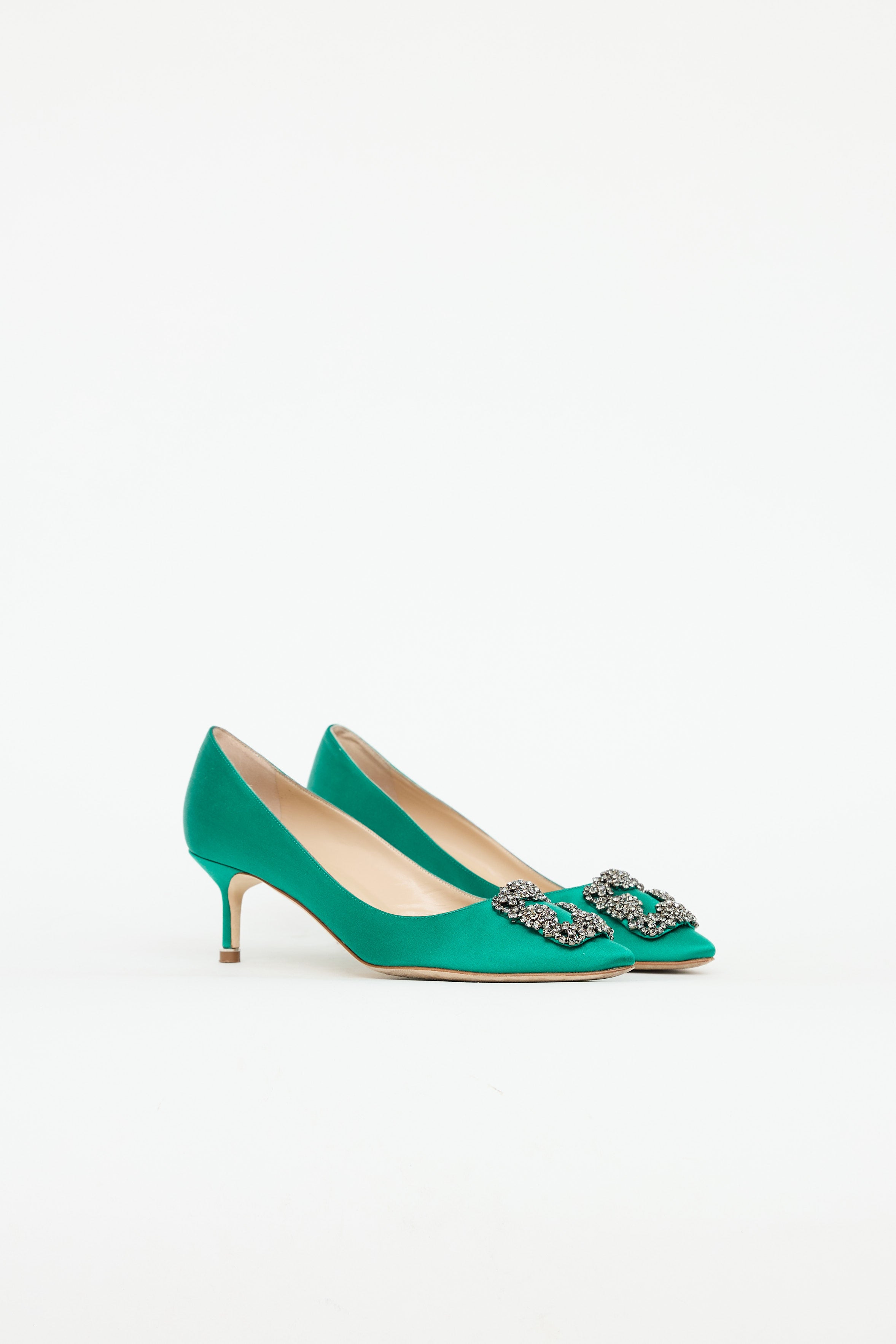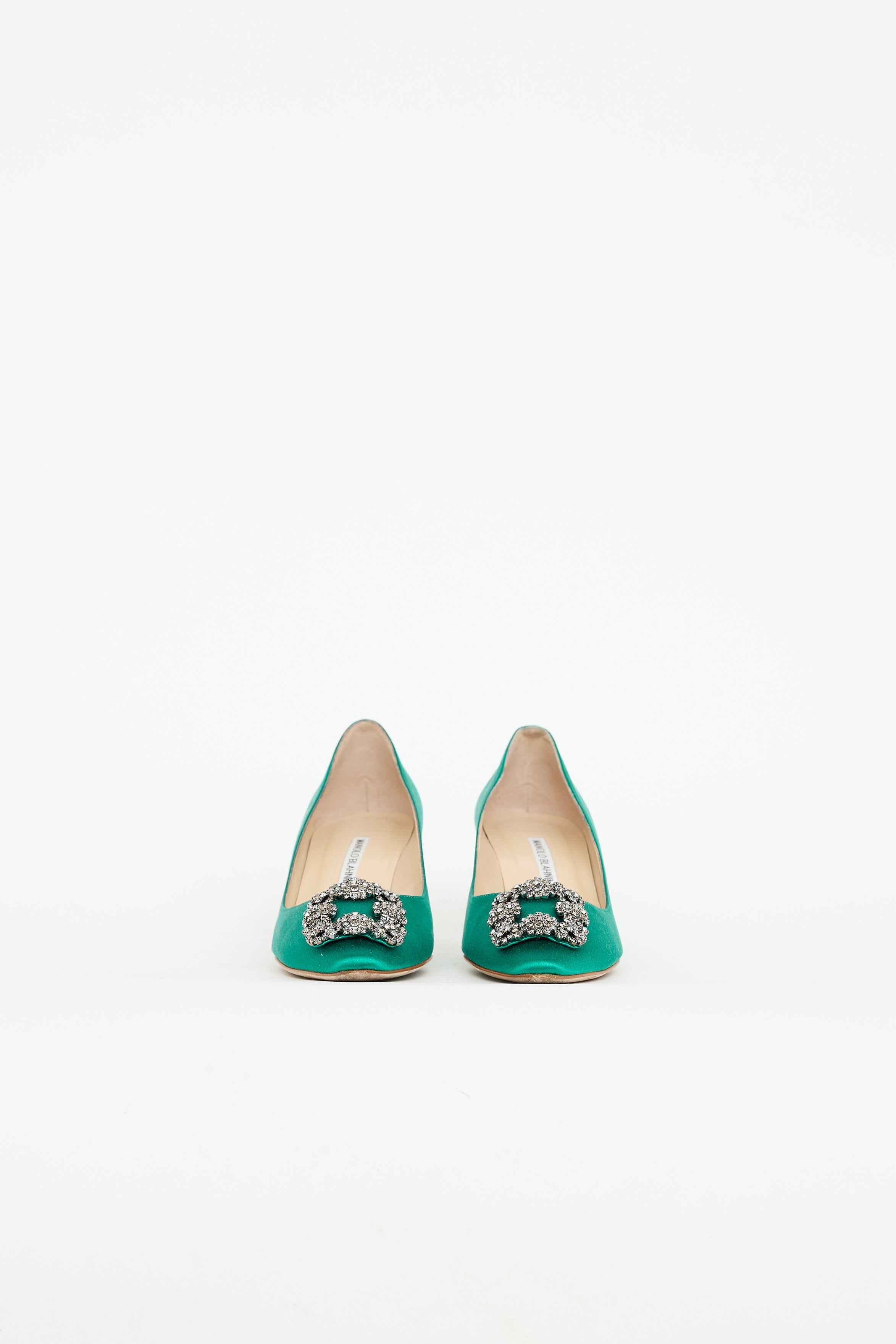 Pre-owned Manolo Blahnik green satin Hangisi pumps featuring a pointed toe, green satin upper, signature Hangisi embellishment on toe box, satin wrapped heel, and leather outsole.