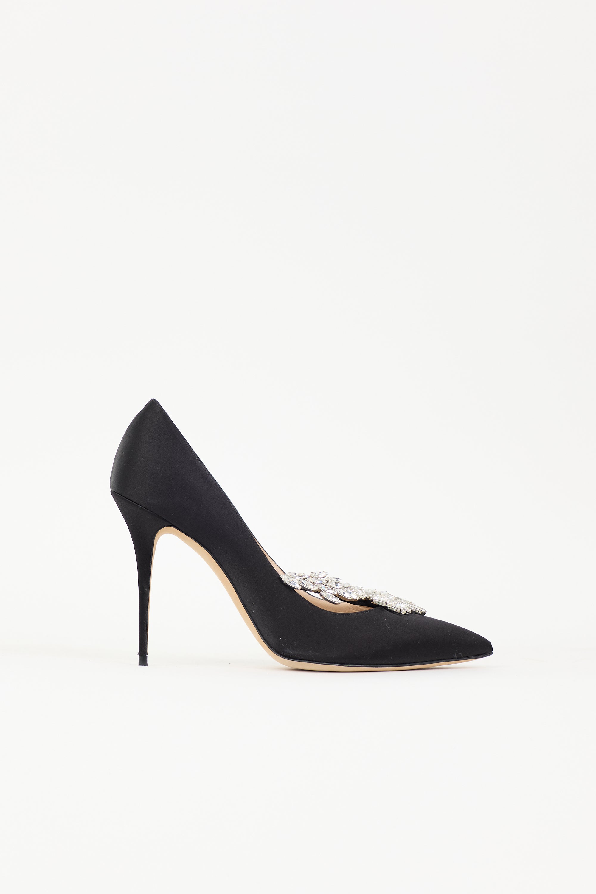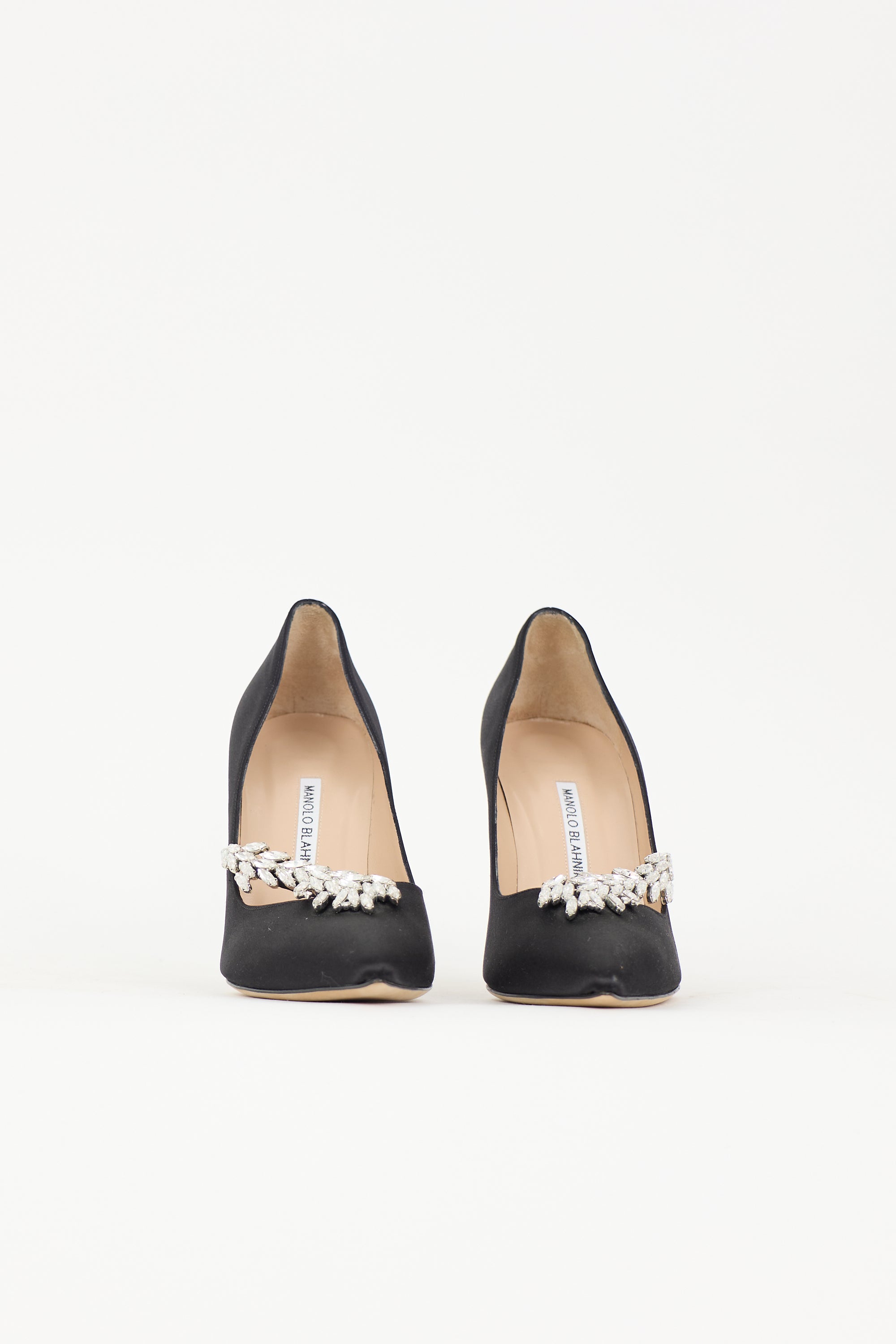 Pre-owned Manolo Blahnik black satin Nadira pumps featuring a pointed toe, crystal embellishment across vamp, and covered stiletto heel.