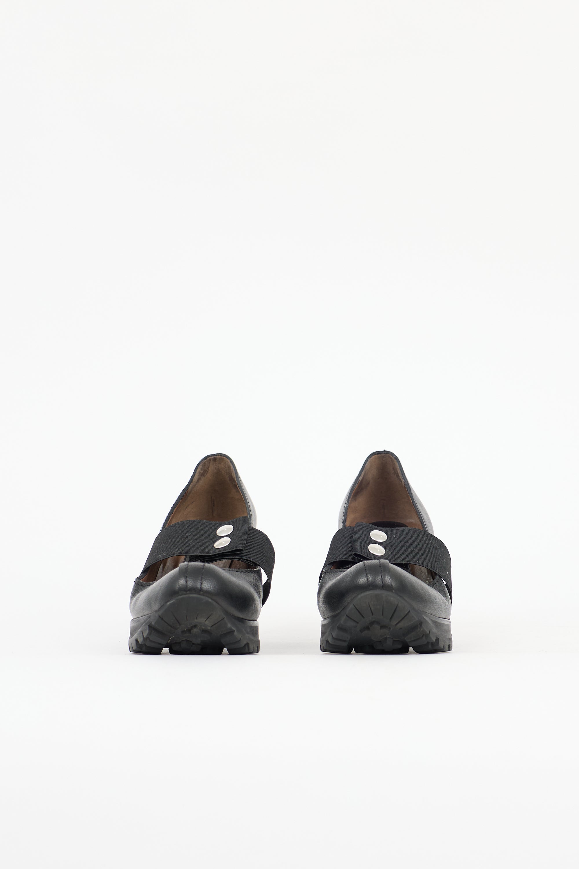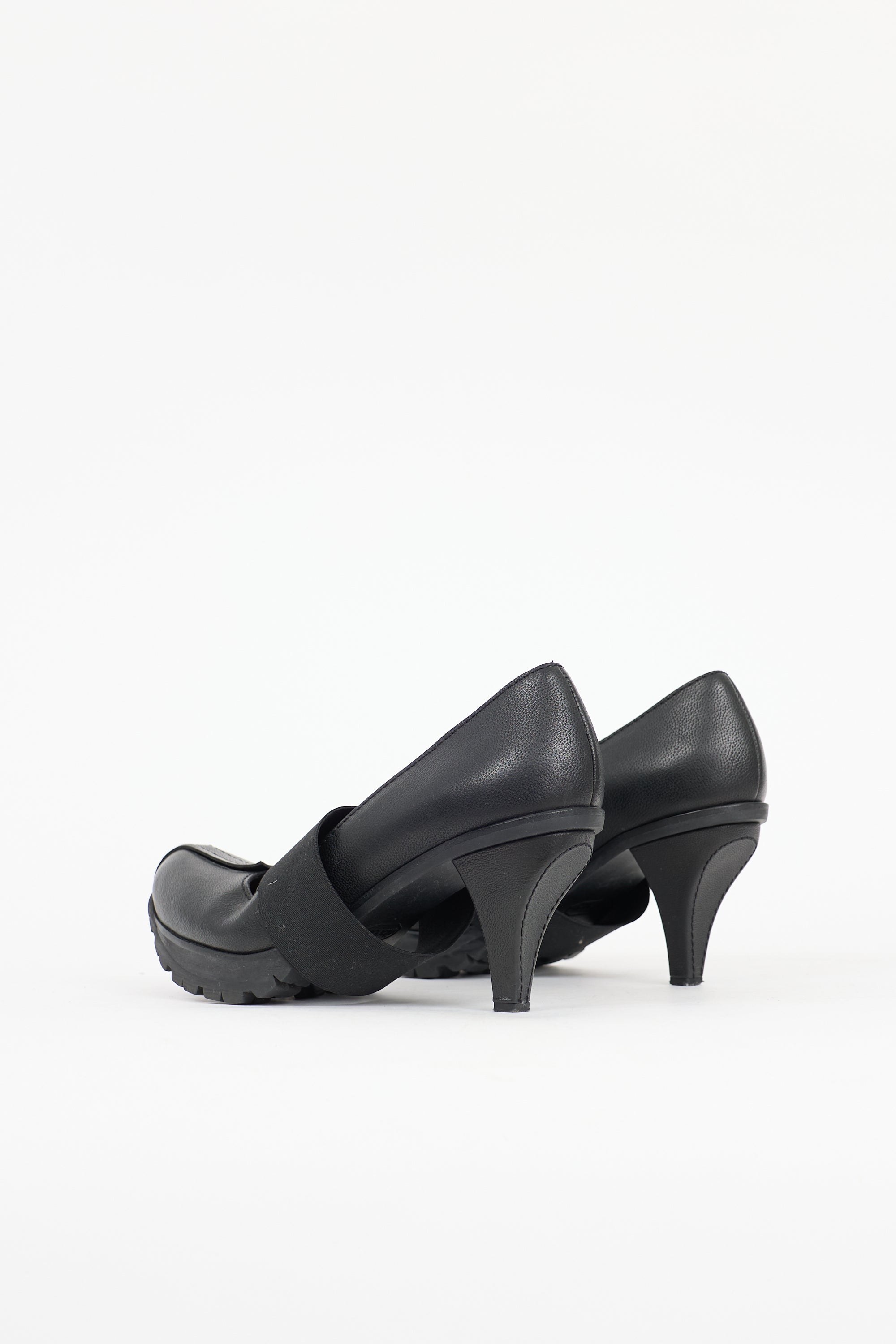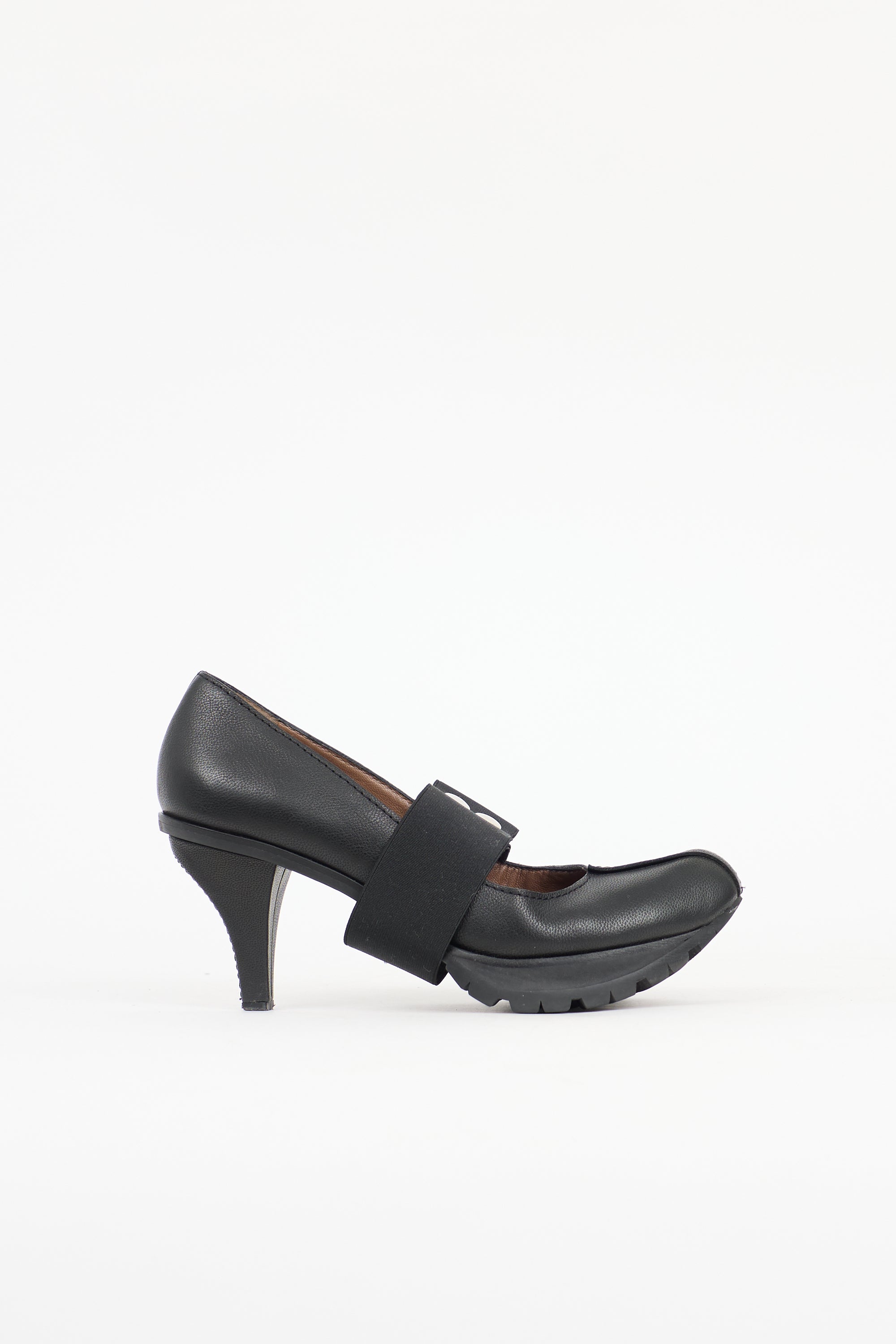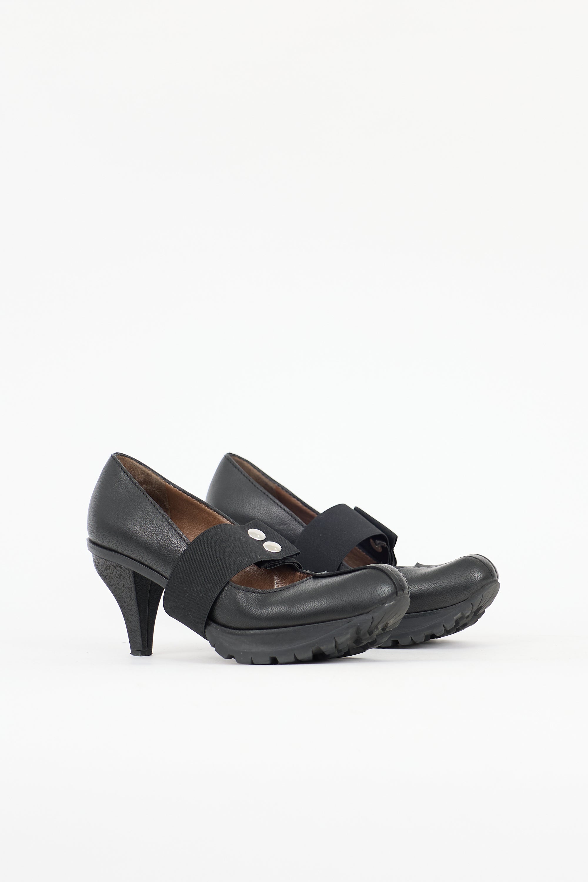 Pre-owned Marni black leather mary jane pump featuring a rounded toe, elasticized strap around vamp with snap button fastening, covered cone heel, and a treaded rubber outsole. Comes with original dust bag.