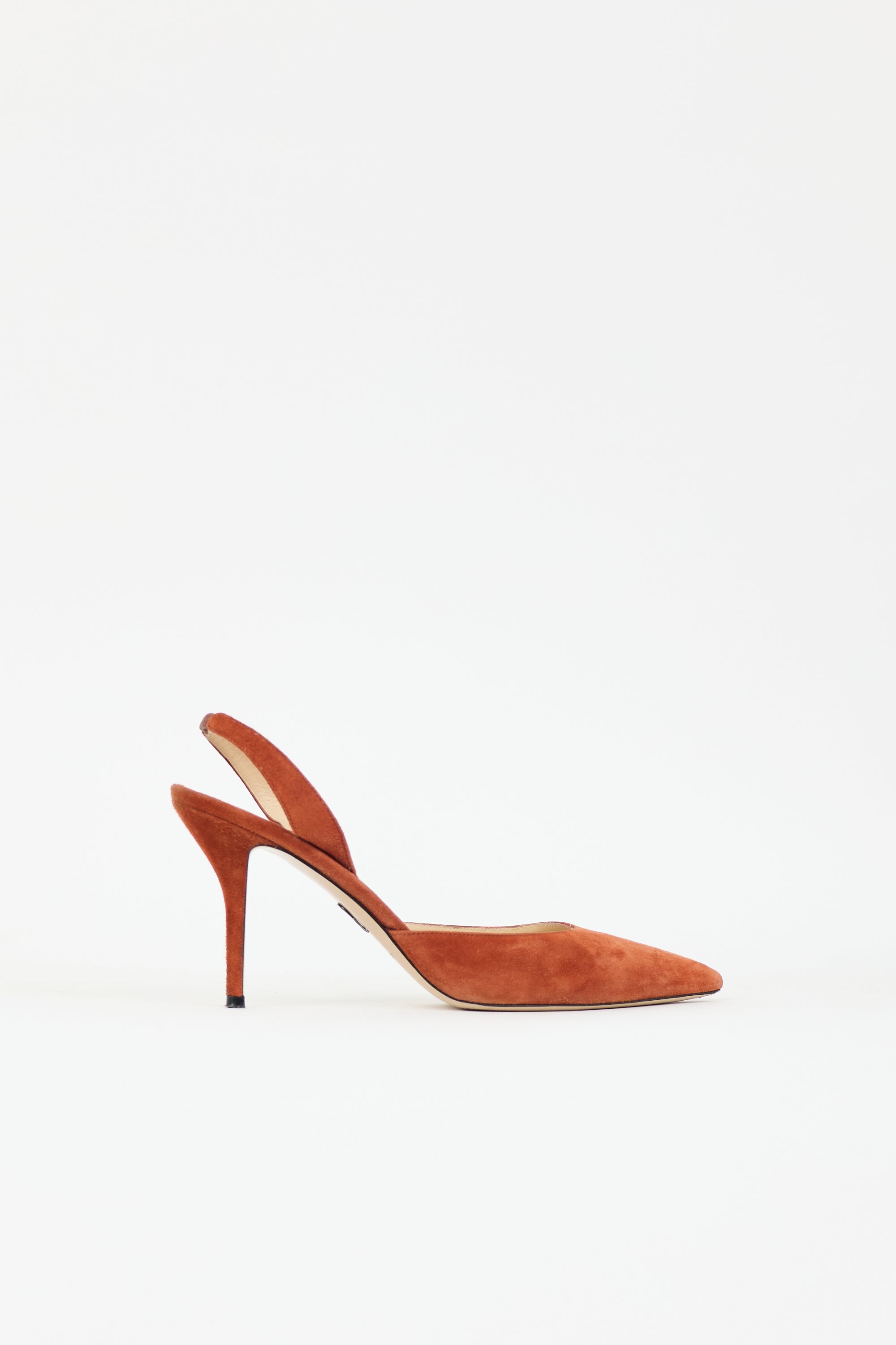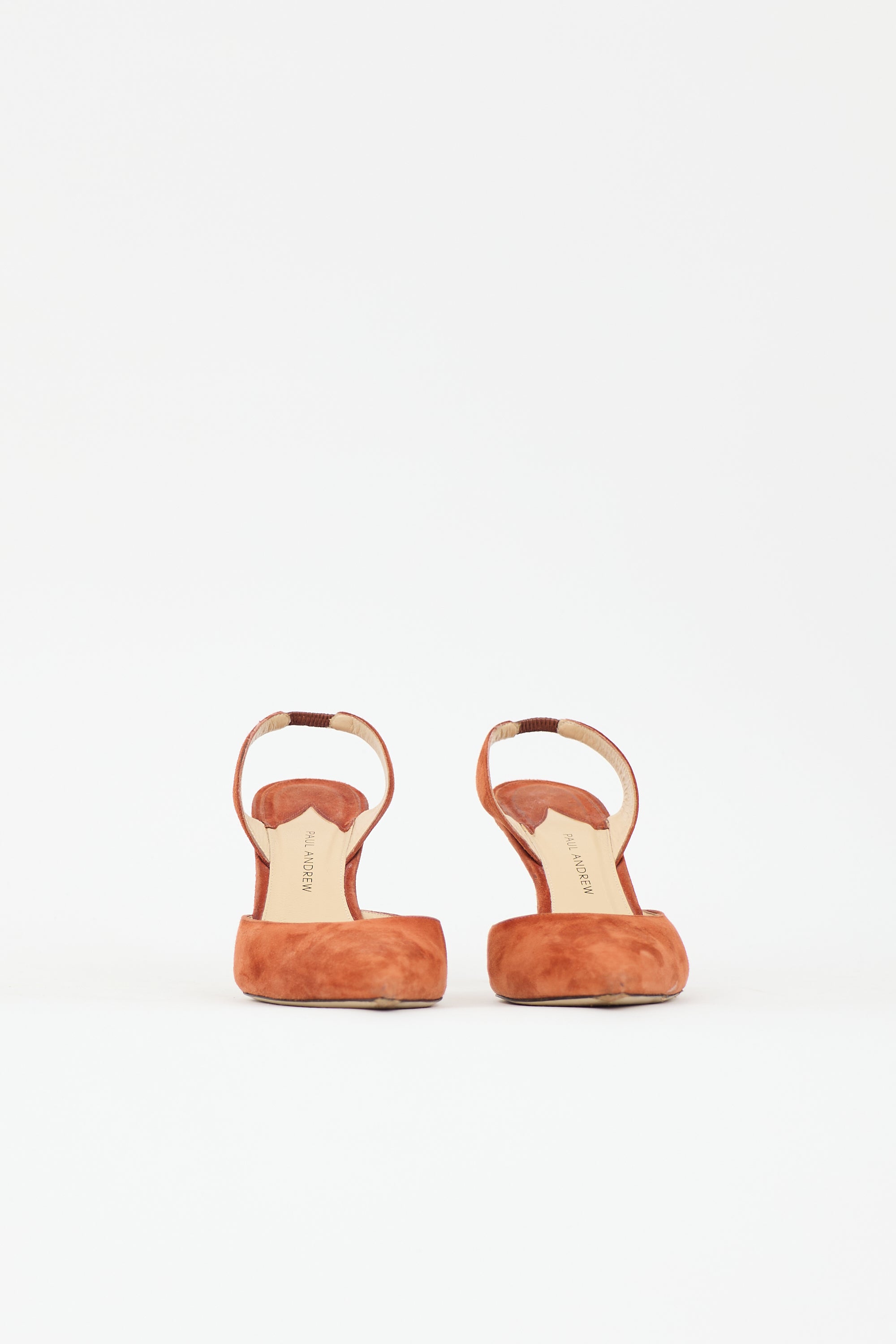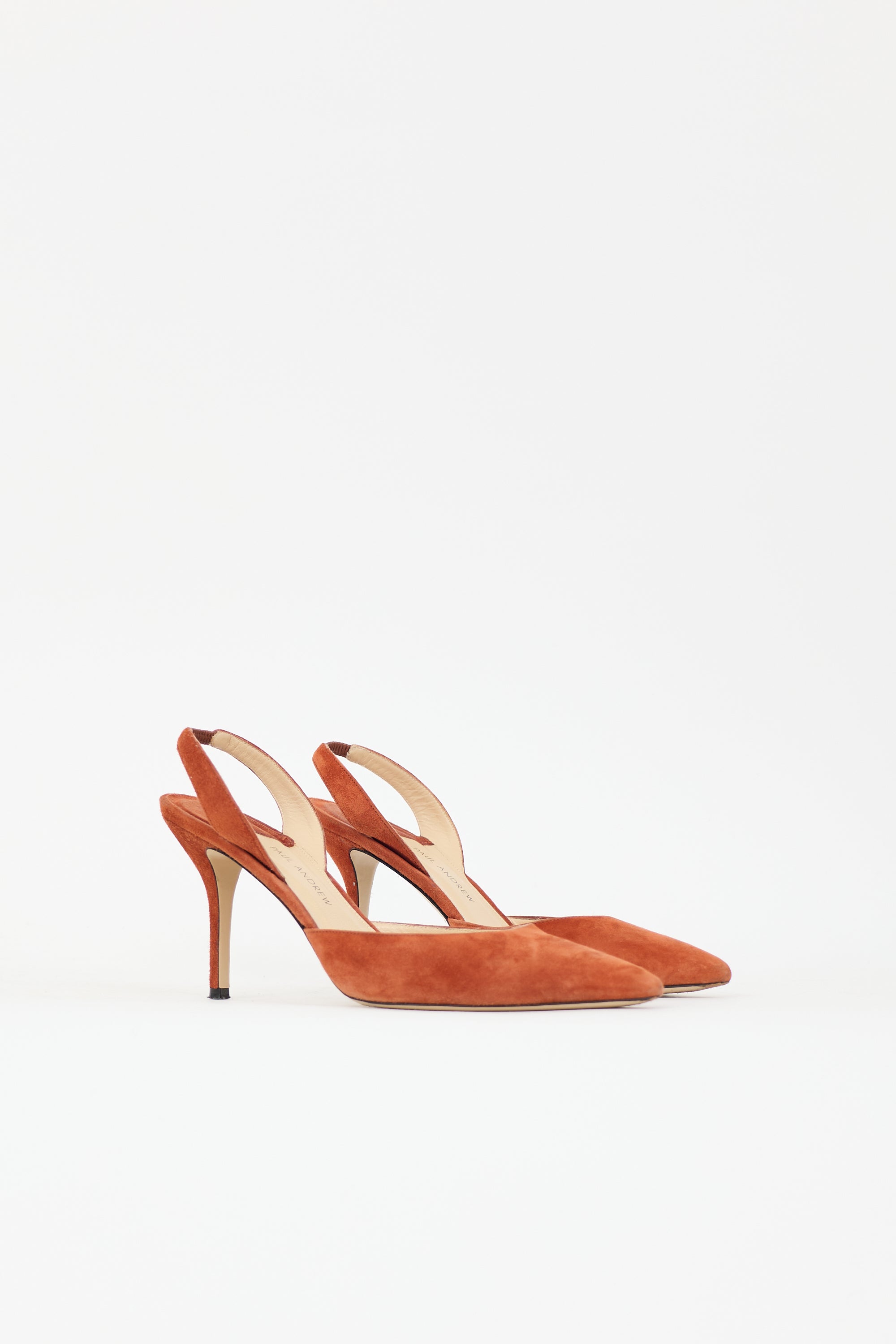 Pre-owned Paul Andrew brown suede Rhea pumps featuring pointed toe, elasticized slingback strap, and covered continental heel.