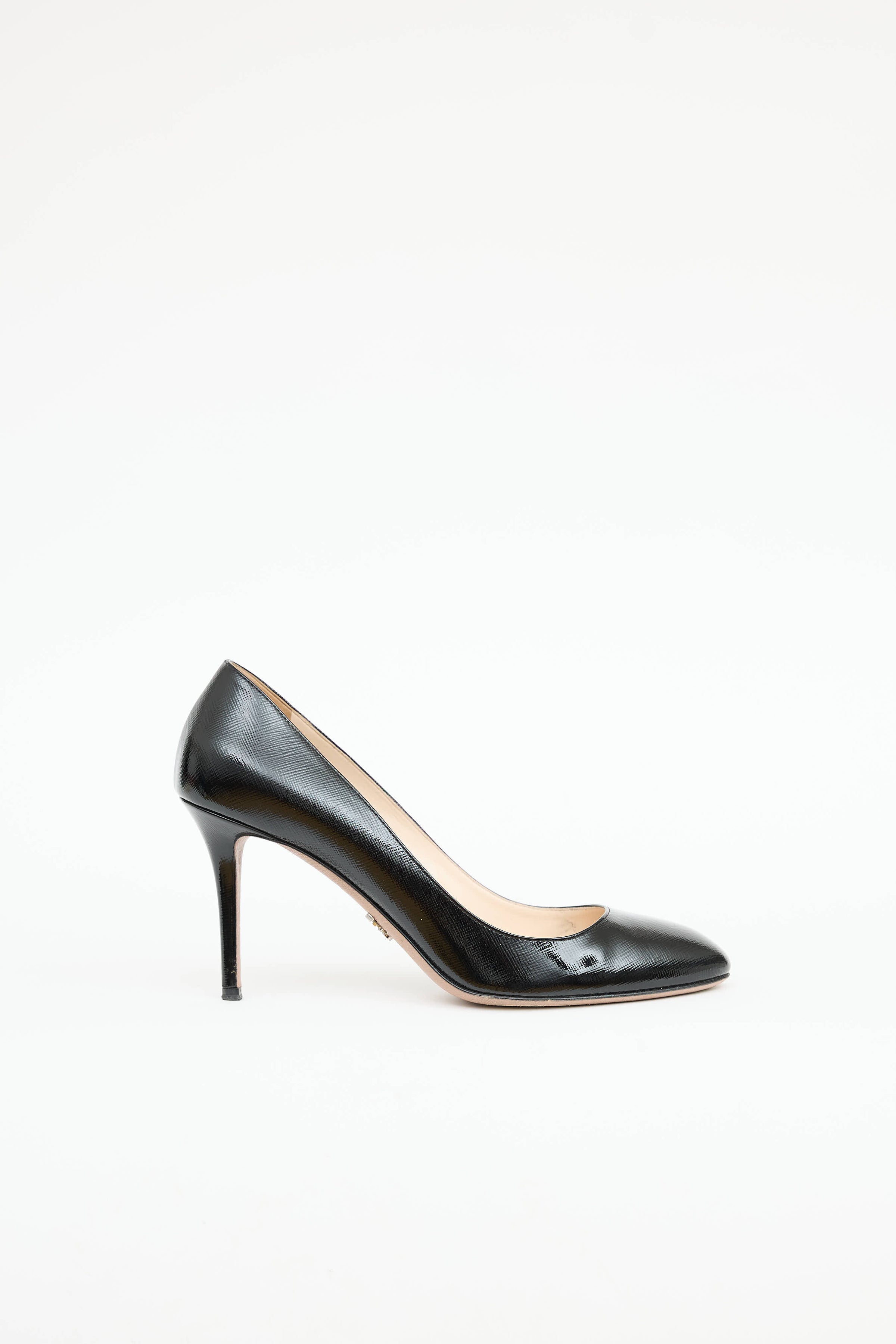 Pre-owned Prada black pump featuring round toe, Saffiano upper, and covered stiletto heel.