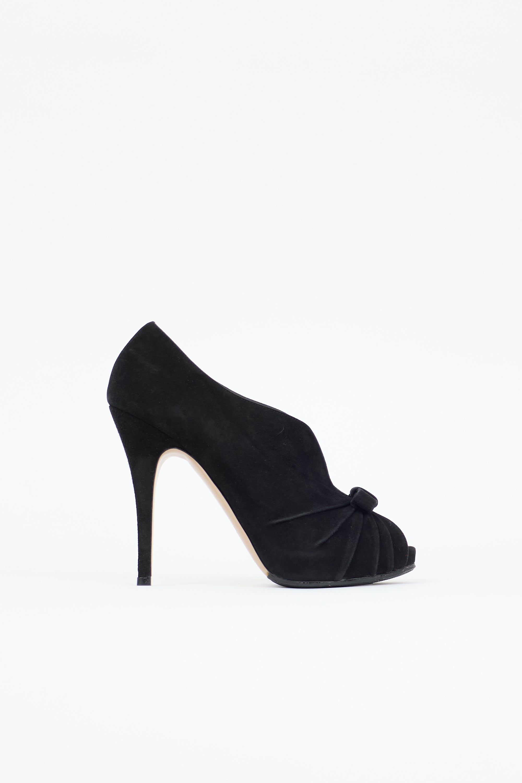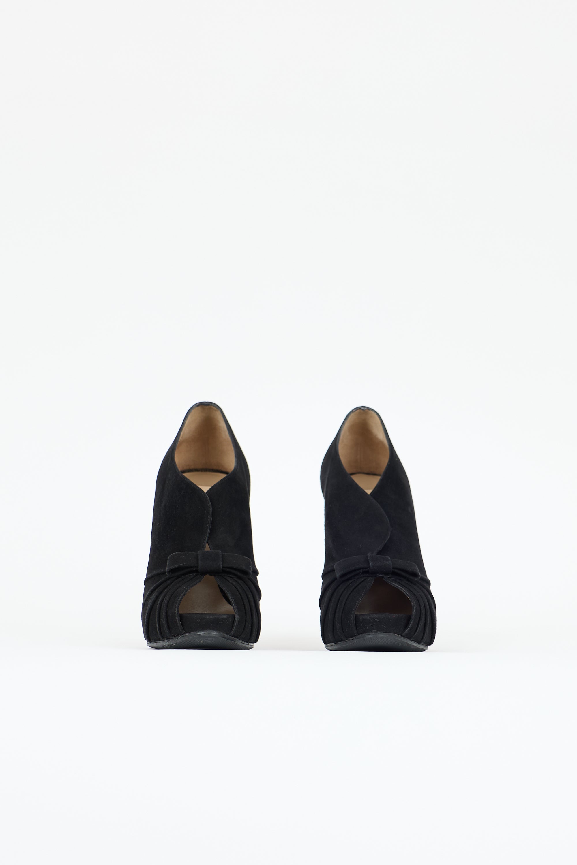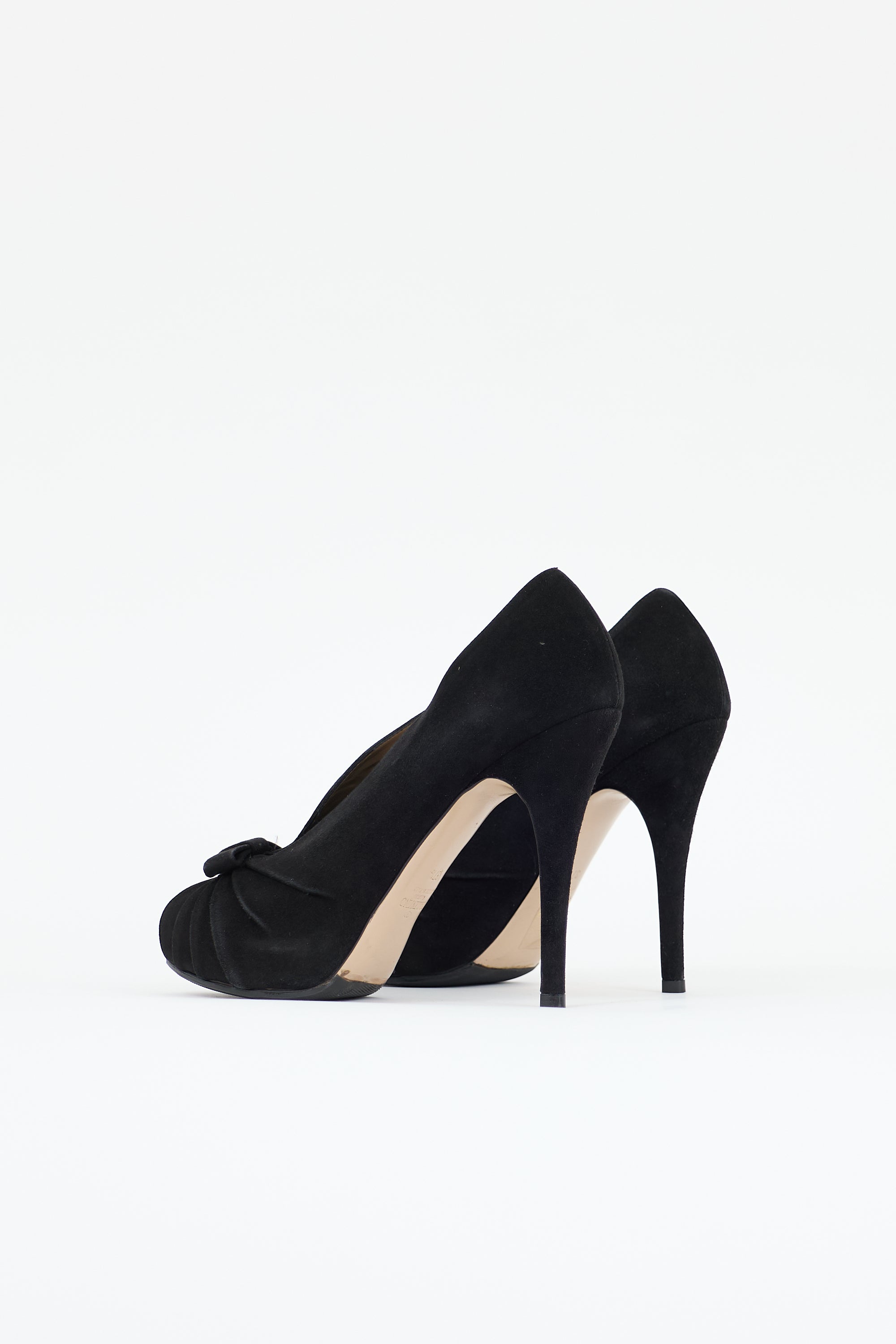 Pre-owned Valentino black suede pumps featuring an almond peep toe, ruched detail at vamp with bow, foldover panels at instep, and a covered stiletto heel and platform.