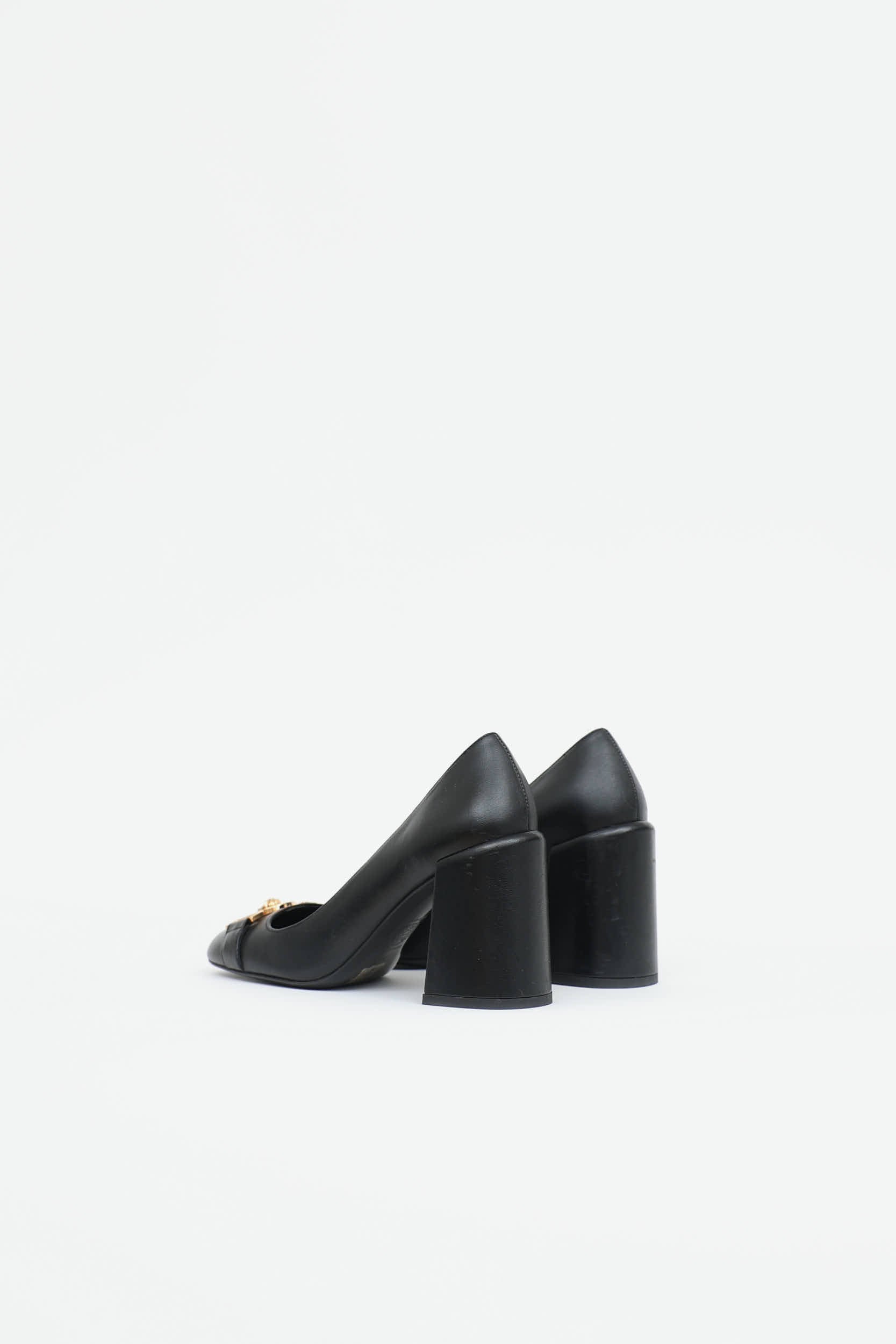 Pre-owned Versace black Medusa Insignia pumps featuring a square toe, slip on entry, leather uppers, strap at toe with signature gold toned medusa emblem, and a wrapped block heel.