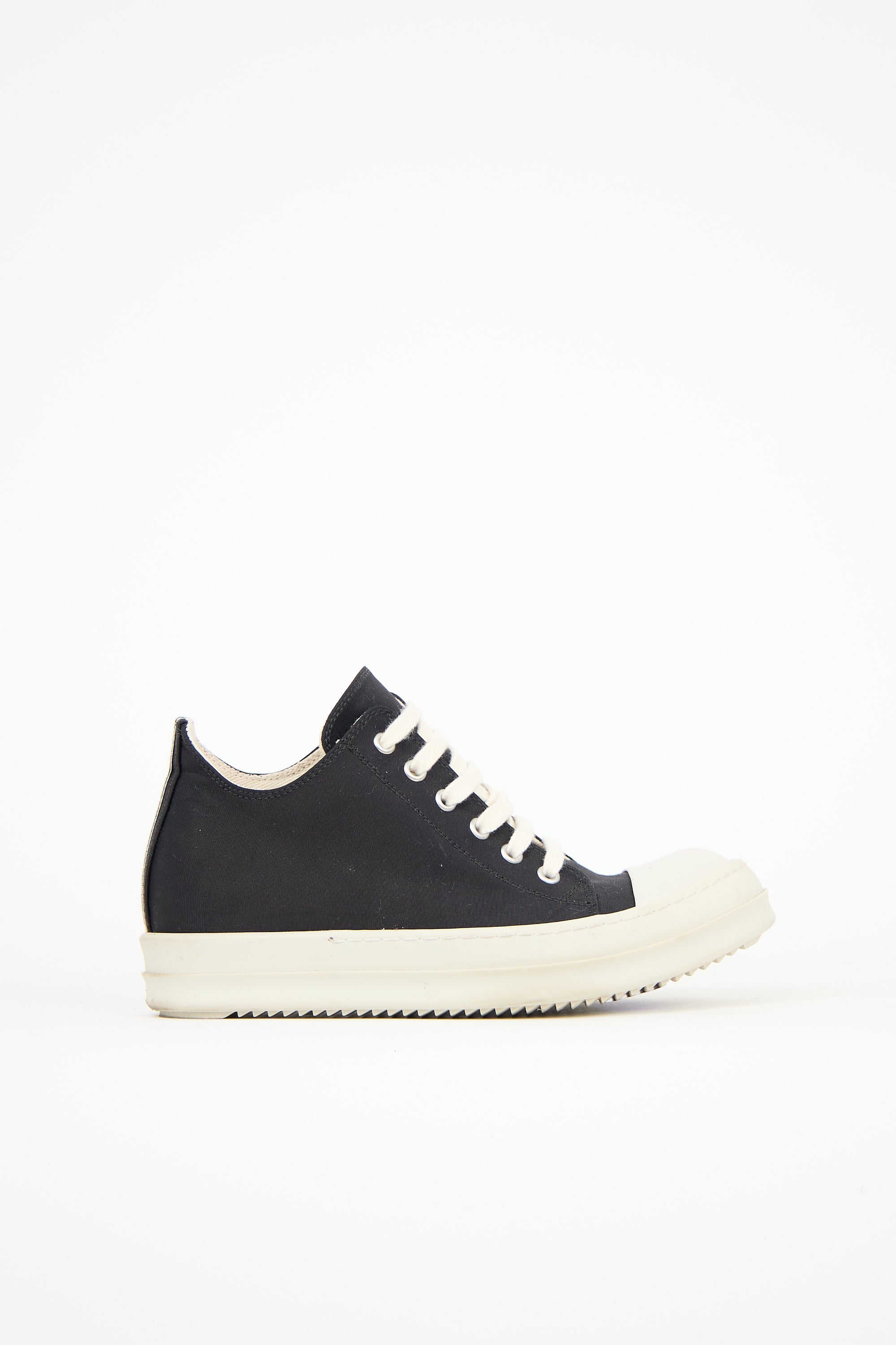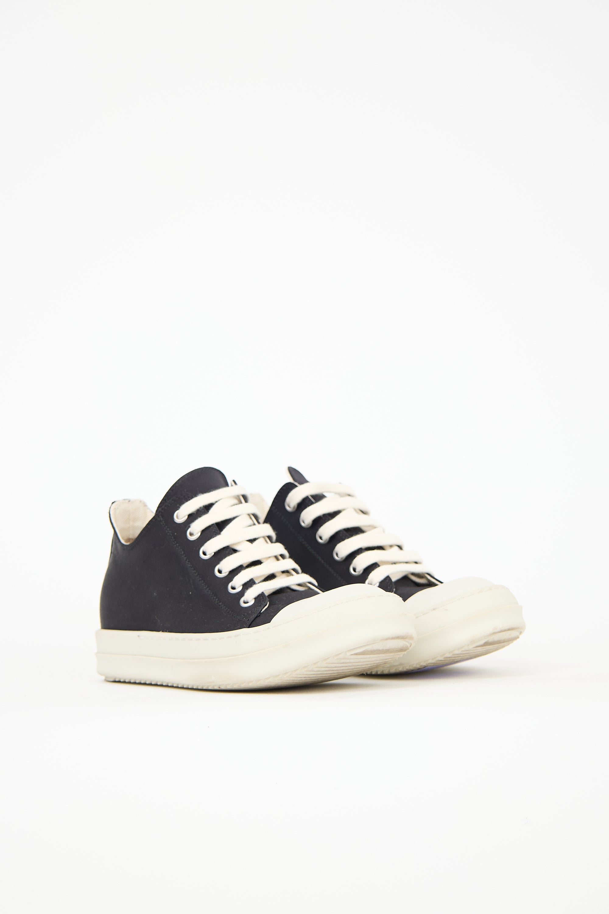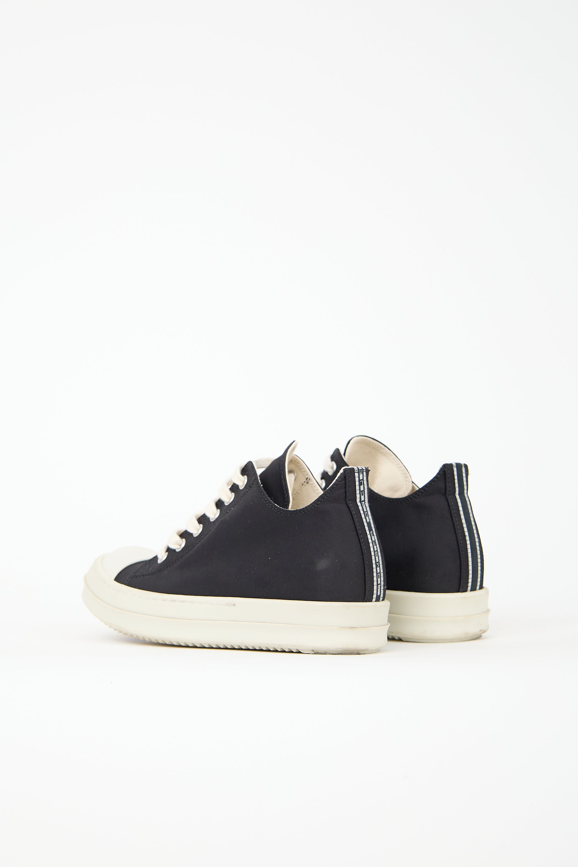 Pre-owned Rick Owens DRKSHDW black grosgrain Hollywood sneakers featuring a rounded toe, white rubber toe cap, lace up front, logo detail at counter, and rubber sole.