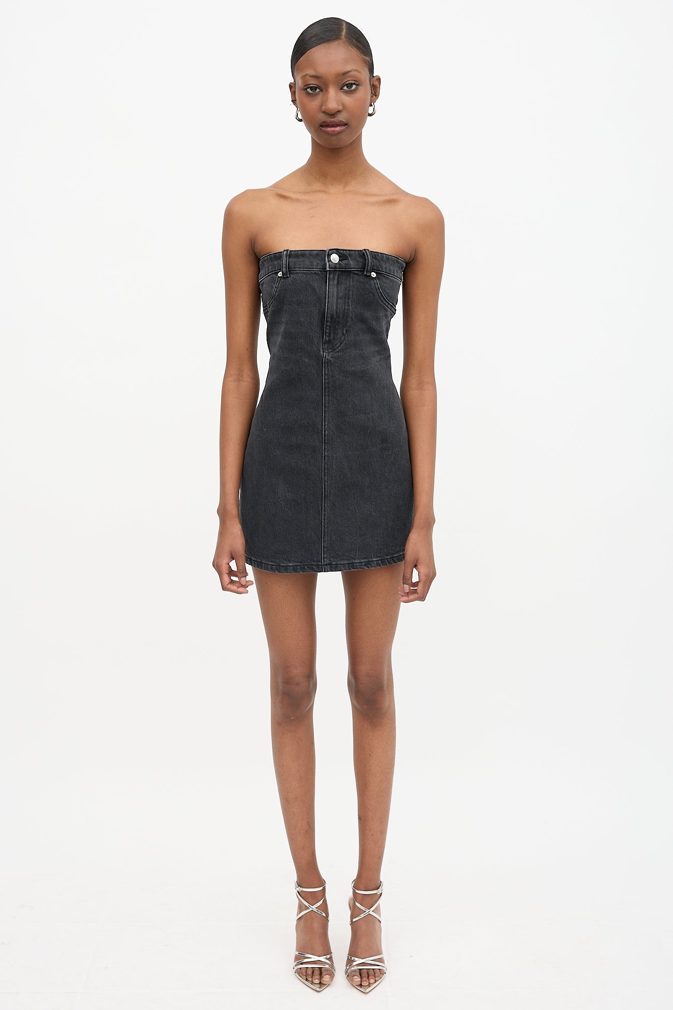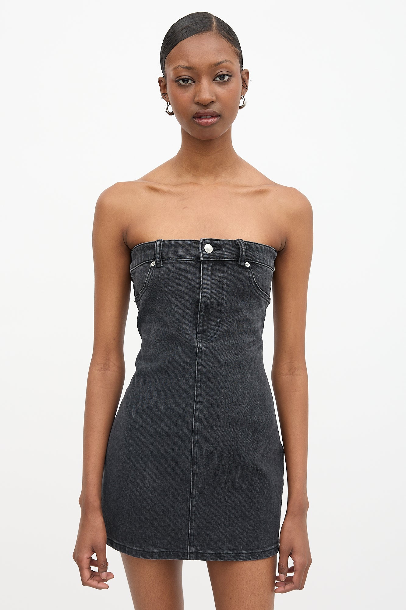 Pre-owned Alexander Wang washed black denim mini dress featuring button and zip front, brown Jacron, back patch pockets, and concealed side zip. Unlined. Clipped to fit model.