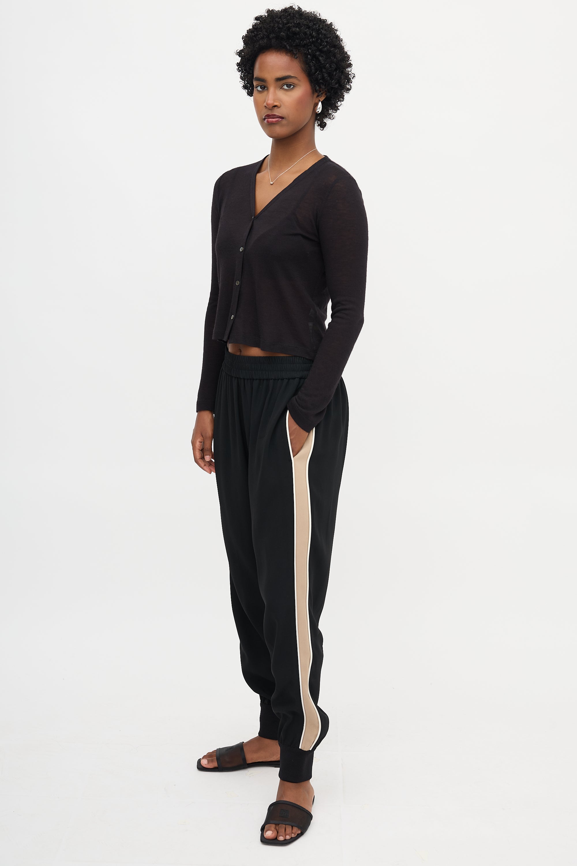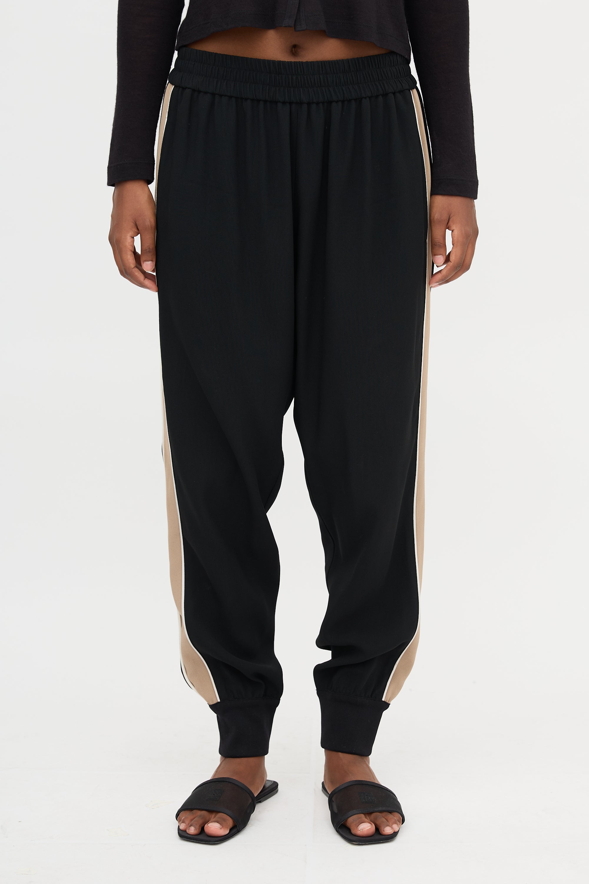 Pre-owned Moncler black Tech jogger featuring an elasticized waistband, logo loop tag at back waist, two side pockets, beige and white striped outseam, and ribbed elastic cuffs.