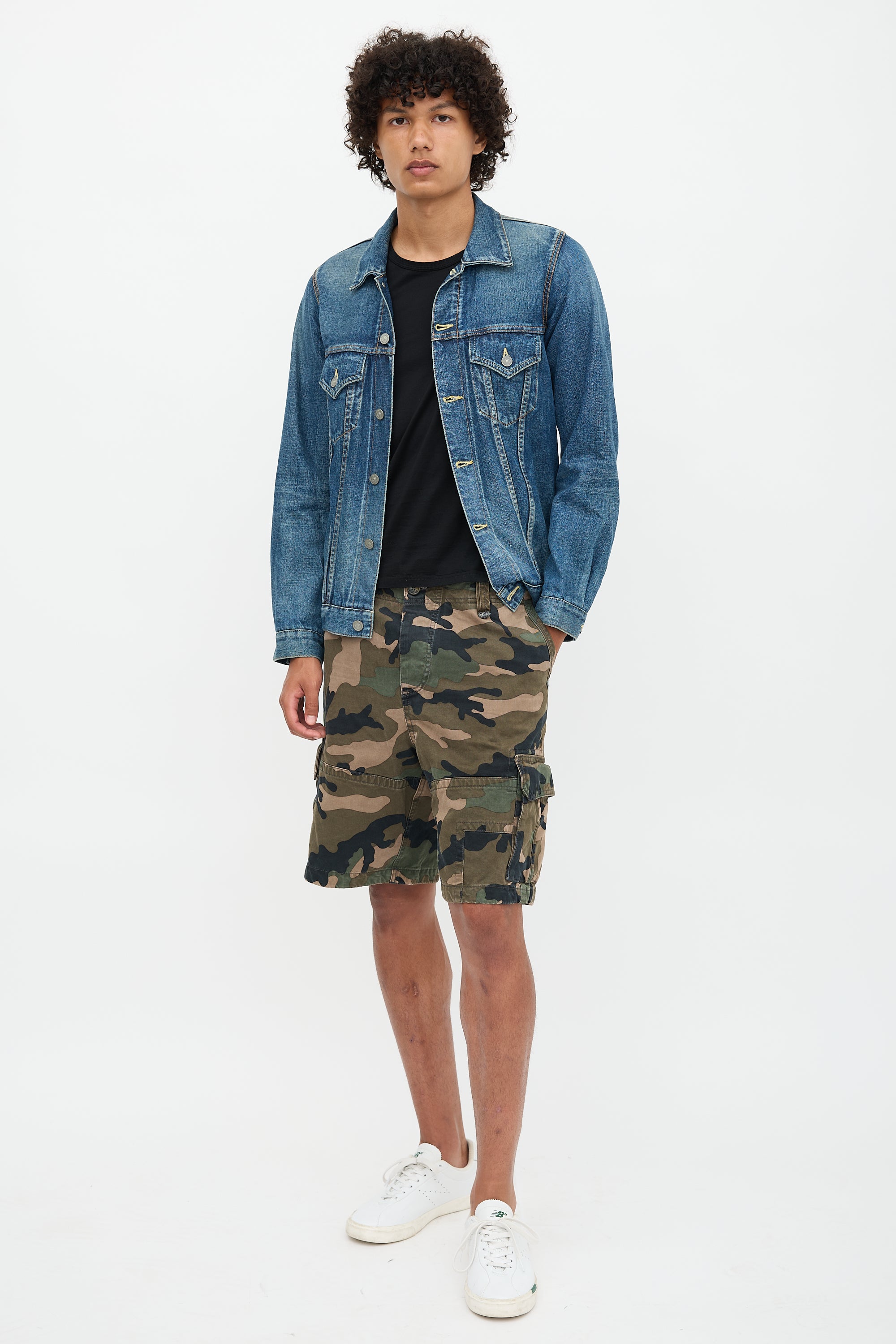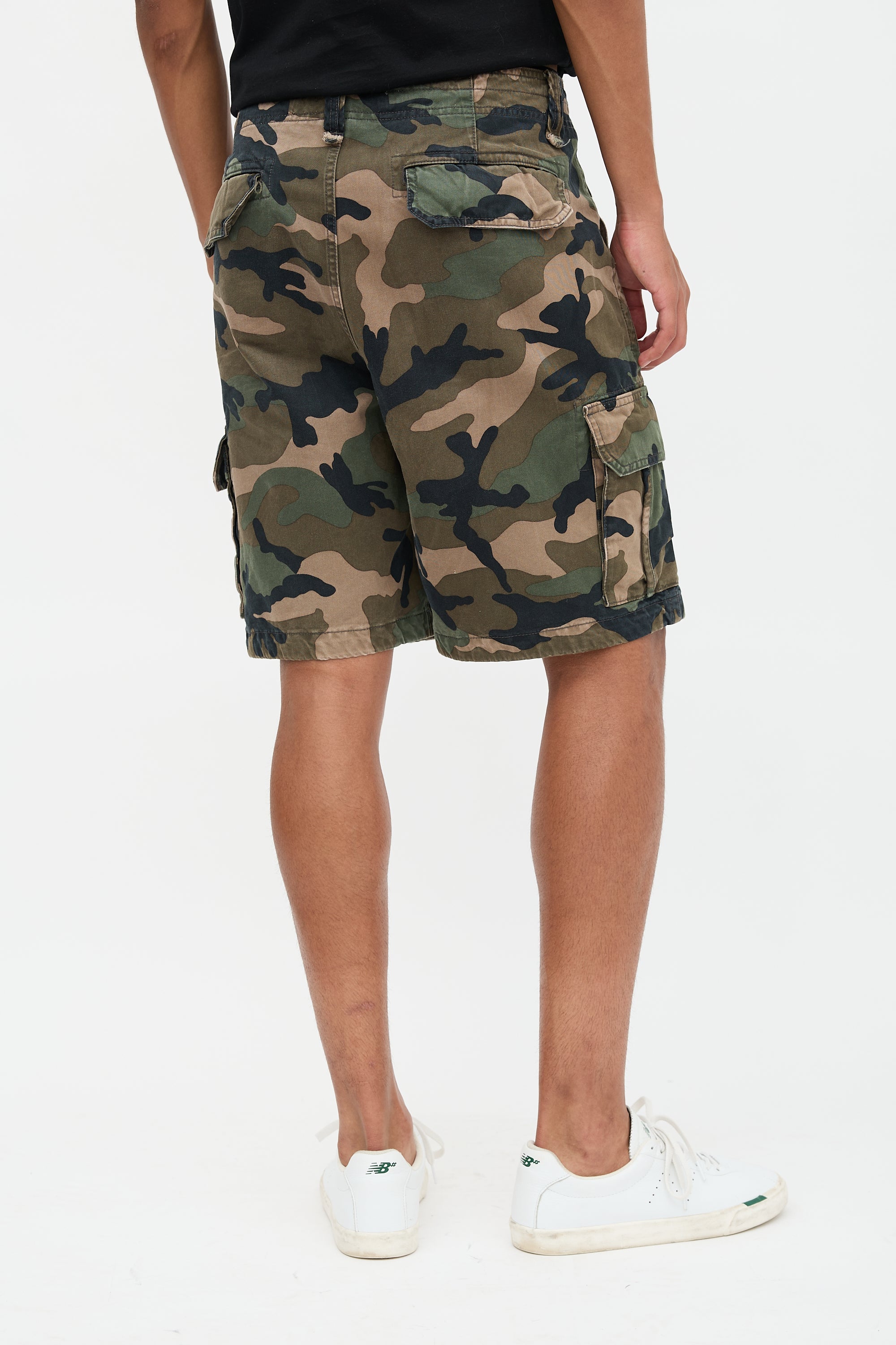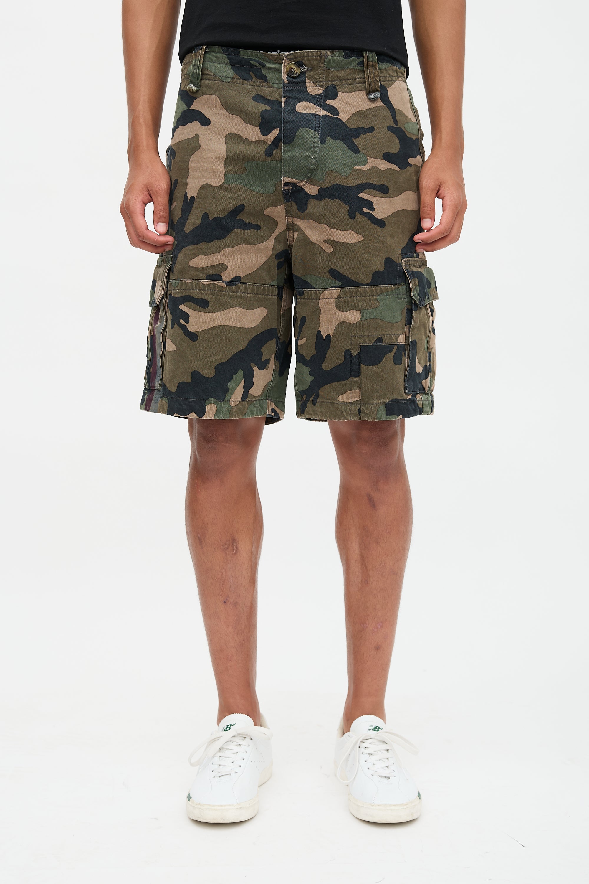 Pre-owned Valentino green camouflage Bermuda shorts featuring interior waist drawstring, four pocket styling, two cargo pockets at sides, stripe detail at right cargo pocket, and button fly.