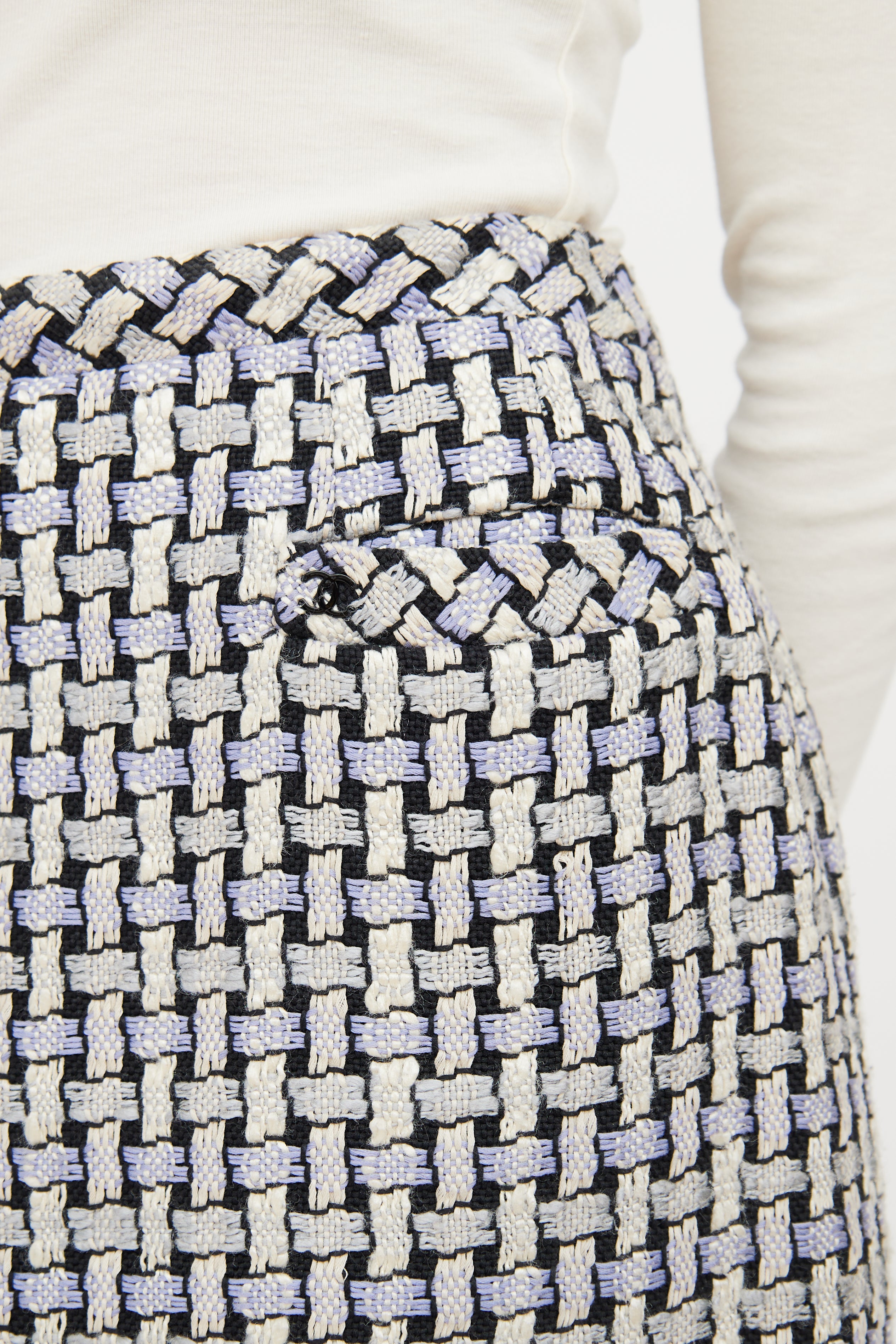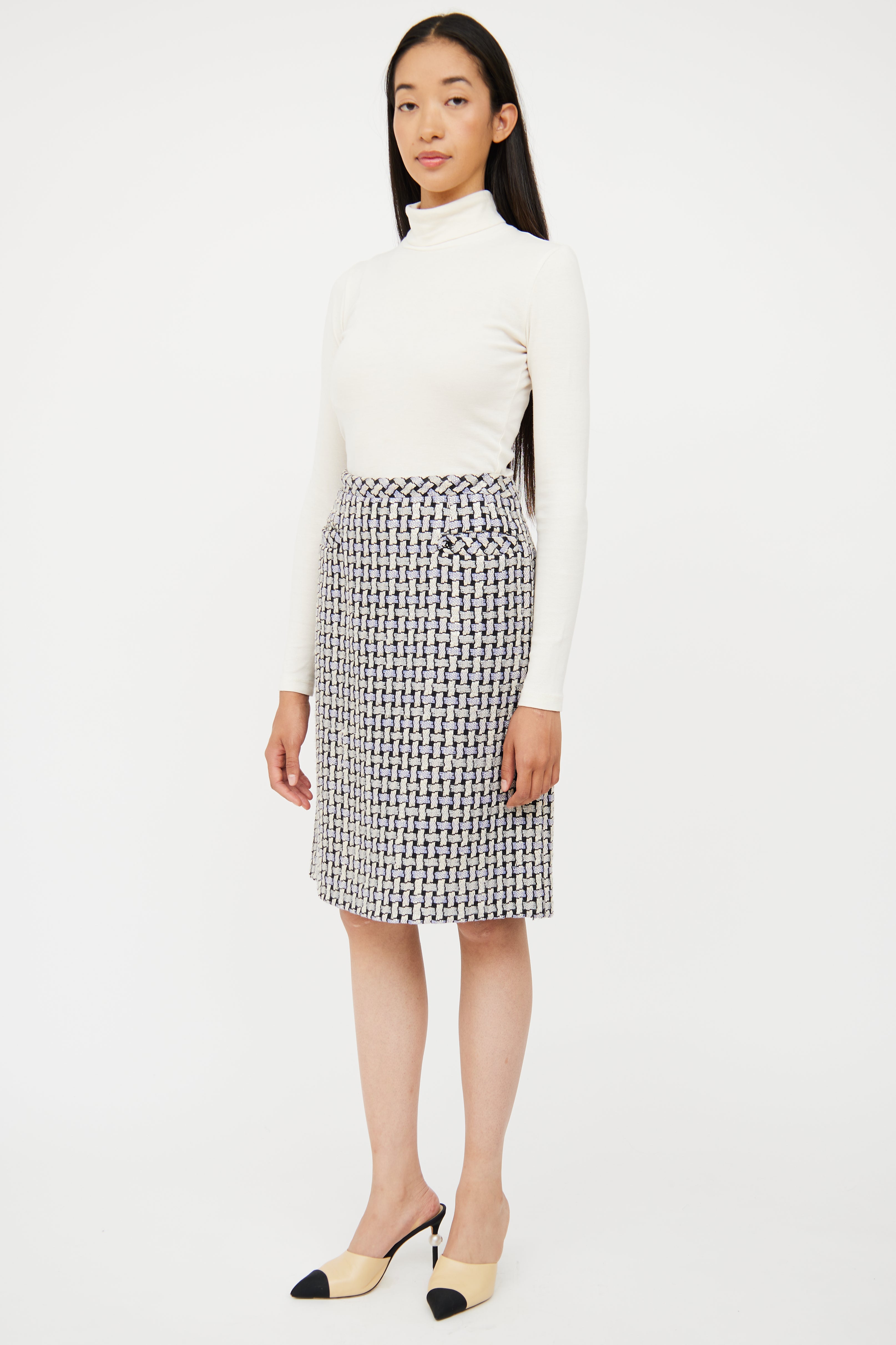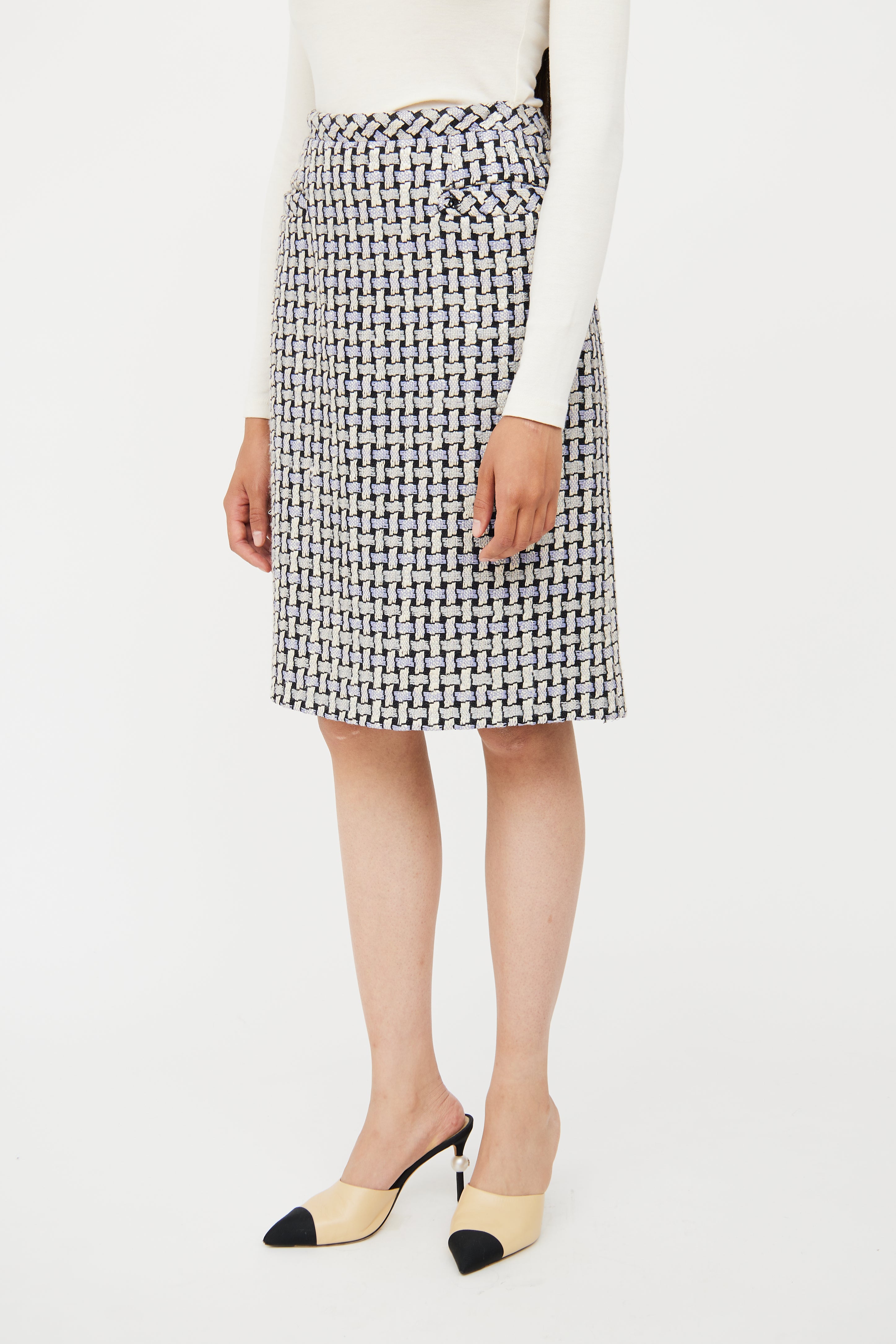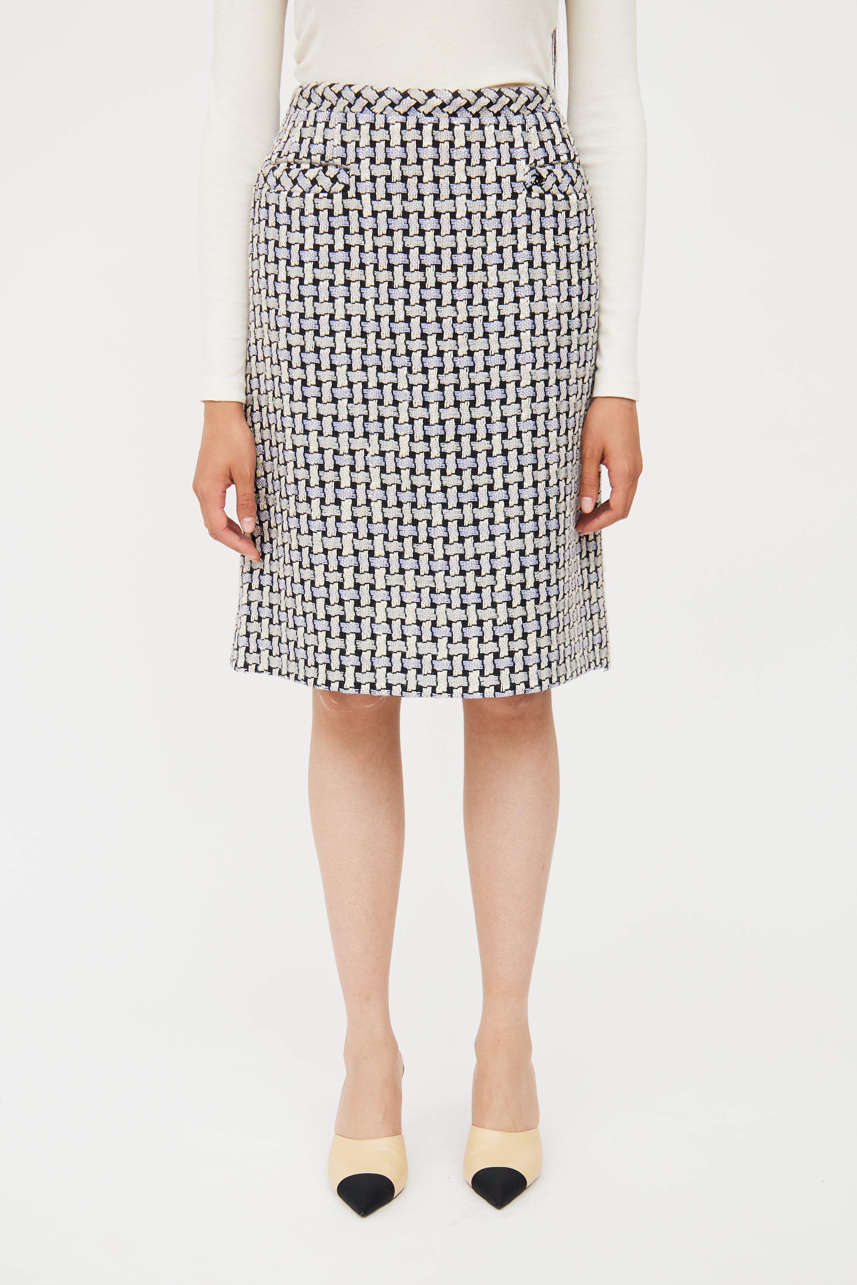 Pre-owned Chanel blue and white Spring 2005 tweed skirt featuring dual slip pockets on front hip with black lacquer CC hardware on left pocket, mid length and zip entry back. Fully lined.