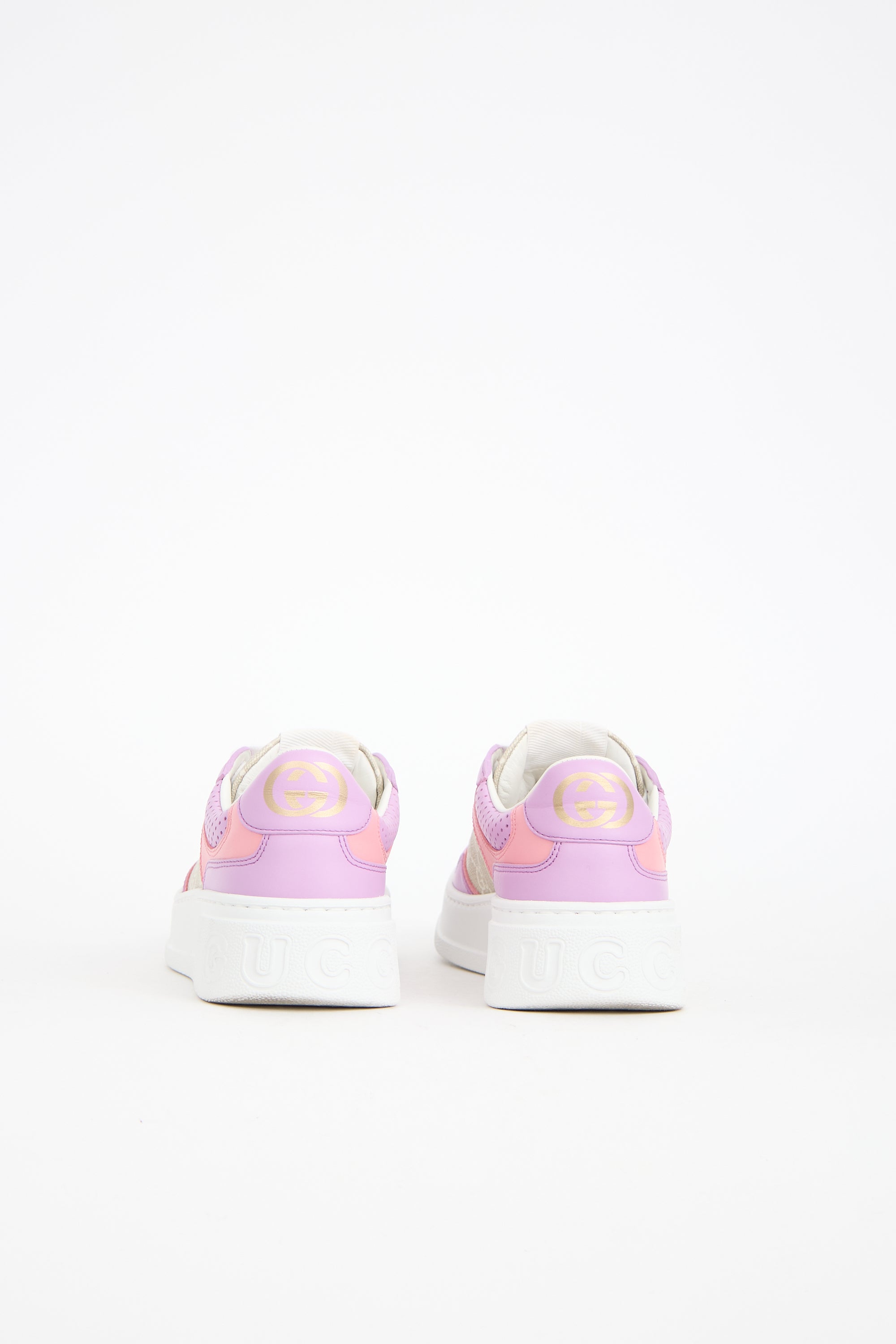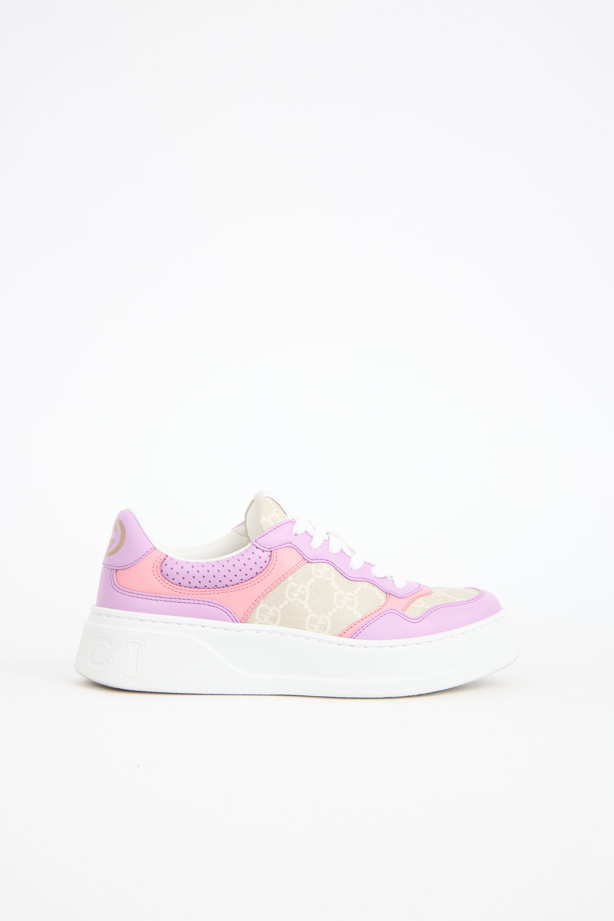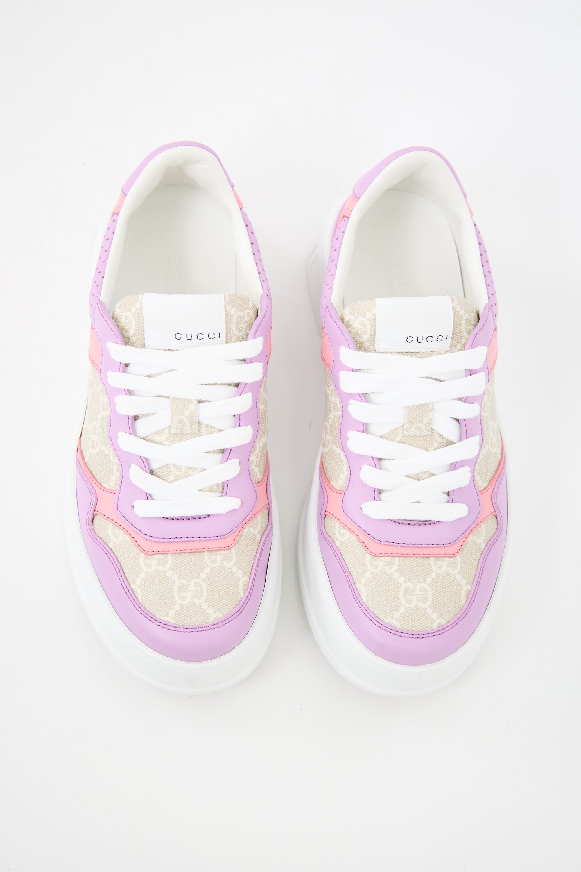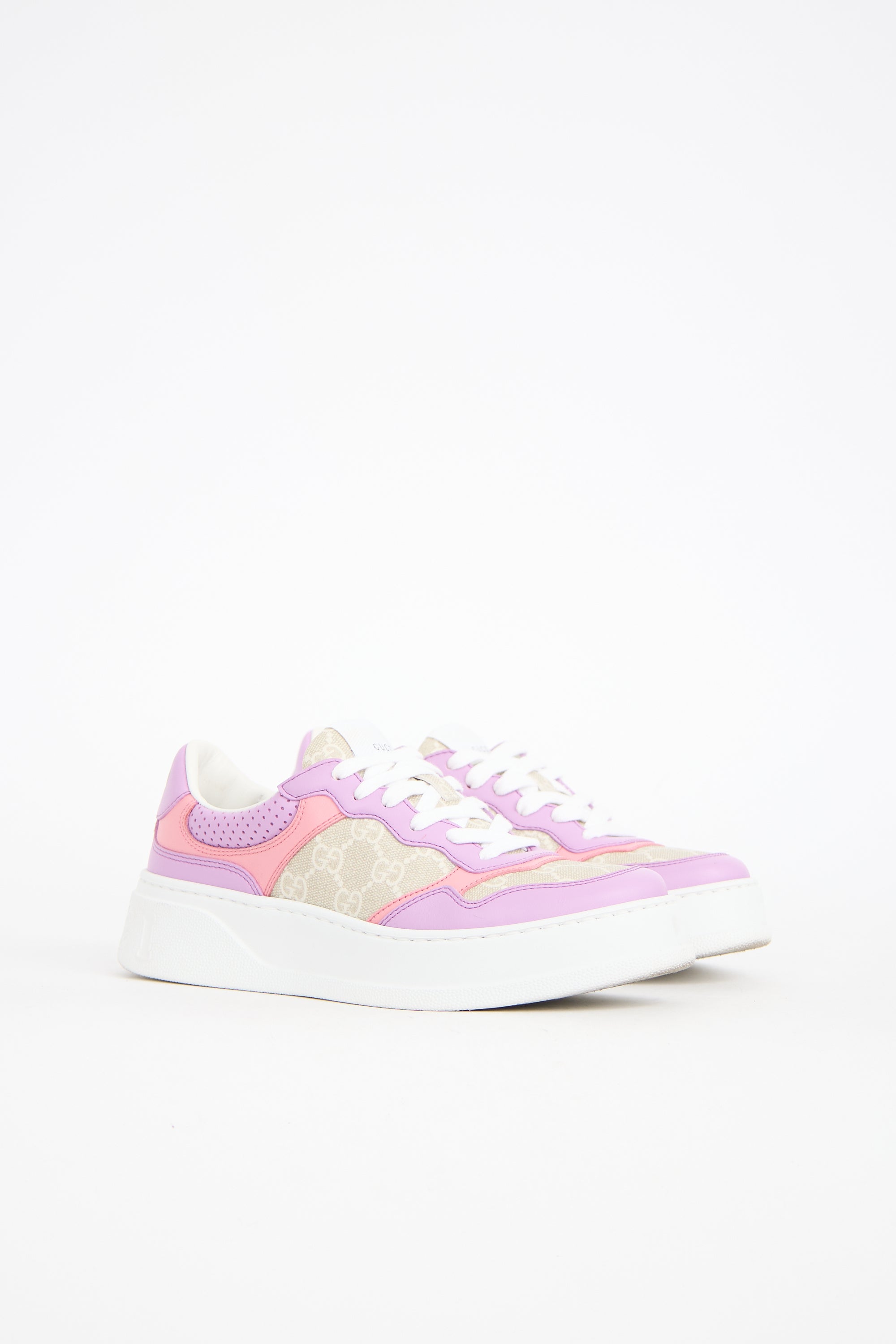Pre-owned Gucci beige, purple, and pink sneakers featuring GG Supreme coated canvas, leather panelling, lace up instep, label at tongue, printed logo at counter, and white rubber sole with debossed logo at heel. Comes with original dust bags.