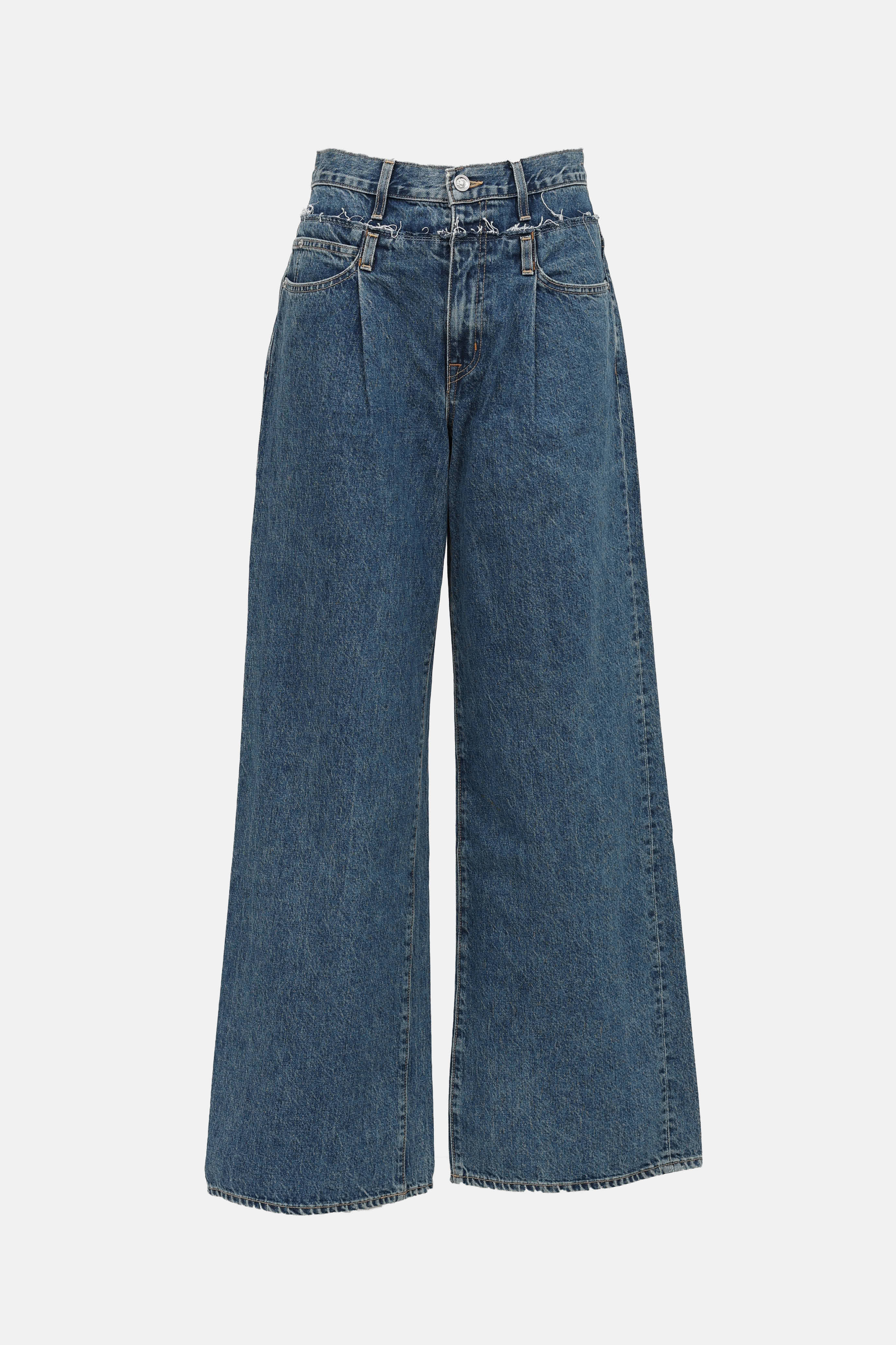 Pre-owned SLVRLAKE medium wash Re-work Eva X Taylor jeans featuring double waistband with pleats, belt loops, five pocket styling, contrast stitching, and wide leg.